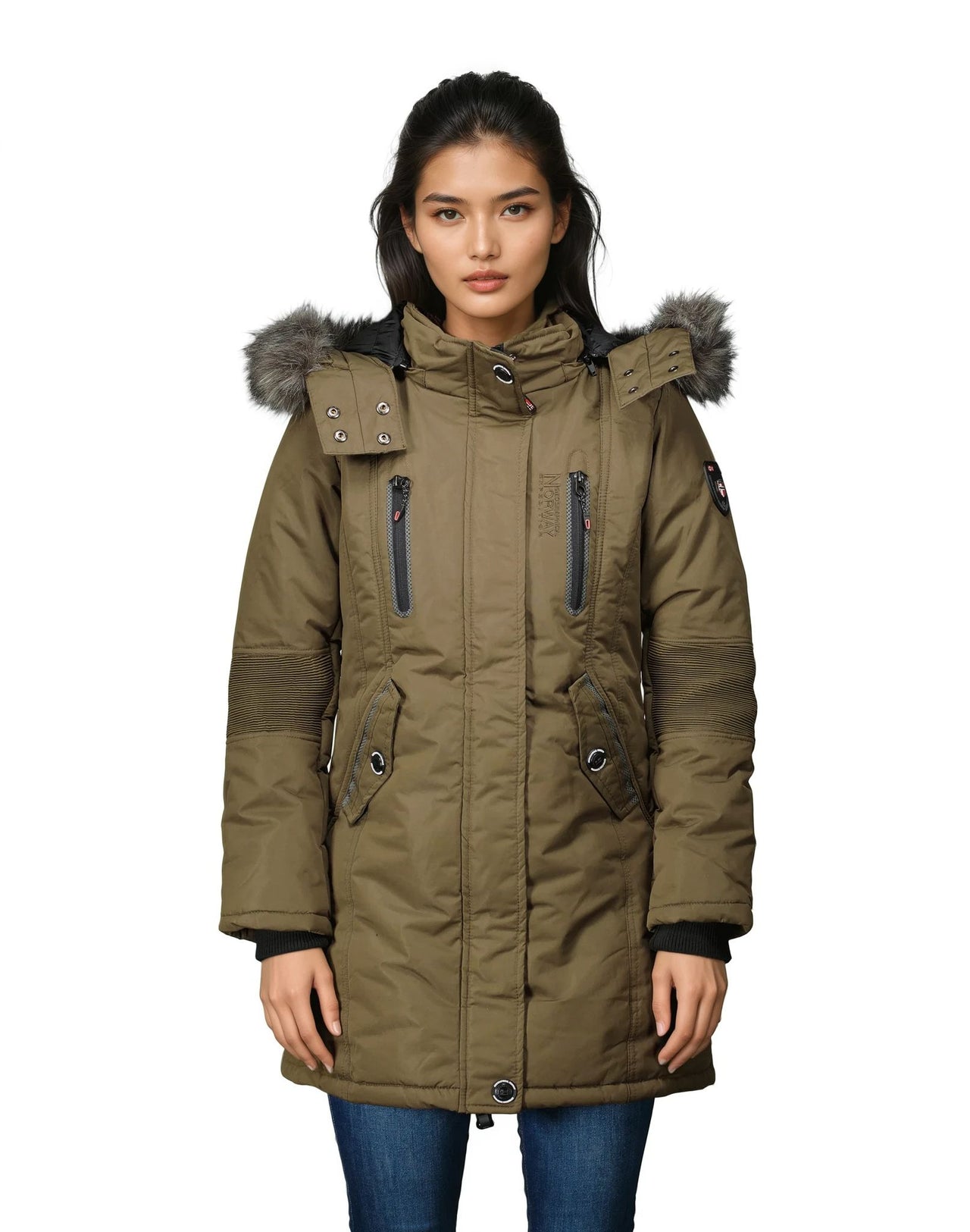 Découvrez la parka "CORALY" de Geographical Norway pour femme, une pièce polyvalente et élégante. Sa capuche détachable avec fausse fourrure synthétique, sa double ouverture zippée et boutonnée sur le devant, ses diverses poches avec snaps, sa broderie sur la poitrine et son badge en PVC sur la manche ajoutent une touche de style et de fonctionnalité à cette parka.