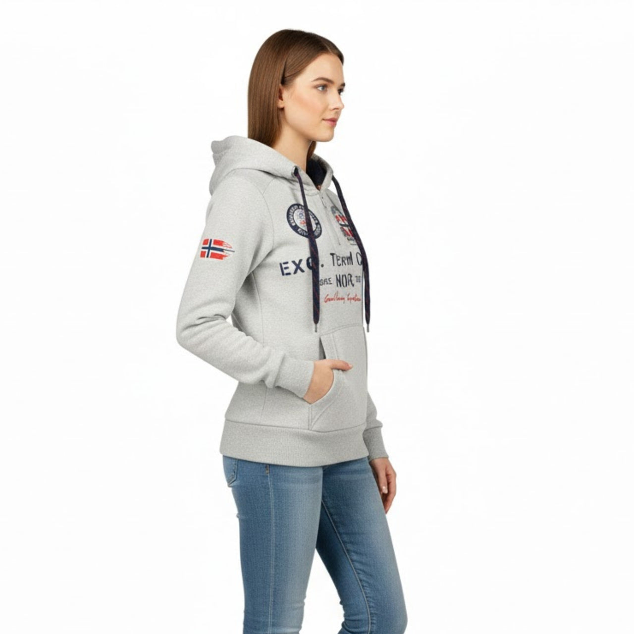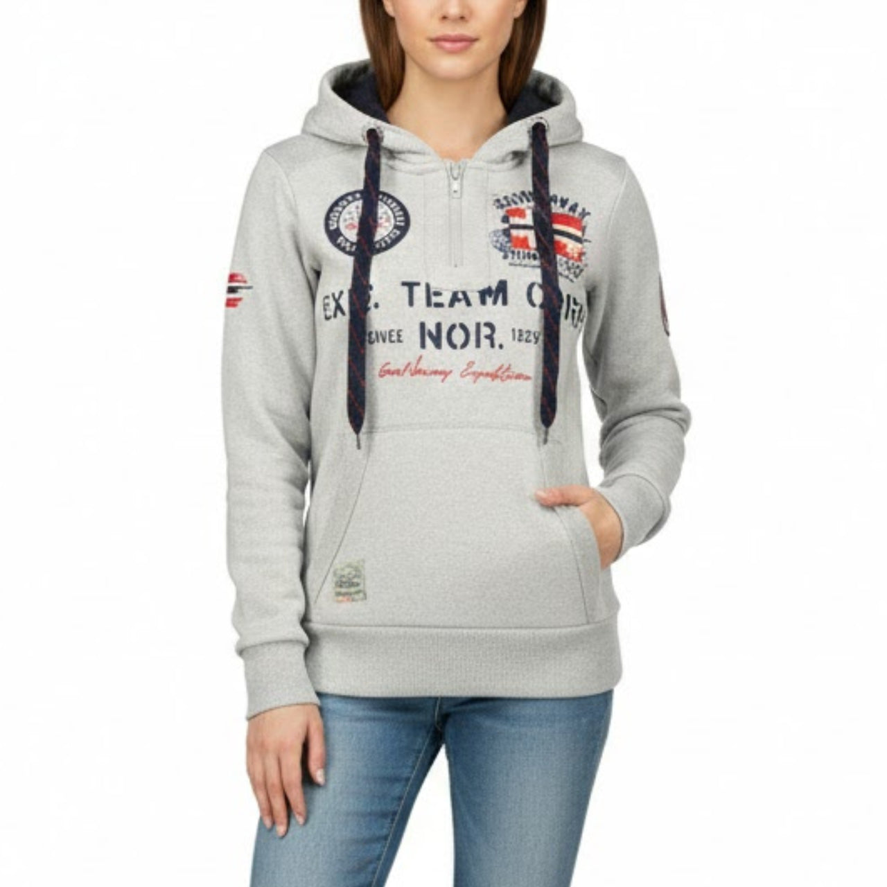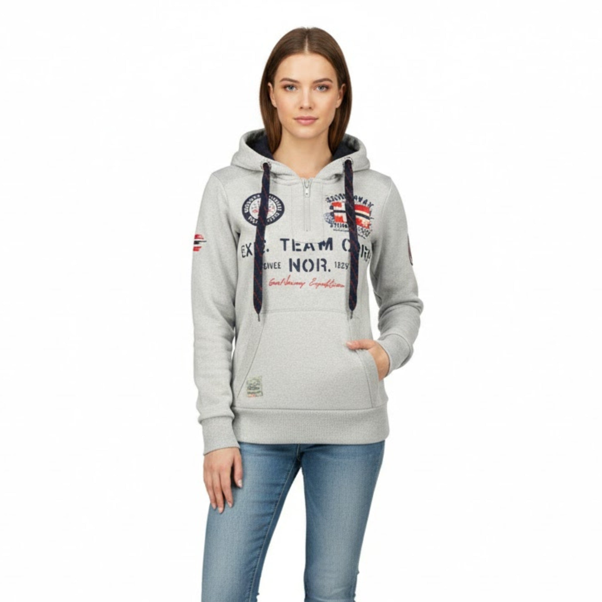 Découvrez le sweat passe-tête "Goptaine" de Geographical Norway pour femmes. Ce sweat pour femme est conçu avec un passe-tête et une capuche. Il arbore un drapeau sur le bras, des poches kangourou, des impressions distinctives sur le devant avec un drapeau et un badge, ainsi qu'un lien de resserage.