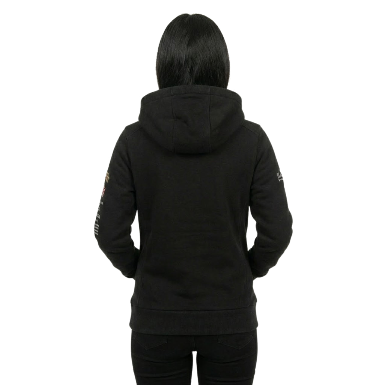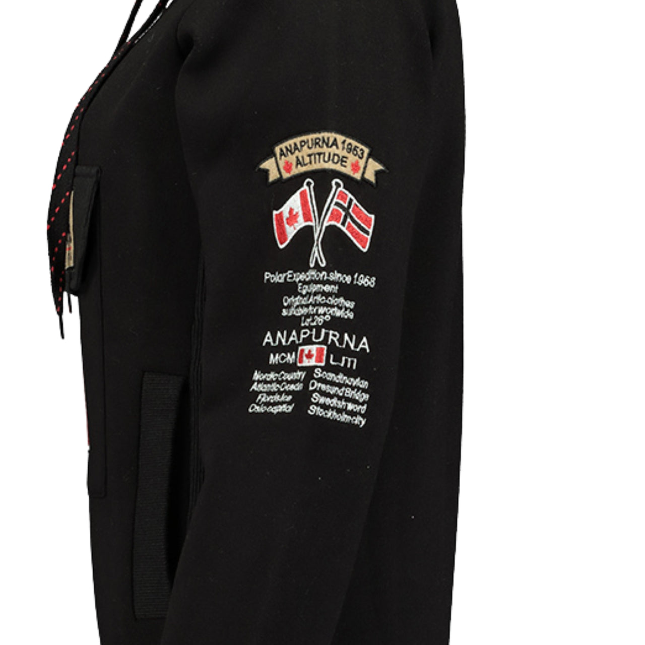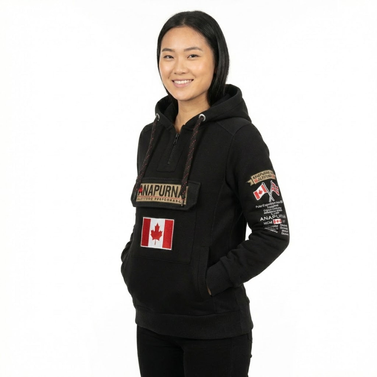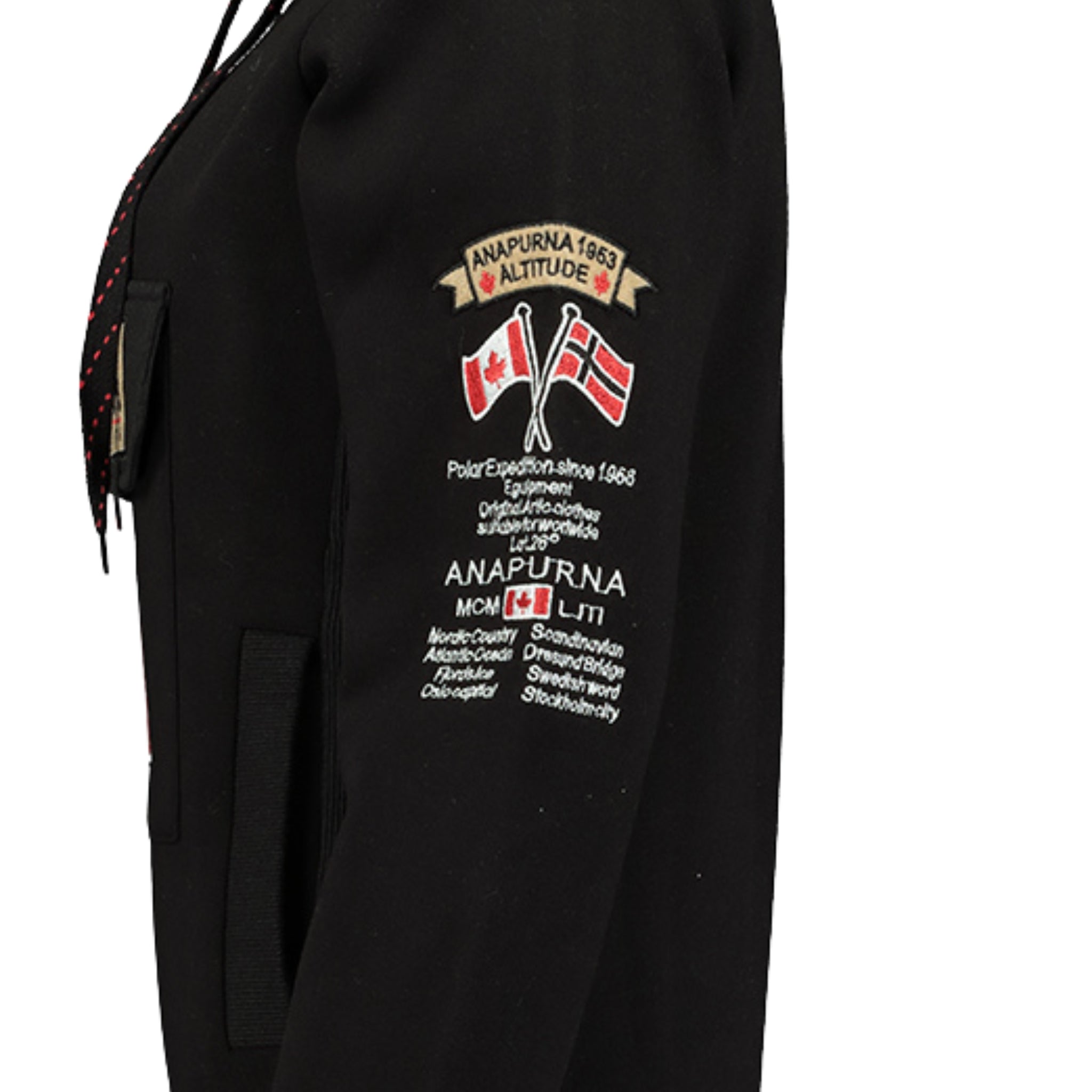 Le sweat "Gymana" pour femme de la marque Anapurna est un modèle confortable, féminin et riche en détails. Confectionné dans un mélange doux de coton et polyester, il vous garde bien au chaud tout en offrant un look soigné. Ce sweat est équipé d’une capuche avec lien de serrage, d’un col zippé et de poignets côtelés en molleton. Il se distingue par une poche plaquée brodée sur la poitrine, une poche kangourou à l’avant, et des broderies élégantes sur les manches. Une pièce idéale pour conjuguer style et confort au quotidien.
