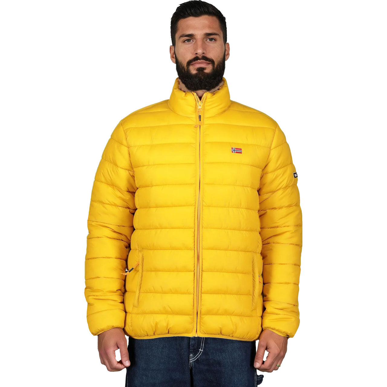 Découvrez le blouson matelassé 'AMIGOLOR Basic' de Geographical Norway pour hommes. Ce blouson avec fermeture zippée centrale arbore un drapeau sur la poitrine, des poches latérales pratiques et un badge distinctif sur la manche, alliant confort et style pour toutes vos aventures.