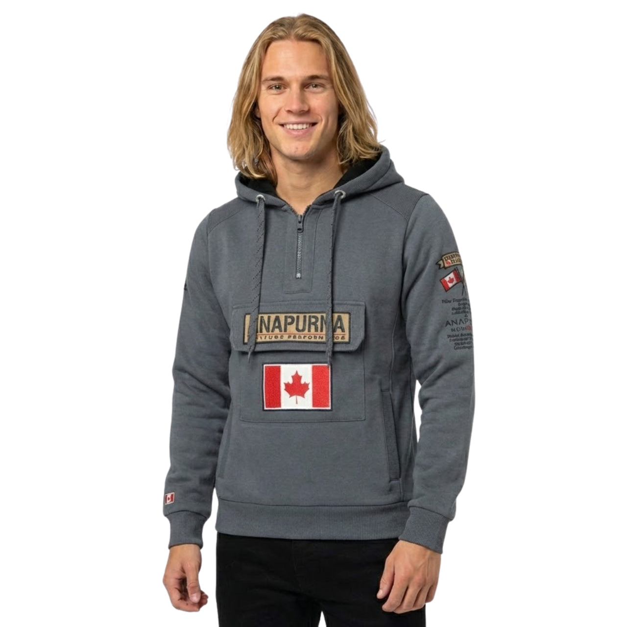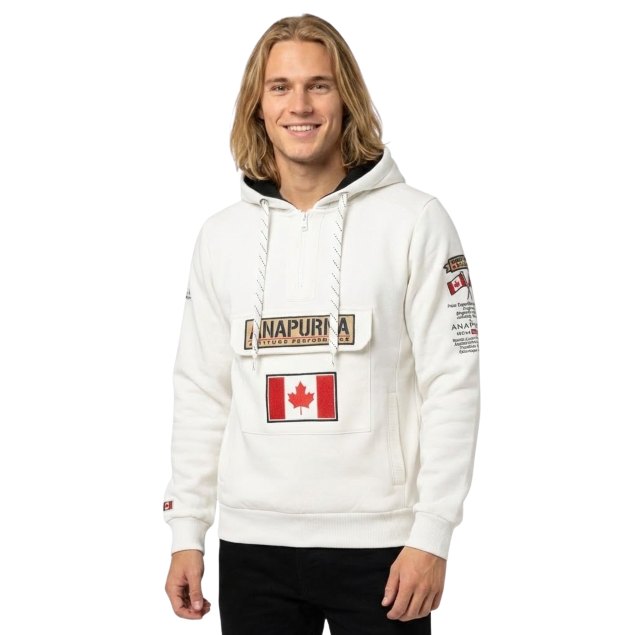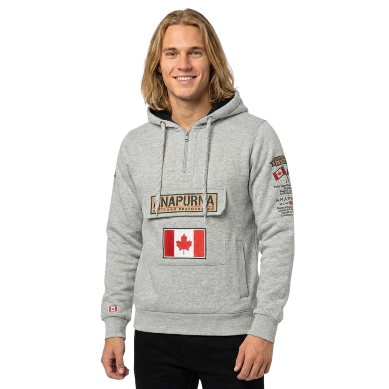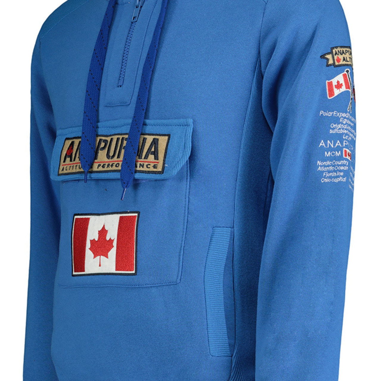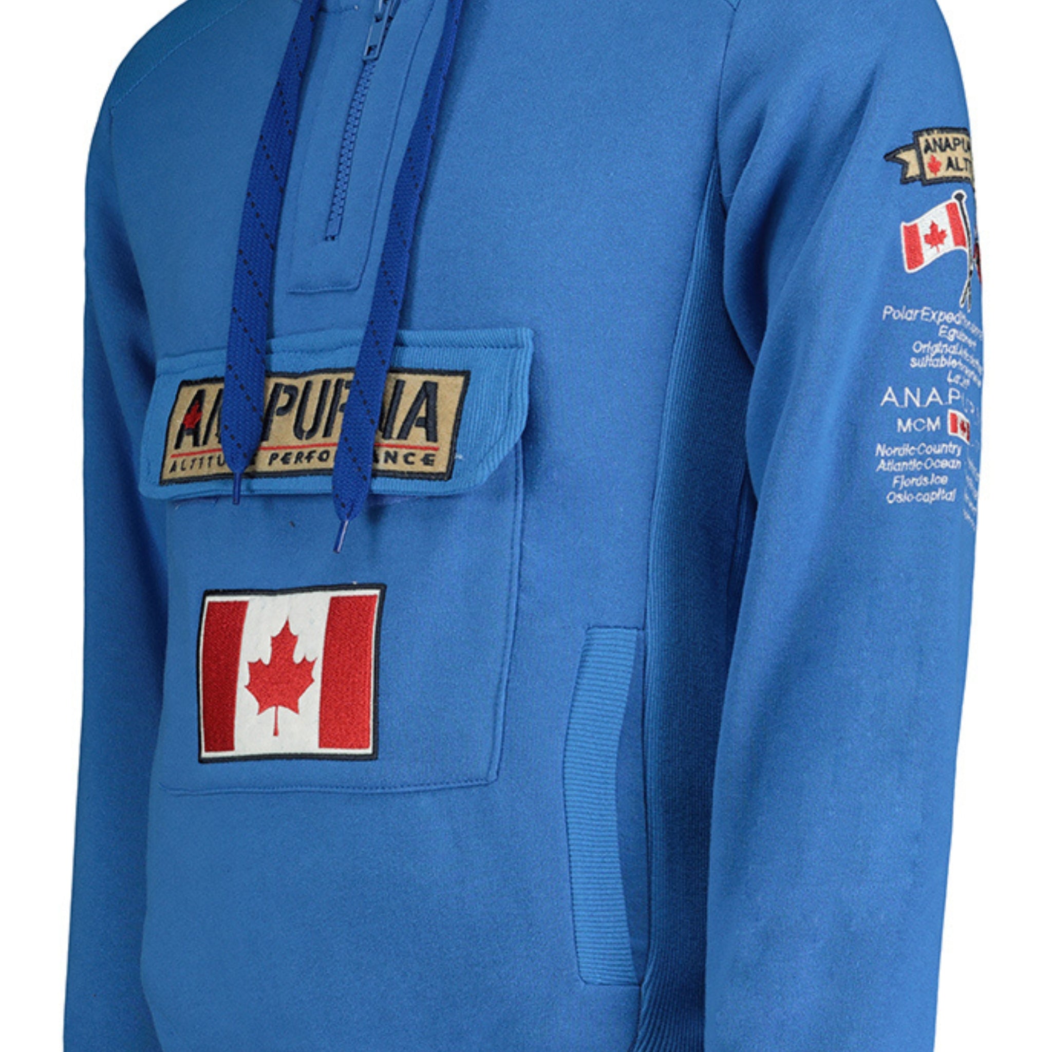 Das Sweatshirt "Gymana" für Herren von der Marke Anapurna ist ein bequemes, feminines und detailreiches Modell. Hergestellt aus einer weichen Mischung aus Baumwolle und Polyester hält er Sie warm und sieht dabei auch noch gut aus. Das Sweatshirt hat eine Kapuze mit Bindeband, einen Kragen mit Reißverschluss und gerippte Ärmelbündchen aus Fleece. Er zeichnet sich durch eine aufgesetzte, bestickte Brusttasche, eine Kängurutasche auf der Vorderseite und elegante Stickereien an den Ärmeln aus. Ein ideales Kleidungsstück, um Stil und Komfort im Alltag zu kombinieren.