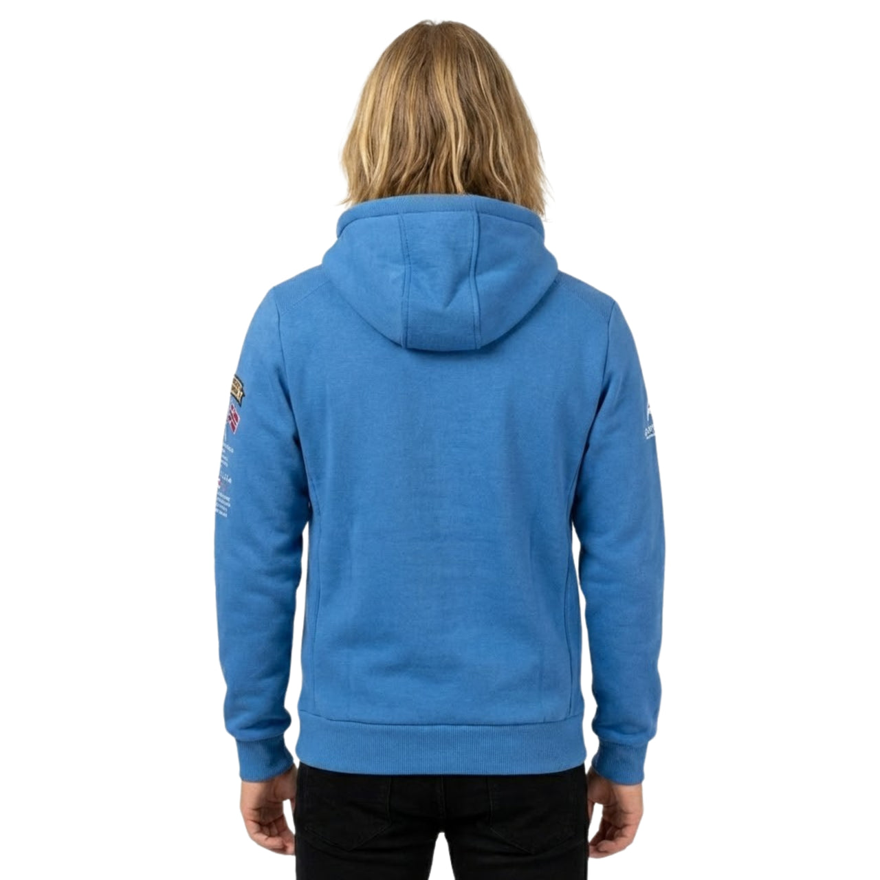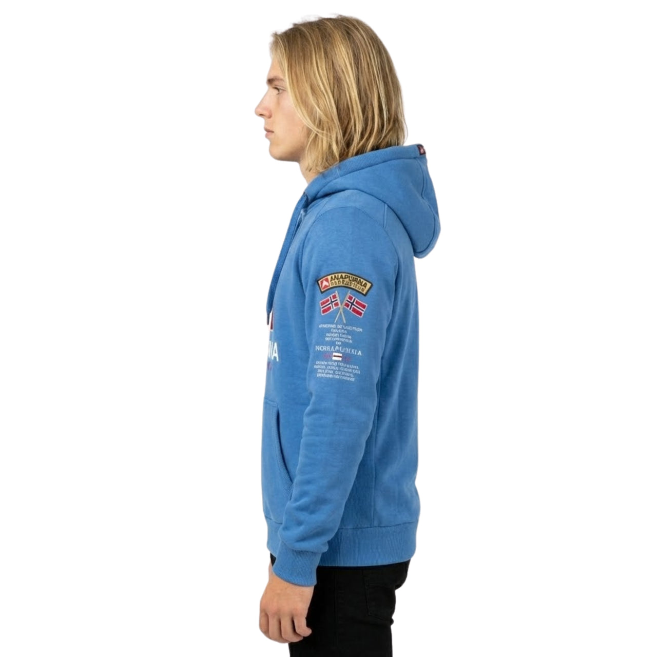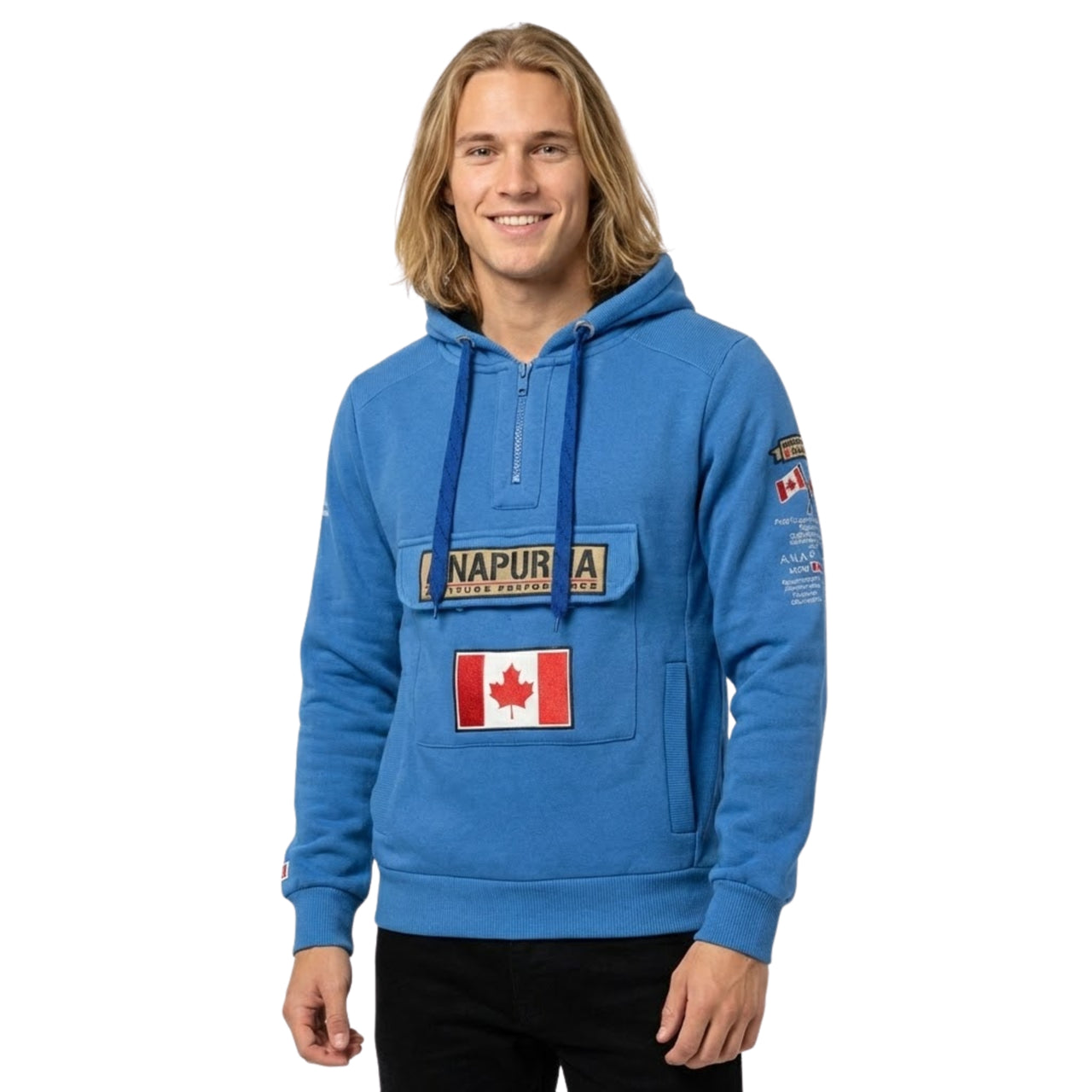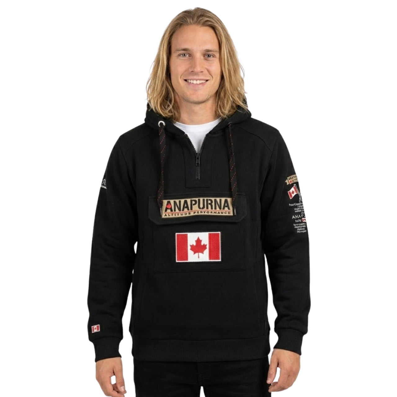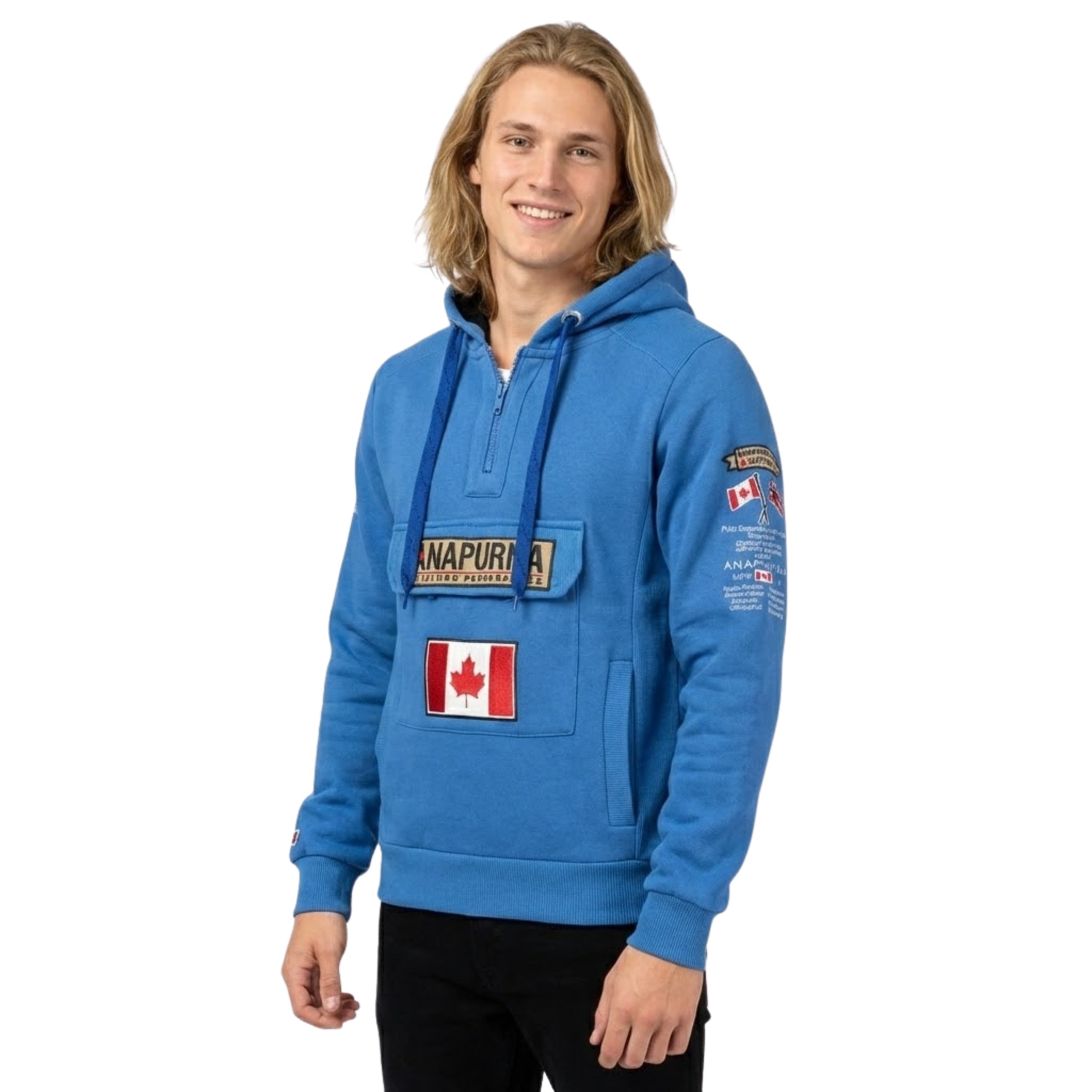 Das Sweatshirt "Gymana" für Herren von der Marke Anapurna ist ein bequemes, feminines und detailreiches Modell. Hergestellt aus einer weichen Mischung aus Baumwolle und Polyester hält er Sie warm und sieht dabei auch noch gut aus. Das Sweatshirt hat eine Kapuze mit Bindeband, einen Kragen mit Reißverschluss und gerippte Ärmelbündchen aus Fleece. Er zeichnet sich durch eine aufgesetzte, bestickte Brusttasche, eine Kängurutasche auf der Vorderseite und elegante Stickereien an den Ärmeln aus. Ein ideales Kleidungsstück, um Stil und Komfort im Alltag zu kombinieren.