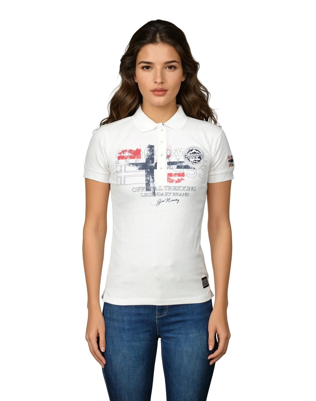 Entdecken Sie das "Kerry" Poloshirt für Damen von Geographical Norway, ein elegantes und modernes Kleidungsstück. Mit kurzen Ärmeln, Knöpfen am Kragen, Aufdrucken auf der Brust und einer norwegischen Flagge auf dem Ärmel bietet dieses Poloshirt einen unverwechselbaren Stil.