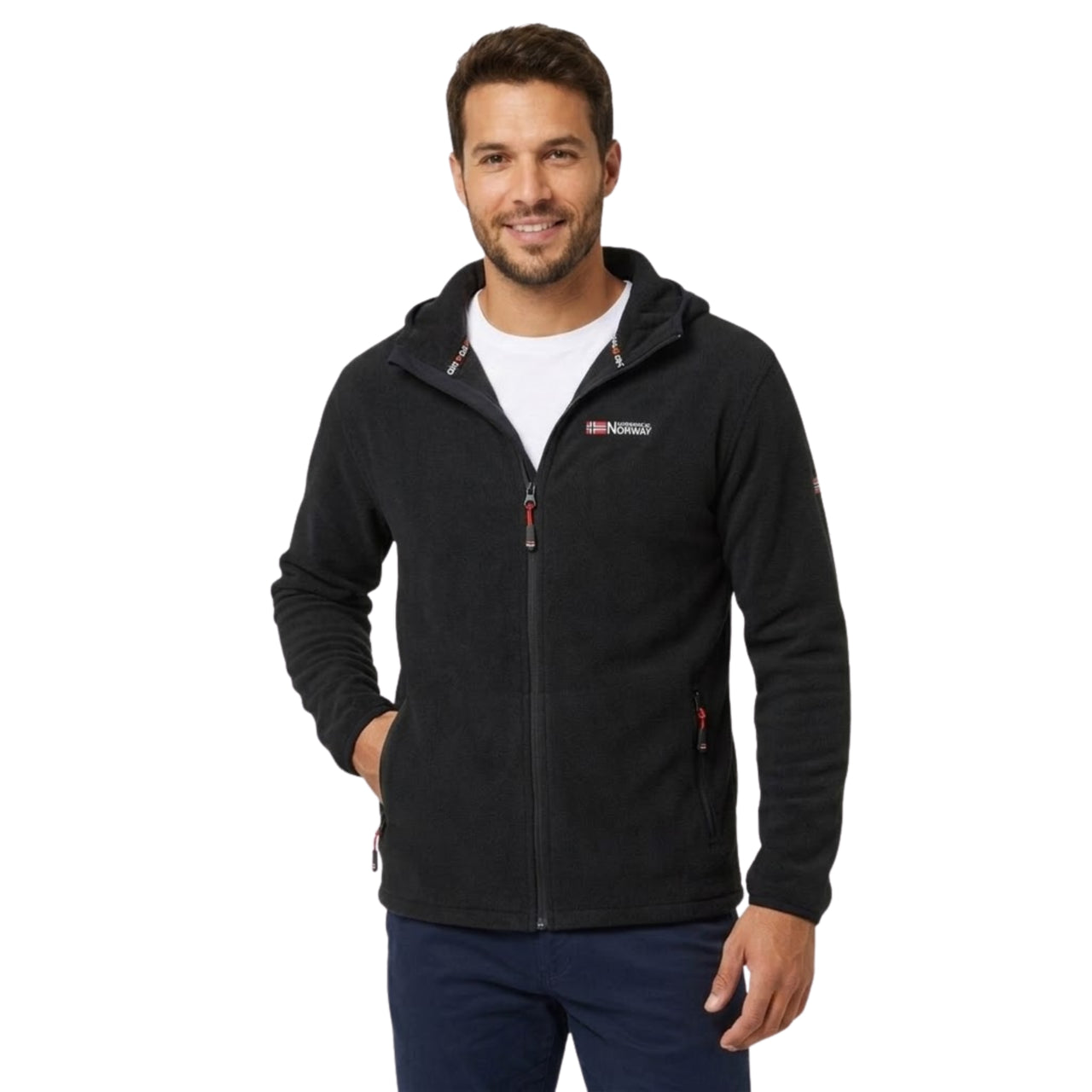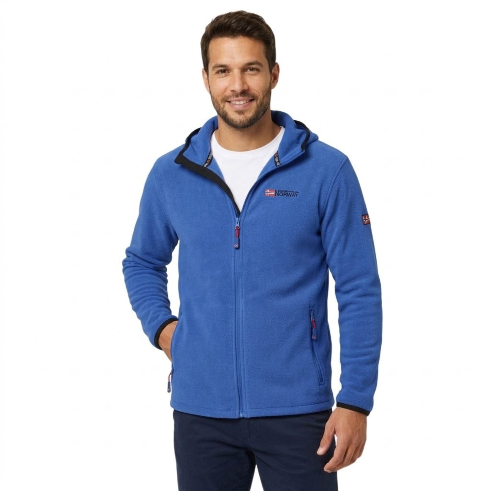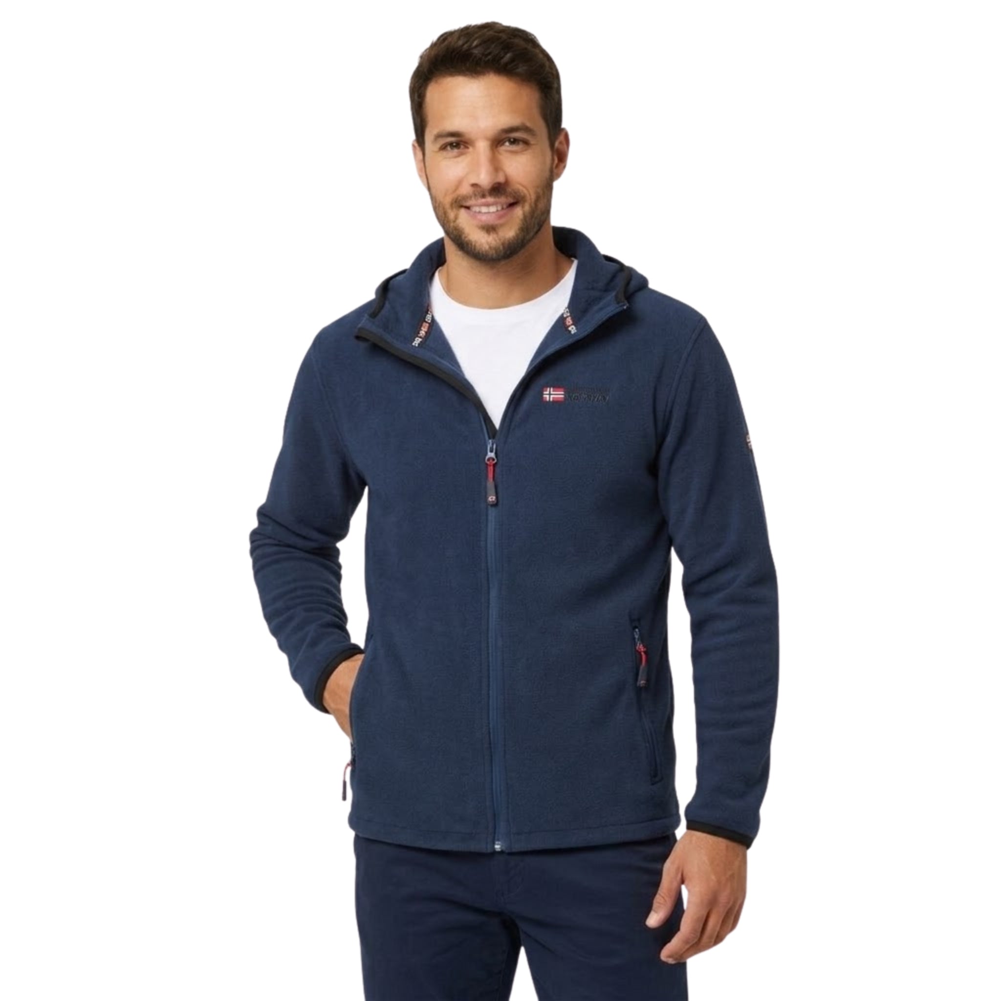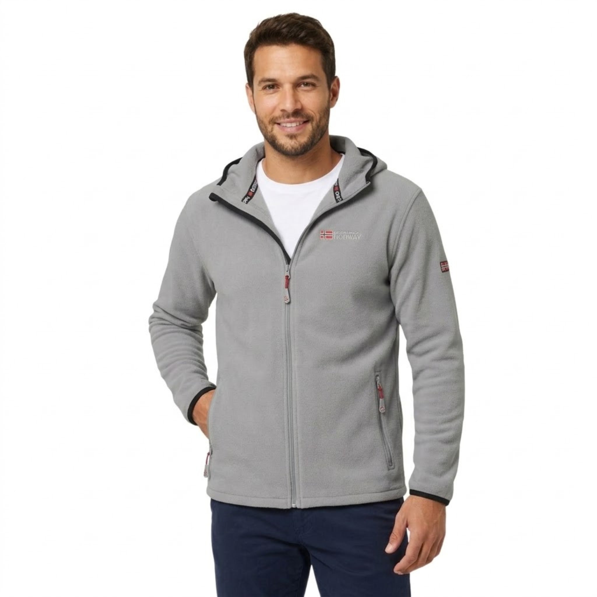 Dünne Fleecejacke für Herren: Leicht und bequem | Integrierte Kapuze: Zusätzlicher Schutz vor Kälte | Durchgehender Reißverschluss: Praktisch und modern | Seitentaschen: Funktional für den Alltag | Flagge und Aufdruck auf der Vorderseite: Signatur Geographical Norway Lässiger Outdoor-Stil: Ideal für die Übergangszeit | Material: 100 % Polyester | Herkunft: Hergestellt in Bangladesch