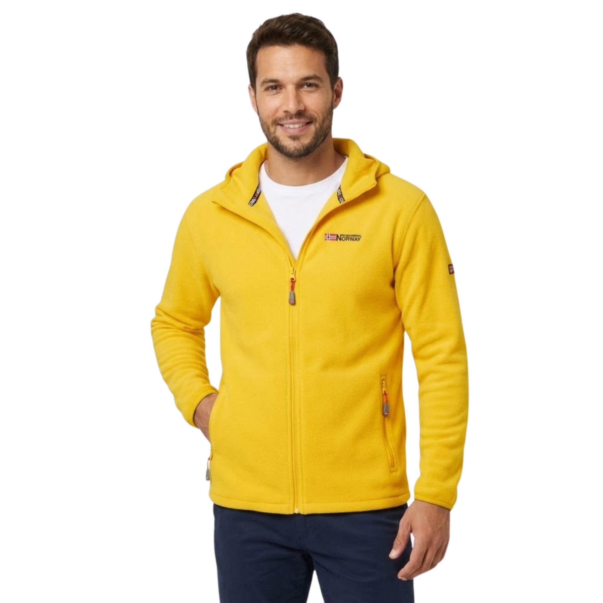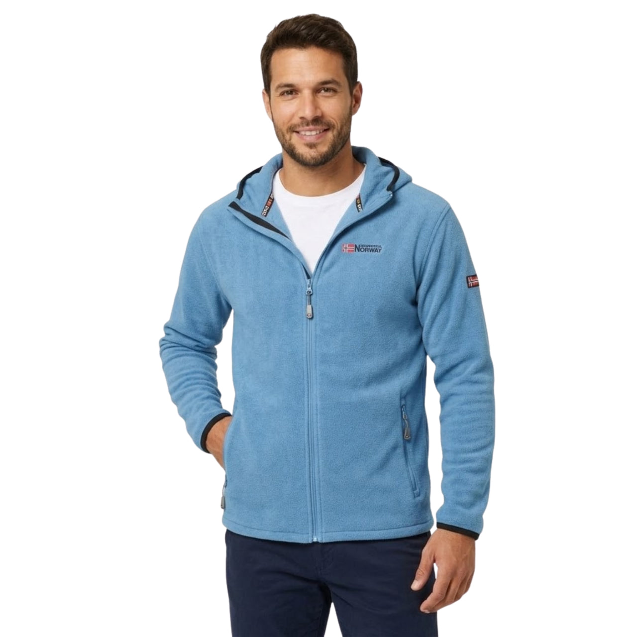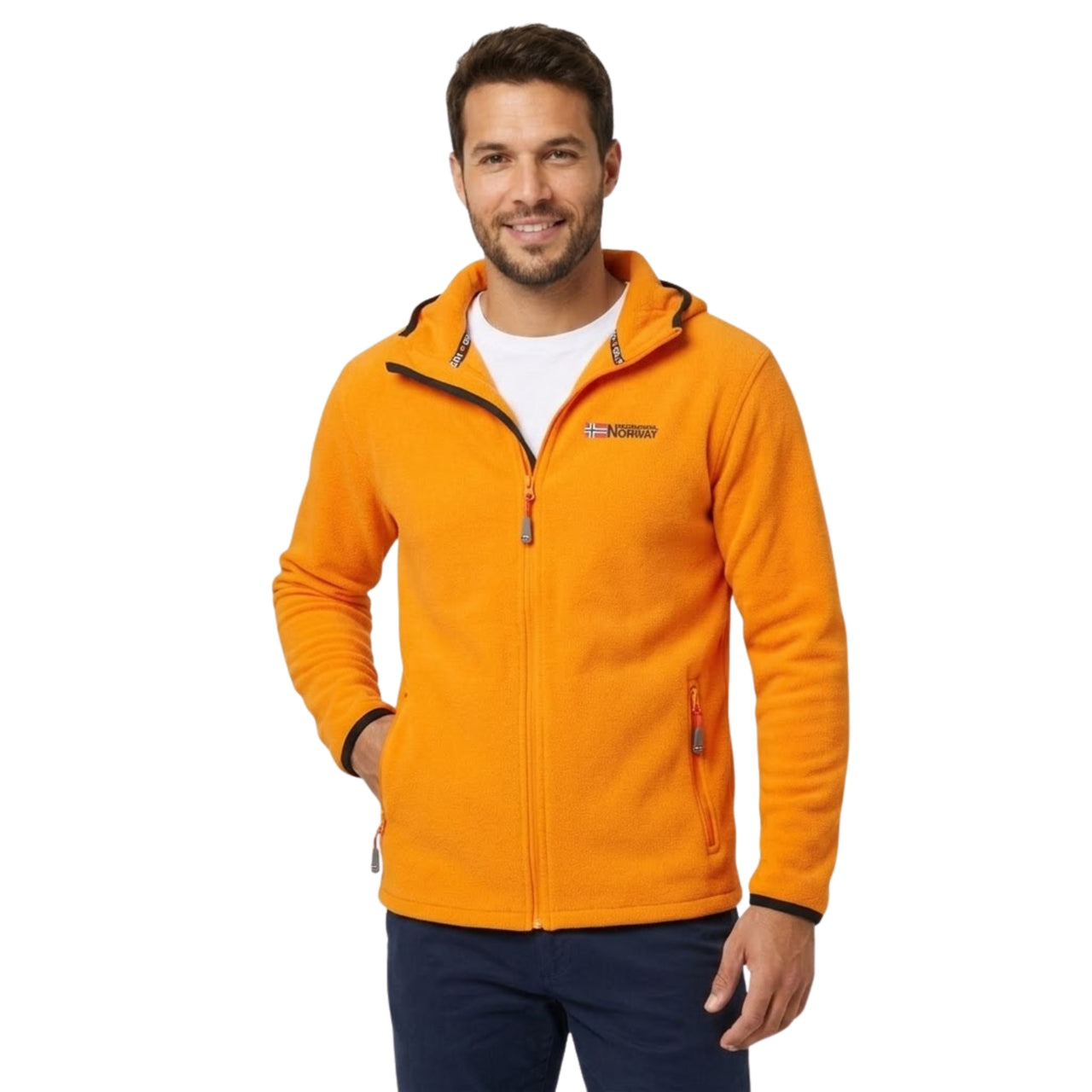 Dünne Fleecejacke für Herren: Leicht und bequem | Integrierte Kapuze: Zusätzlicher Schutz vor Kälte | Durchgehender Reißverschluss: Praktisch und modern | Seitentaschen: Funktional für den Alltag | Flagge und Aufdruck auf der Vorderseite: Signatur Geographical Norway Lässiger Outdoor-Stil: Ideal für die Übergangszeit | Material: 100 % Polyester | Herkunft: Hergestellt in Bangladesch