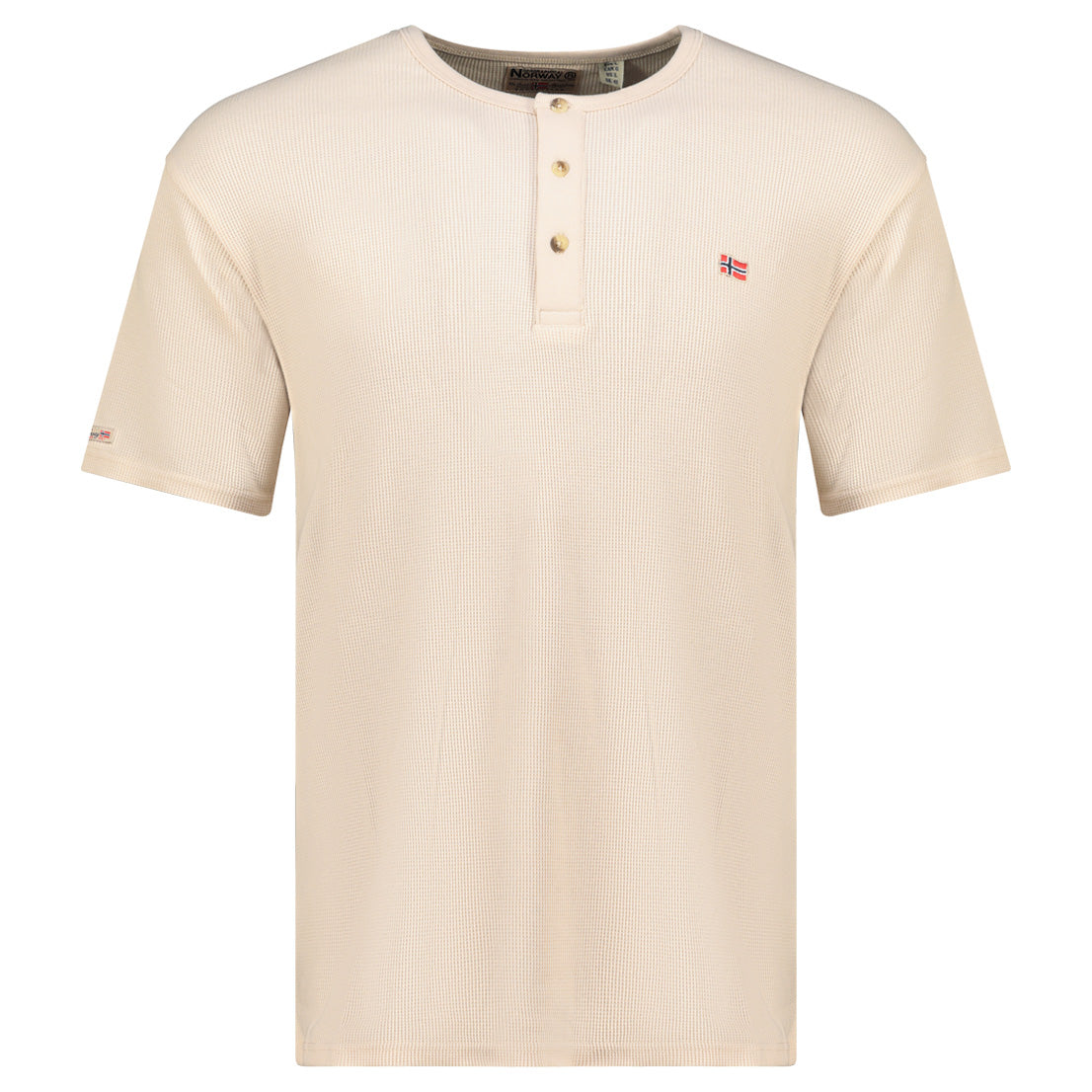 Das T-Shirt „Jwaffle Men” von Geographical Norway durch sein Wabenmuster aus, das für Struktur und Atmungsaktivität sorgt. Es ist leicht und bequem und verfügt über einen Rundhalsausschnitt mit einer Knopfleiste mit drei Knöpfen für einen raffinierten Casual-Look. Die Flagge auf der Brust sorgt für einen dezenten, modernen Akzent. Ideal für einen lässigen, gepflegten Look zu jeder Jahreszeit.