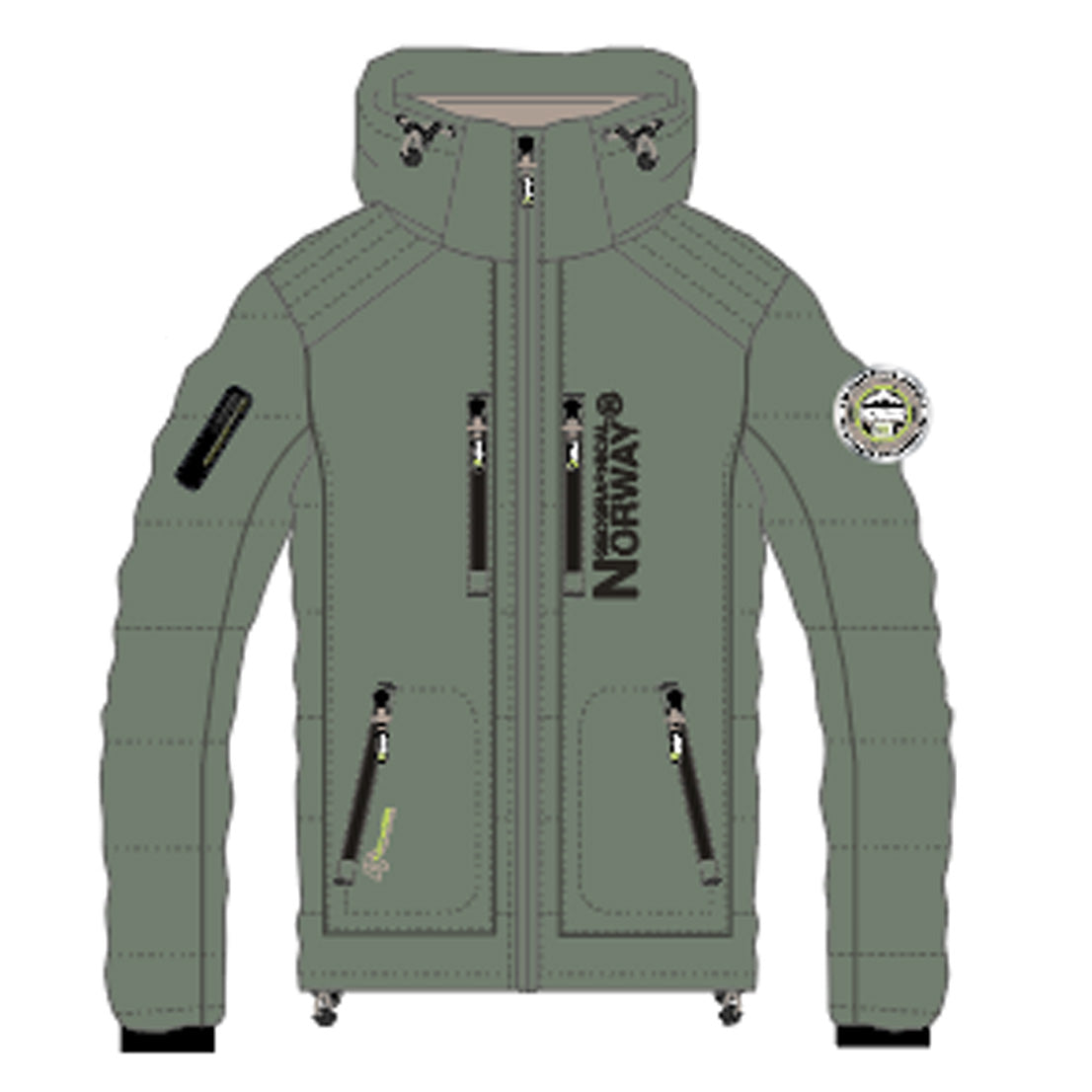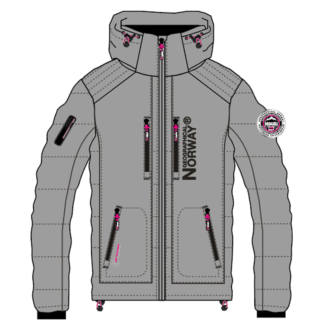 Entdecken Sie die steppjacke "BEACHWOOD" von Geographical Norway für Damen. Diese kontrastreiche, gesteppte steppjacke aus zwei Materialien hat eine Kapuze, zwei Reißverschlusstaschen, Kontrasteinsätze an den Ellenbogen, ein PVC-Abzeichen mit Klettverschluss am Ärmel und einen Aufdruck auf der Brust für einen modernen und funktionalen Stil.