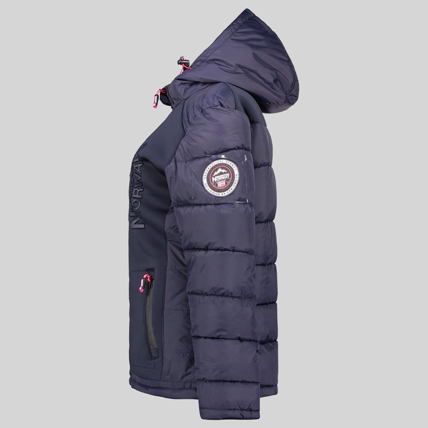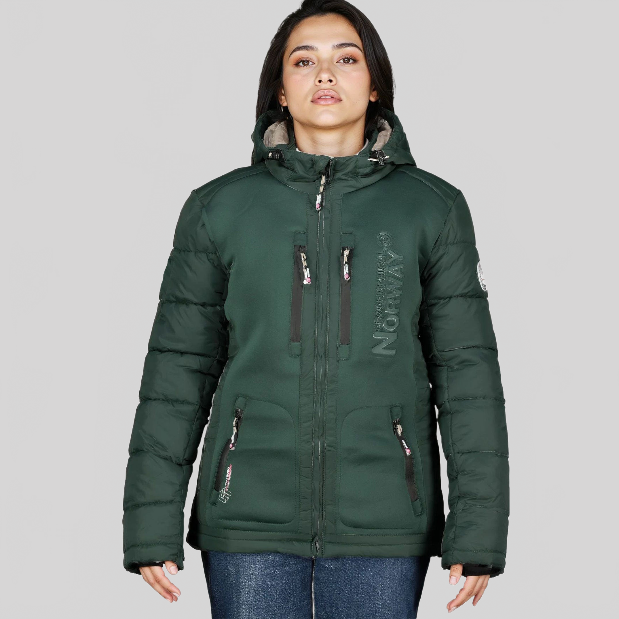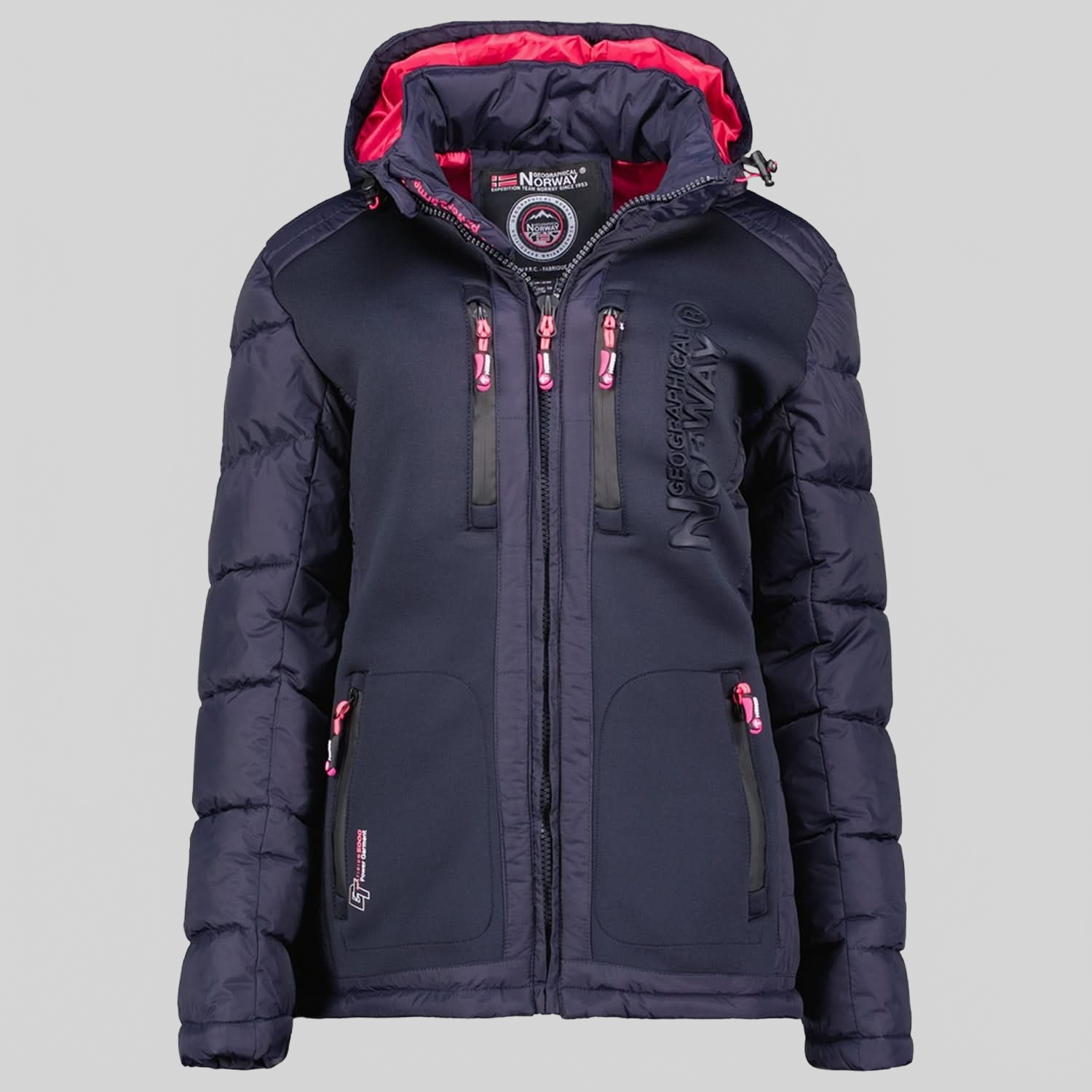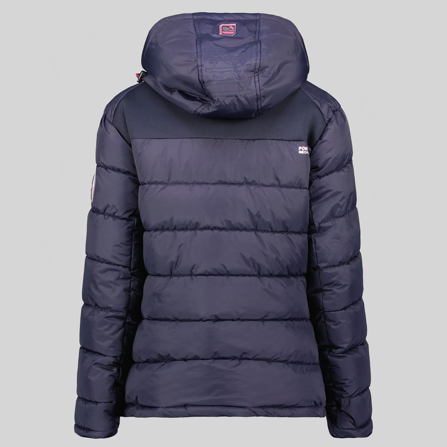 Entdecken Sie die steppjacke "BEACHWOOD" von Geographical Norway für Damen. Diese kontrastreiche, gesteppte steppjacke aus zwei Materialien hat eine Kapuze, zwei Reißverschlusstaschen, Kontrasteinsätze an den Ellenbogen, ein PVC-Abzeichen mit Klettverschluss am Ärmel und einen Aufdruck auf der Brust für einen modernen und funktionalen Stil.