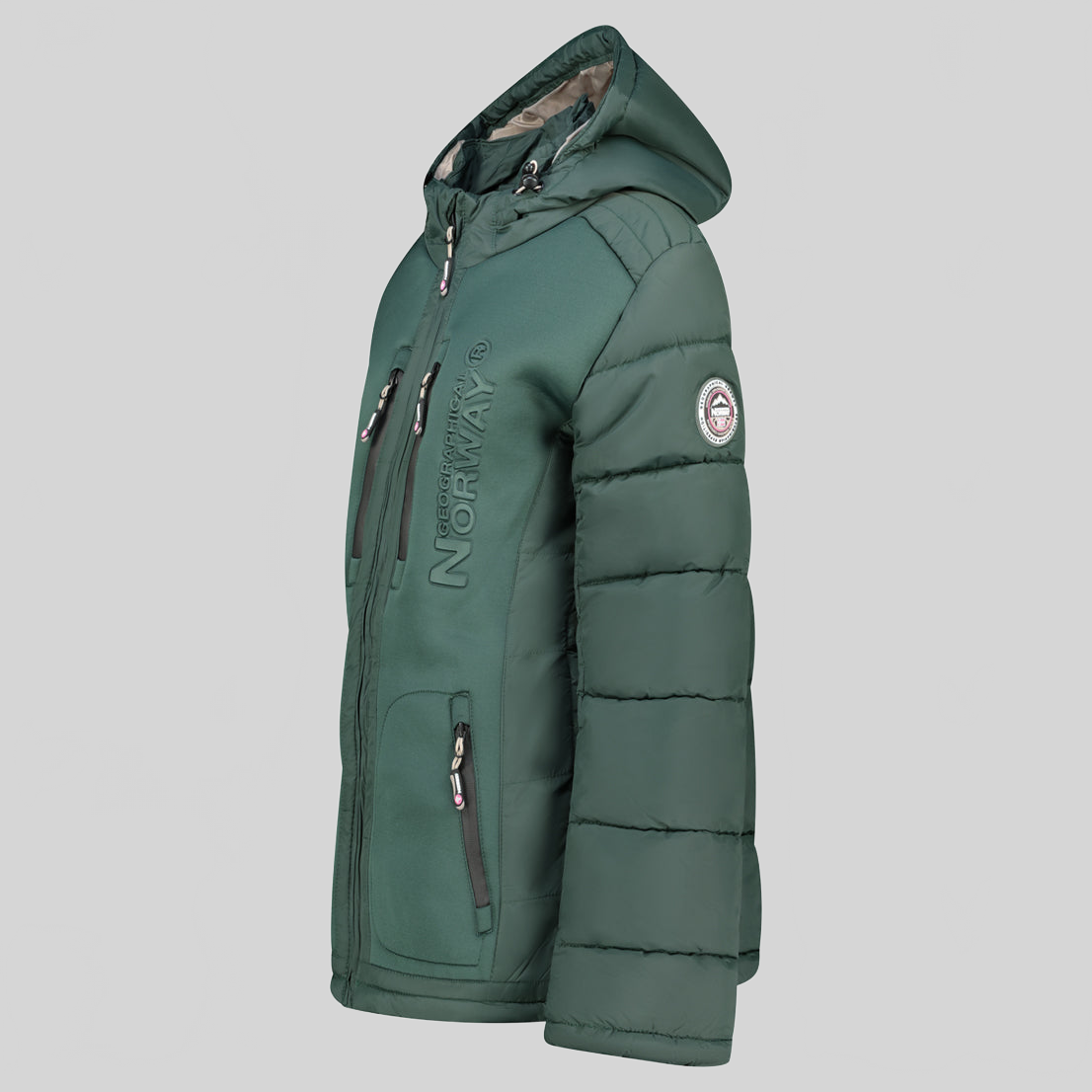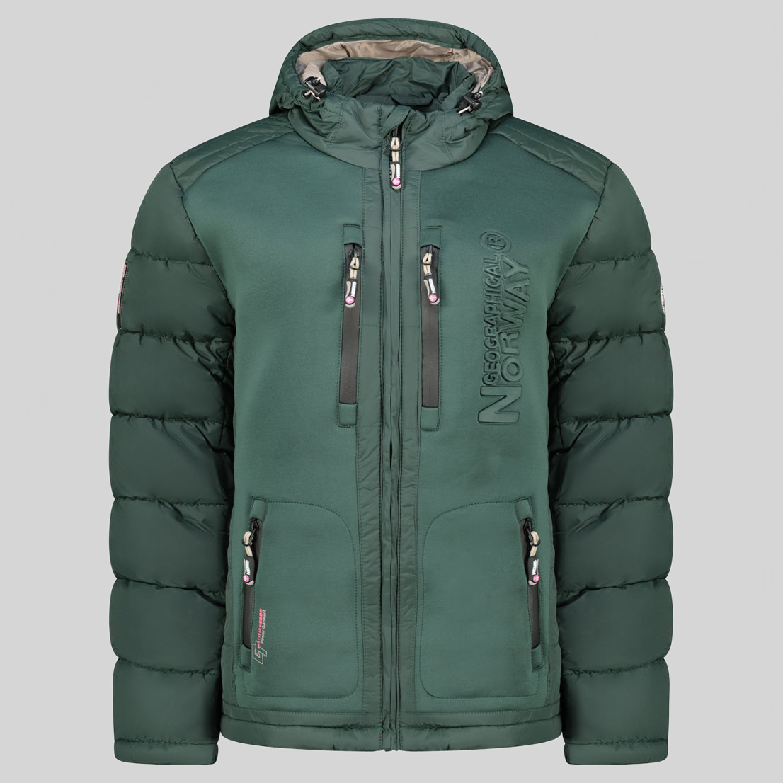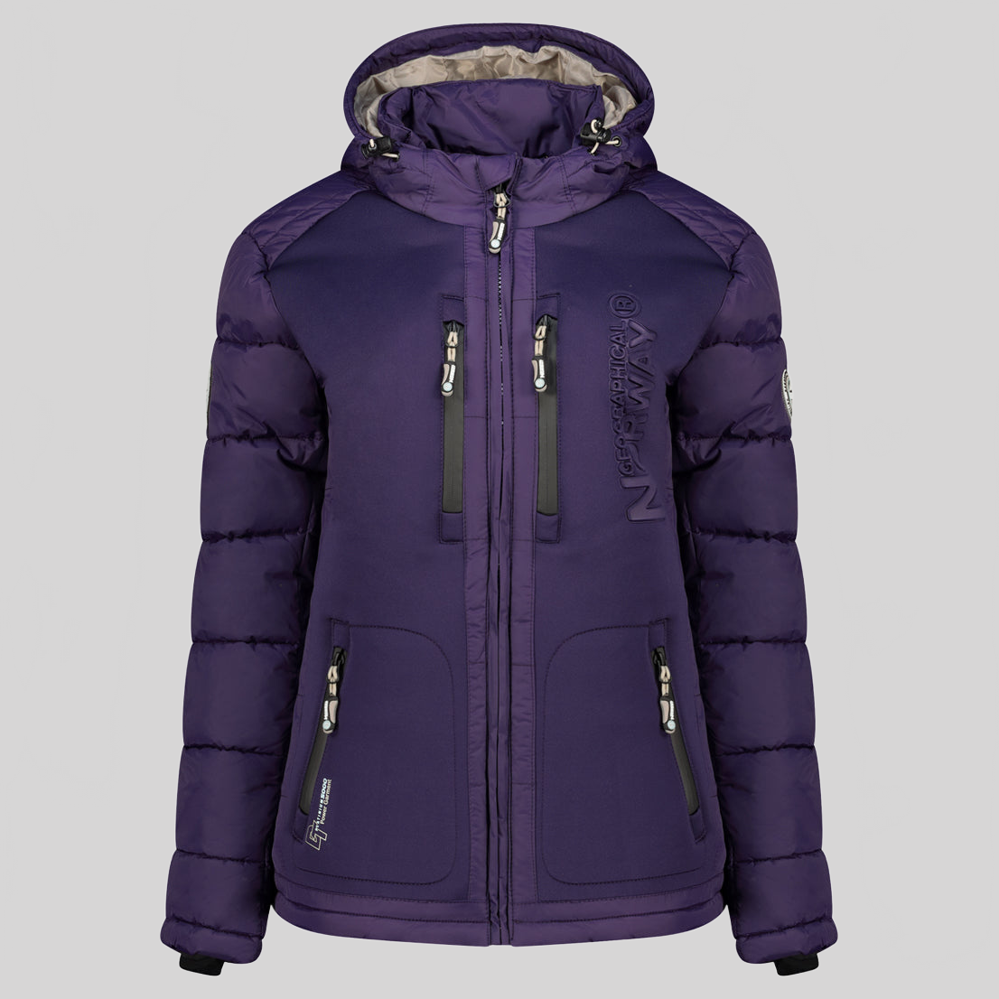 Entdecken Sie die steppjacke "BEACHWOOD" von Geographical Norway für Damen. Diese kontrastreiche, gesteppte steppjacke aus zwei Materialien hat eine Kapuze, zwei Reißverschlusstaschen, Kontrasteinsätze an den Ellenbogen, ein PVC-Abzeichen mit Klettverschluss am Ärmel und einen Aufdruck auf der Brust für einen modernen und funktionalen Stil.