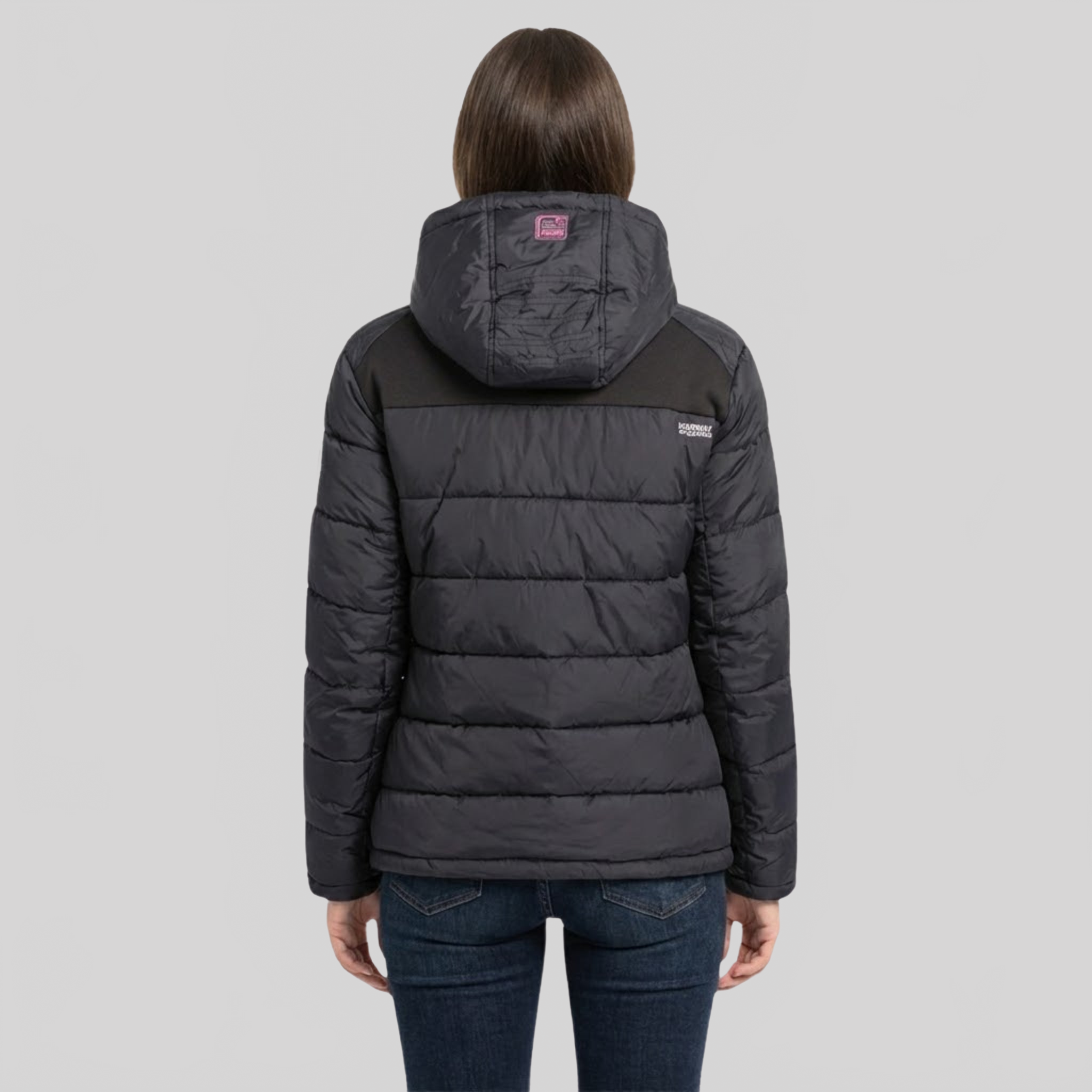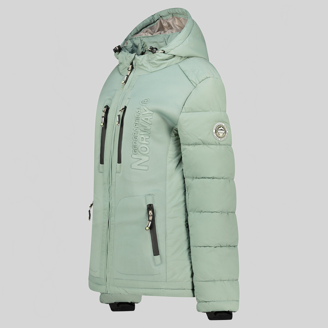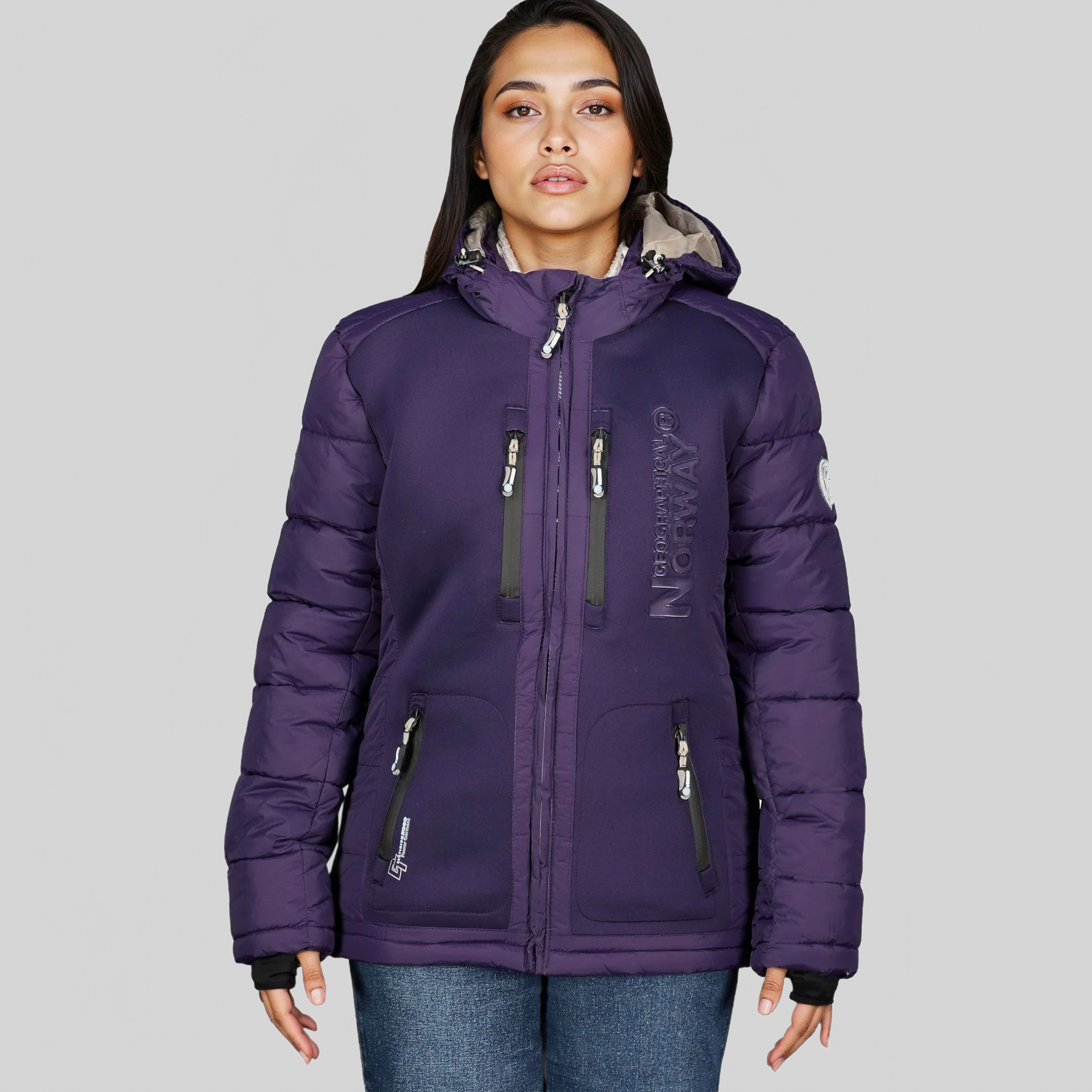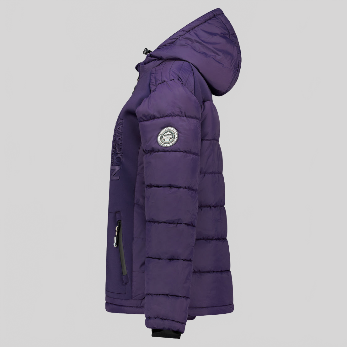 Entdecken Sie die steppjacke "BEACHWOOD" von Geographical Norway für Damen. Diese kontrastreiche, gesteppte steppjacke aus zwei Materialien hat eine Kapuze, zwei Reißverschlusstaschen, Kontrasteinsätze an den Ellenbogen, ein PVC-Abzeichen mit Klettverschluss am Ärmel und einen Aufdruck auf der Brust für einen modernen und funktionalen Stil.