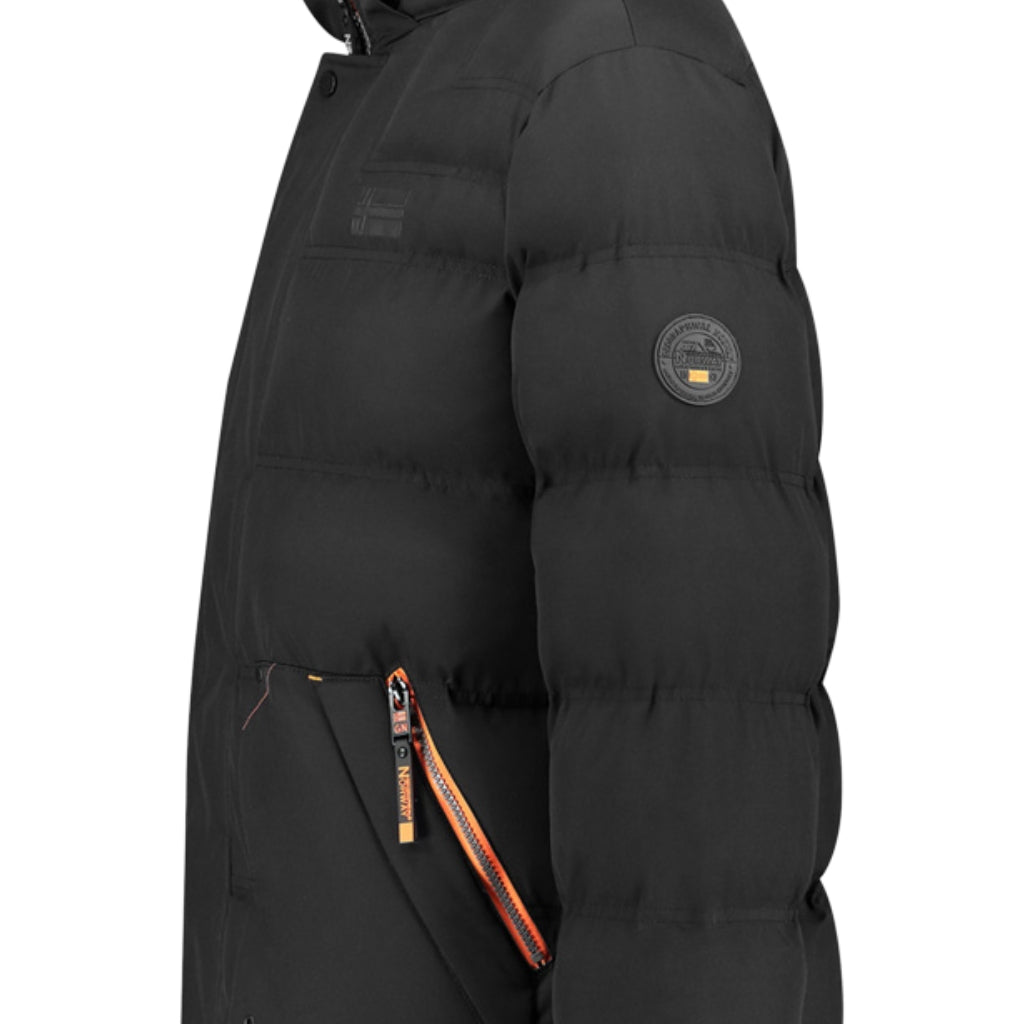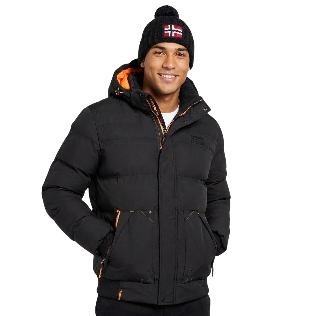 Get ready for winter with the "Badibere" jacket for men from Geographical Norway. This elegant, functional parka features a protective hood, central zip and button opening, and practical side pockets. The distinctive badge on the sleeve and the sewn-on flag on the front add an authentic, modern touch. Comfortable and hard-wearing, this model offers optimum protection against the cold, while making an urban style statement.