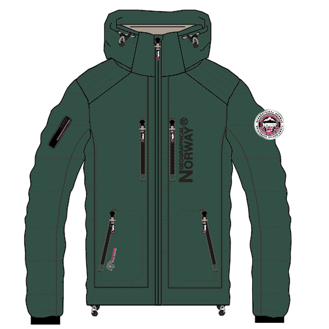 Discover Geographical Norway 's "BEACHWOOD" Puffer jacket for women. This bimaterial, contrast quilted Puffer jacket features a hood, 2 zipped pockets, contrast inserts on the elbows, a PVC badge with Velcro on the sleeve, and a print on the chest for modern, functional style.