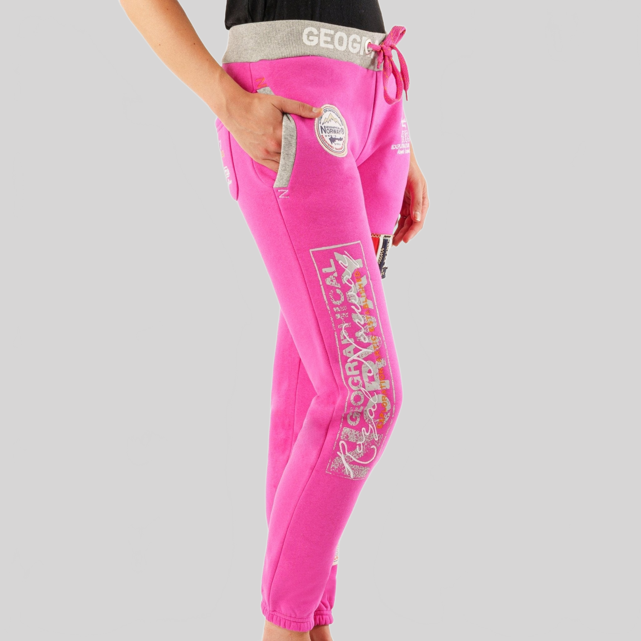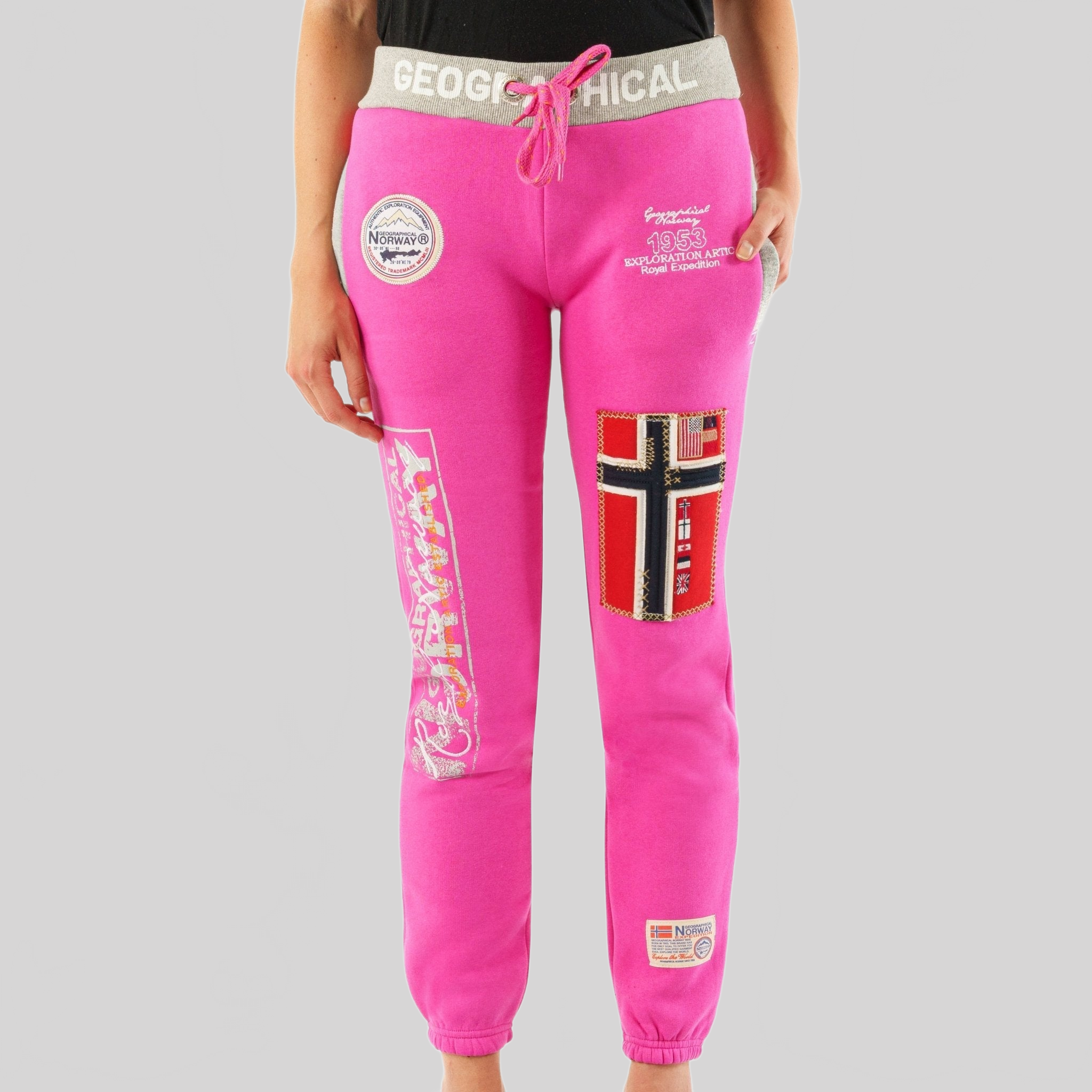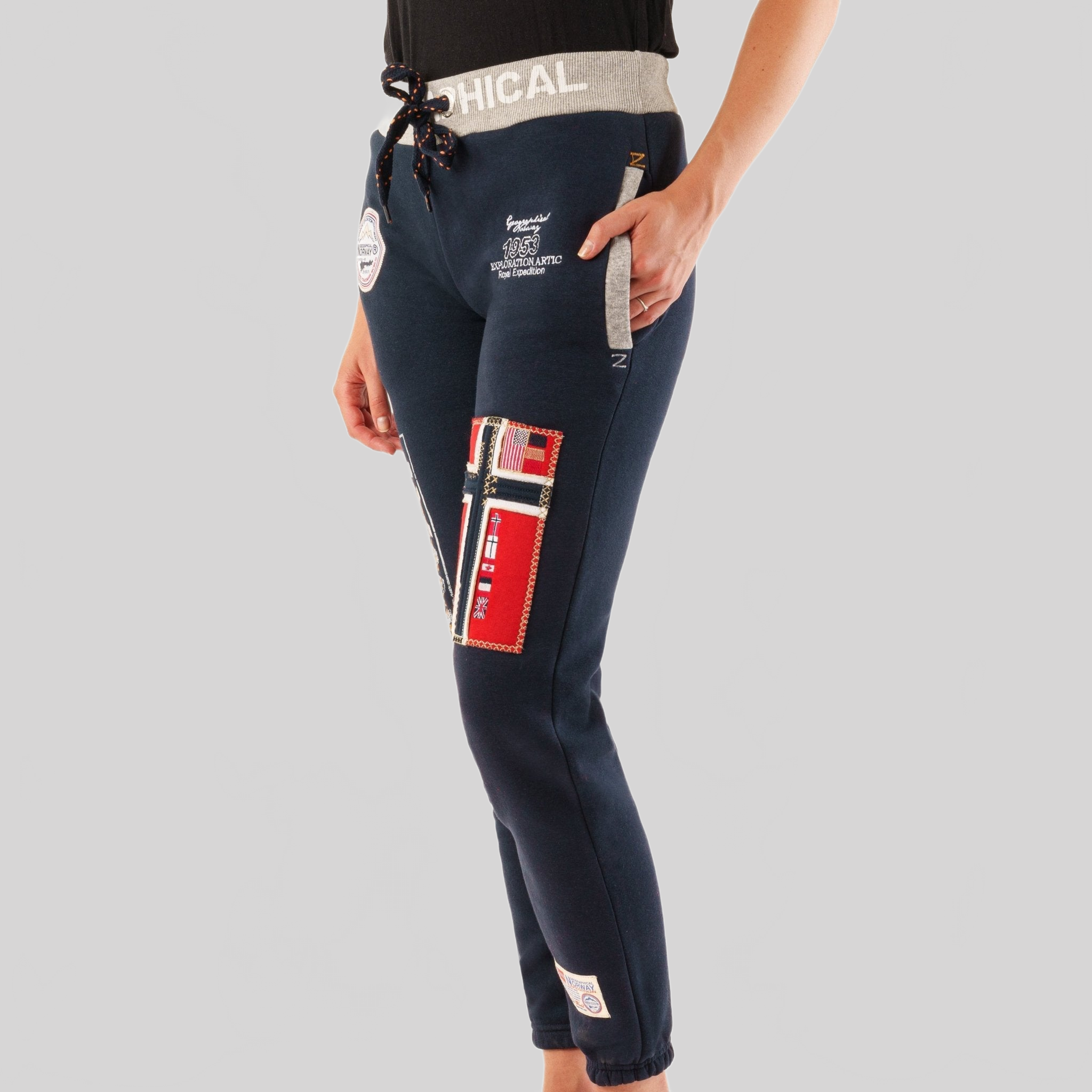 Discover Geographical Norway 's "Myer" jogging pants for women. These pants offer optimum comfort with their elasticated bottom. They are also adorned with numerous badges, embroideries and prints on the legs, in a distinctive Norwegian theme.