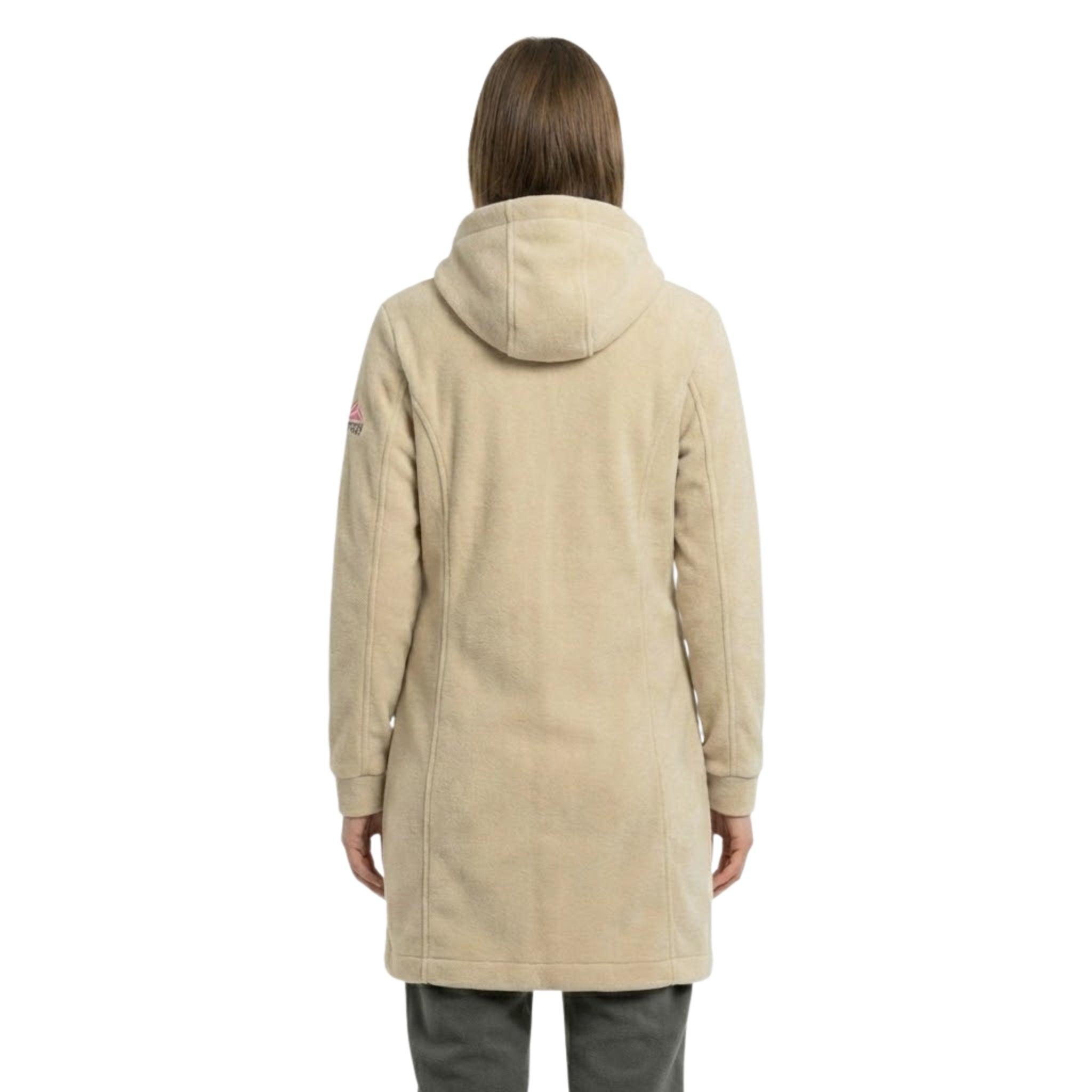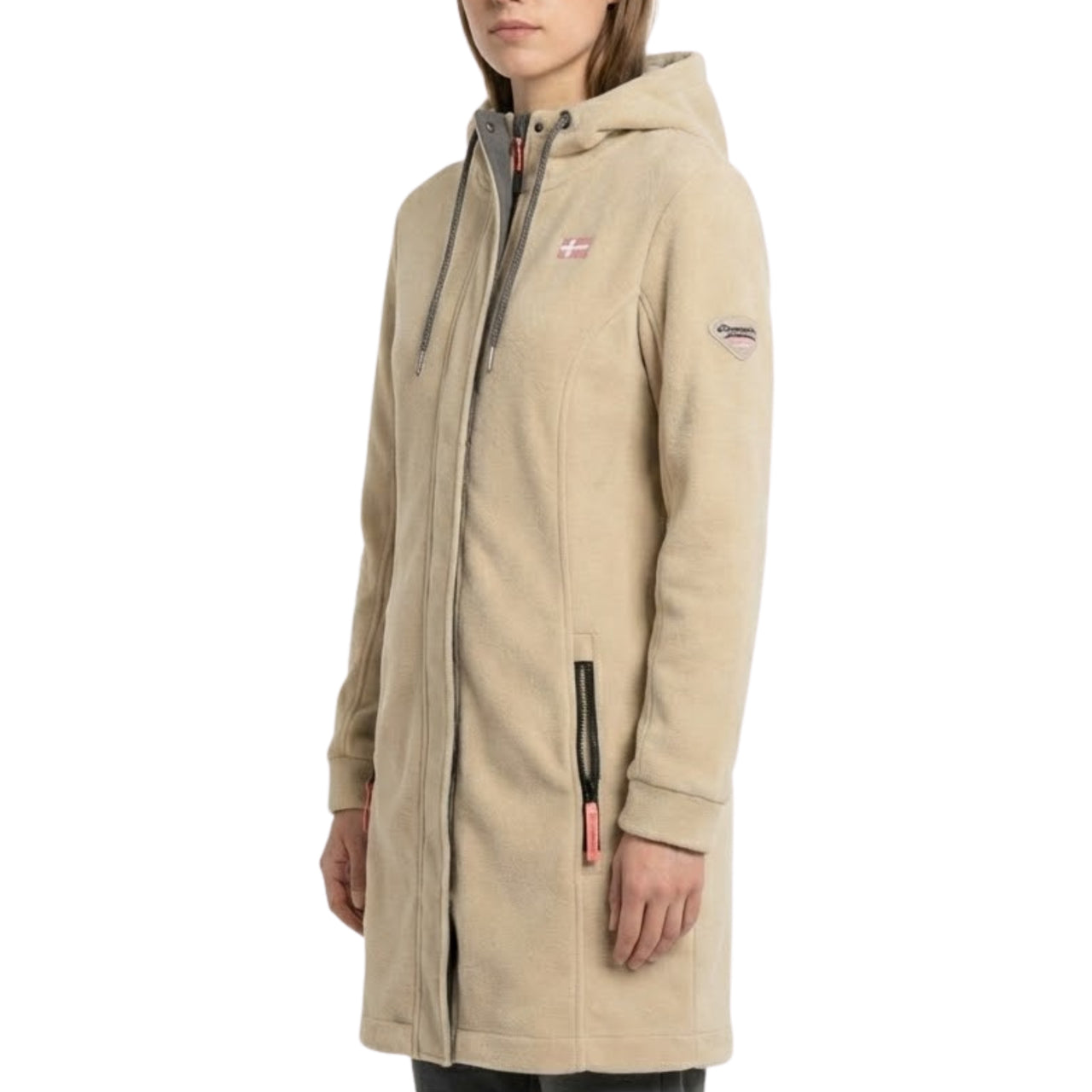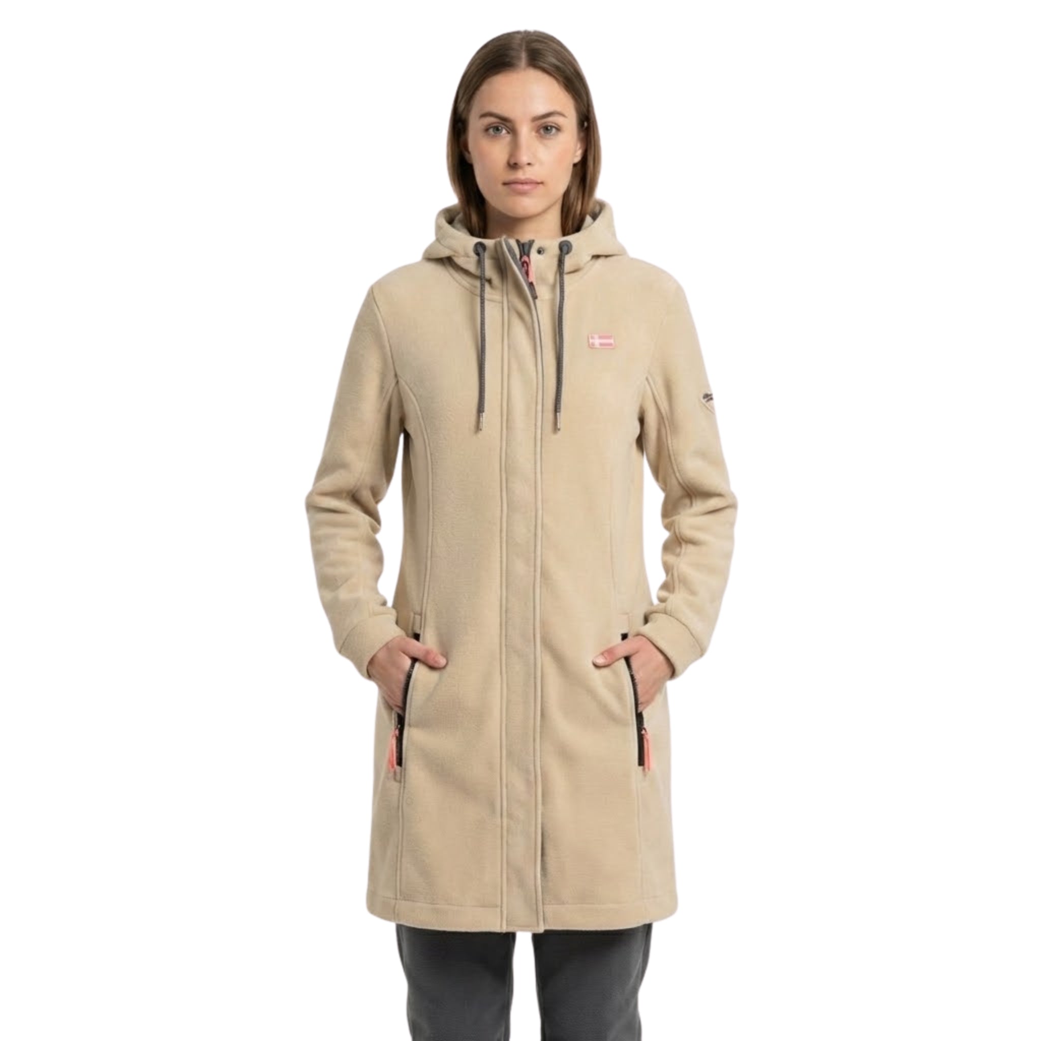 The Geographical Norway women's "Timothe" long fleece is designed for warmth and comfort in winter. Featuring a fixed hood with drawcord adjustment, it provides optimum protection against the cold. Its zip fastening complemented by press studs, practical side pockets and signature badge on the sleeve make it both functional and stylish. Perfect for your winter outings, it combines modern style with practicality.