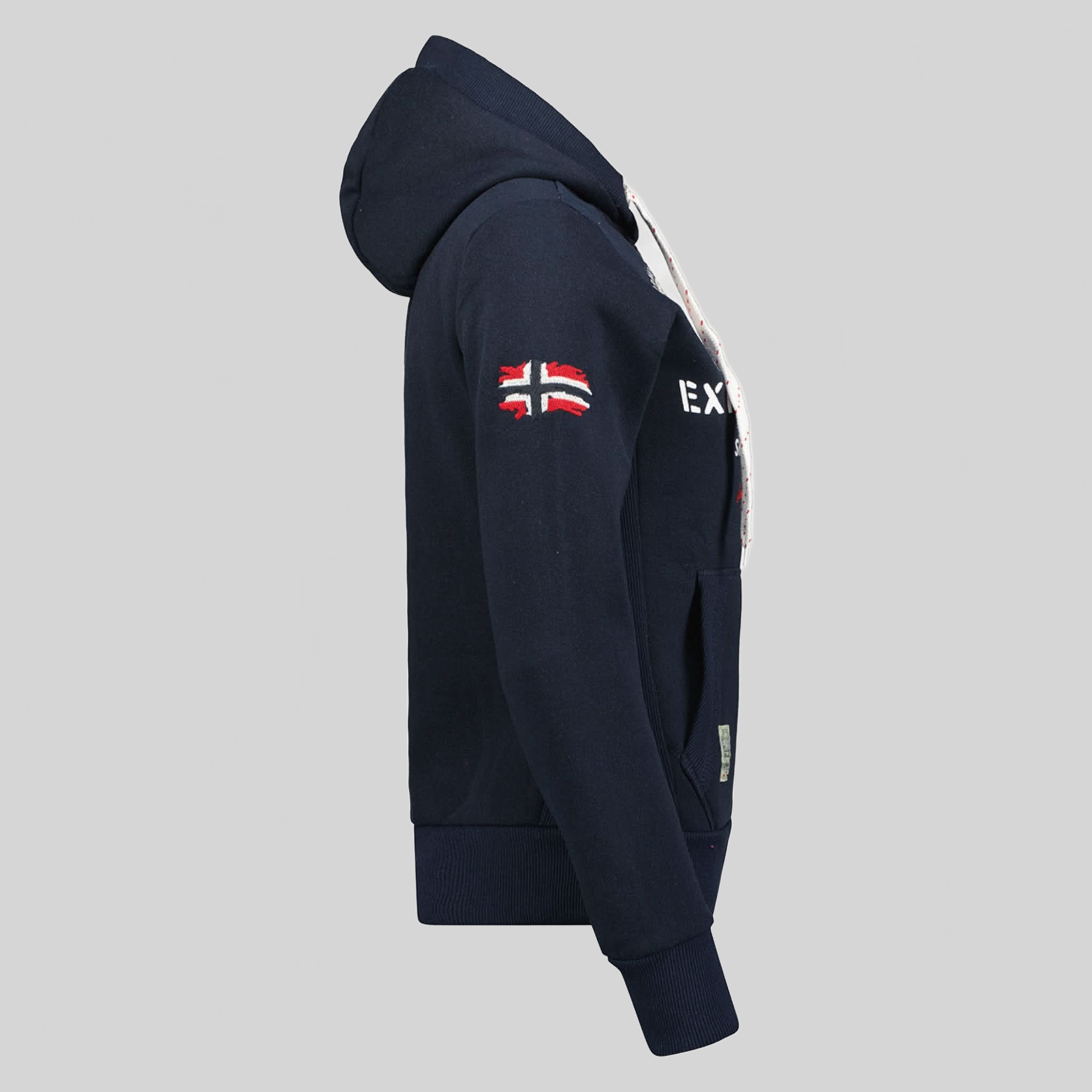 Discover the "Goptaine" headband sweatshirt from Geographical Norway for women. This women's sweatshirt is designed with a headband and hood. It features a flag on the arm, kangaroo pockets, distinctive prints on the front with a flag and badge, and a tightening tie.