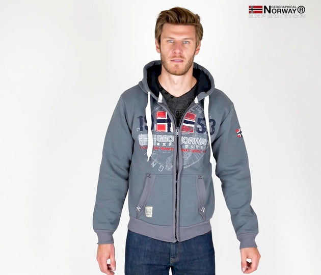 Discover Geographical Norway 's "GAPIGAL" zipped hooded sweatshirt for men, a comfortable and modern piece. A drawstring hood, front kangaroo pocket and front embroidery and print add a distinctive, stylish touch to this sweatshirt.
