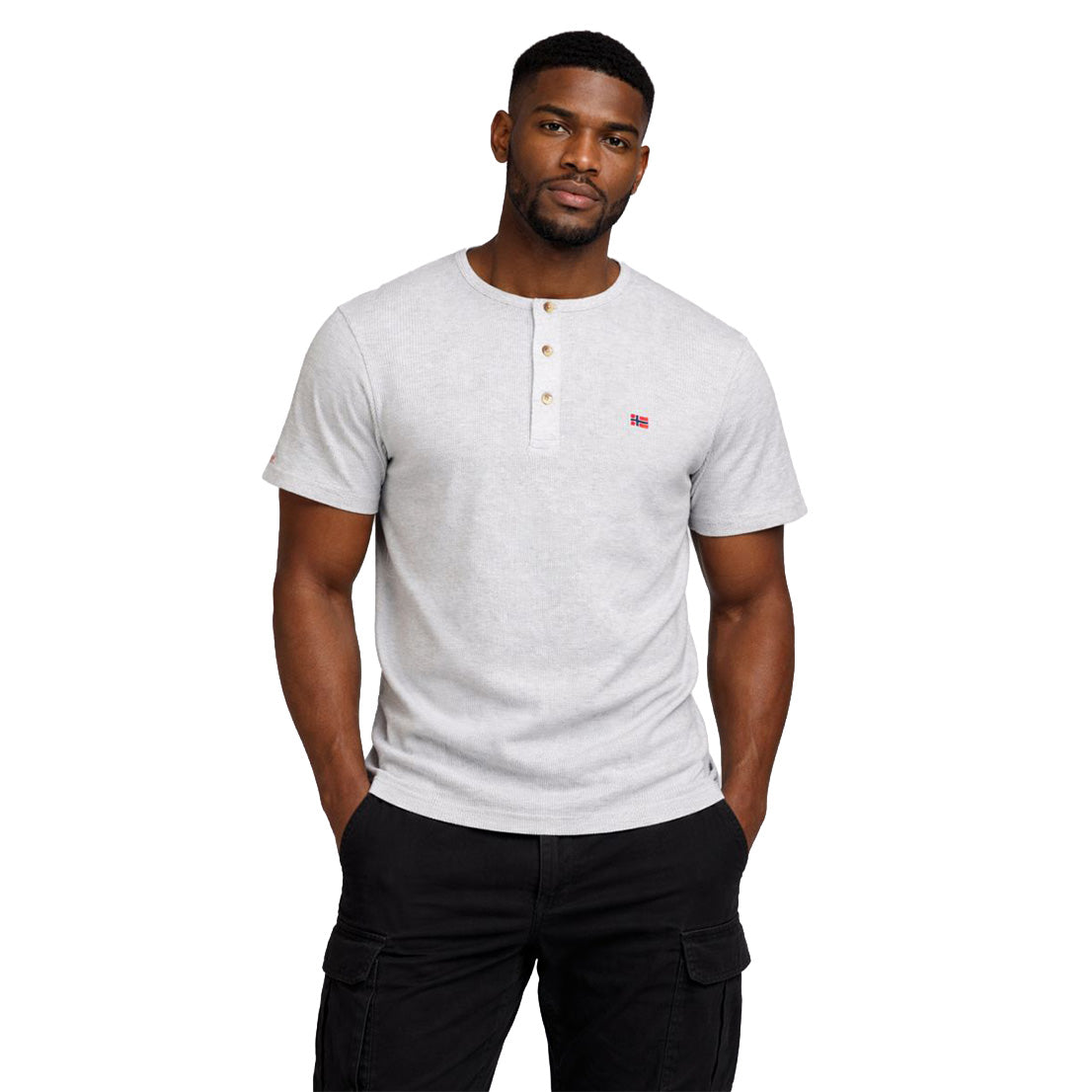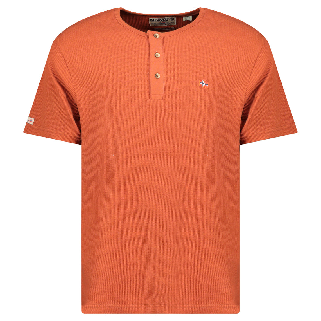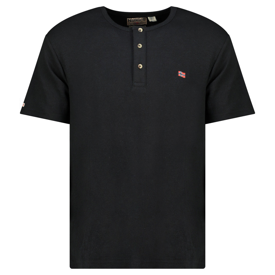 The Geographical Norway "Jwaffle Men" T-shirt Geographical Norway out thanks to its honeycomb fabric, which provides texture and breathability. Lightweight and comfortable, it features a round neckline with a three-button placket for a refined casual style. The flag on the chest adds a discreet and modern signature touch. Ideal for a relaxed and polished look in any season.