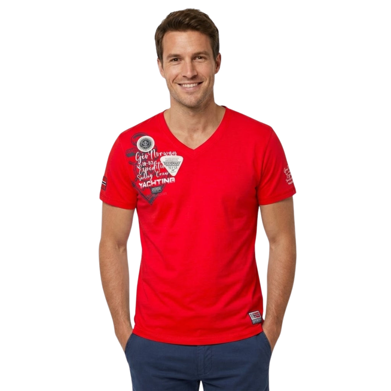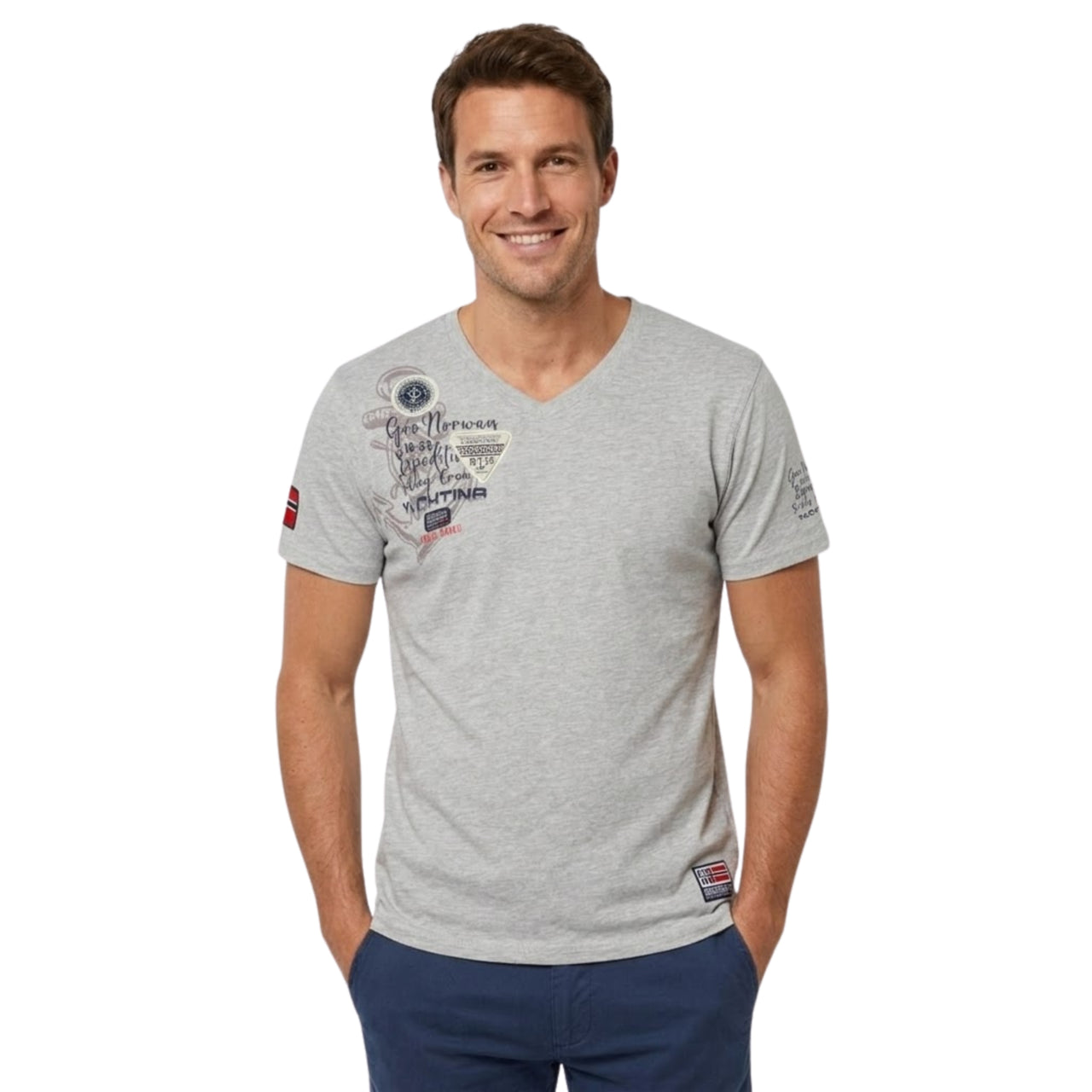 Discover the "Jademora" V-neck t-shirt from Geographical Norway for men, a comfortable and stylish garment. With its V-neck, short sleeves, prints on one sleeve and the flag on the other, as well as the print on the front, this t-shirt adds a distinctive touch to your outfit.