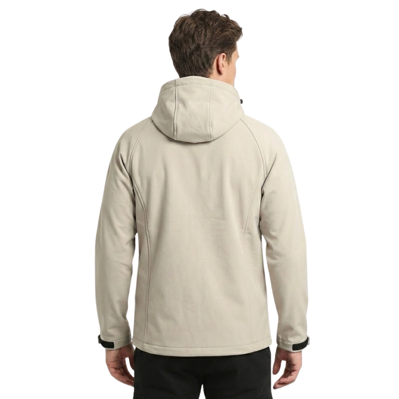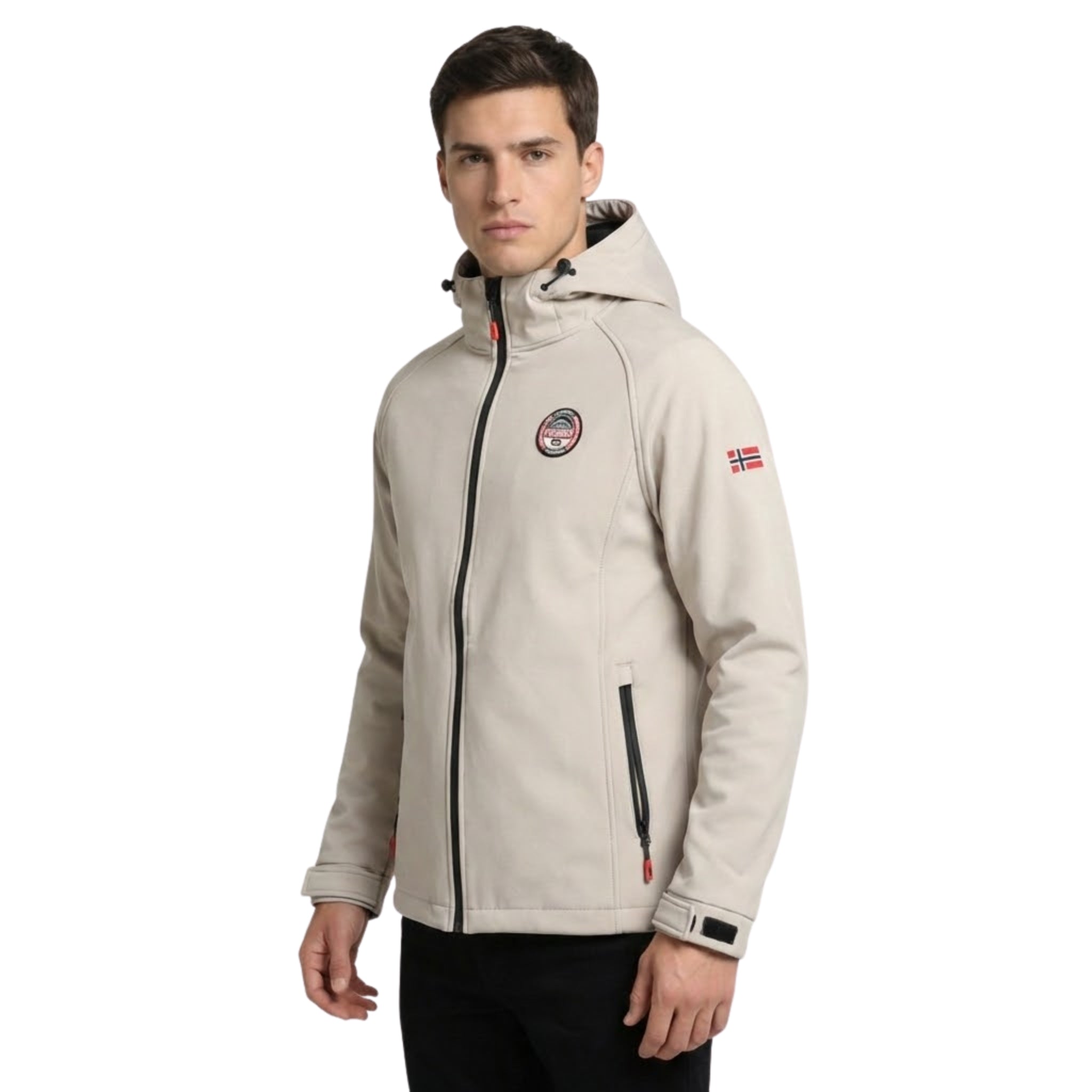 Geographical Norway 's "Tamigobadge" softshell for men combines style and functionality for everyday use in all seasons. Made from water-repellent fabric, it provides effective protection against light rain. Its fixed, drawstring-adjustable hood, adjustable cuffs and practical side pockets make it comfortable and versatile. The distinctive badge on the chest underlines the brand's modern, sporty identity.