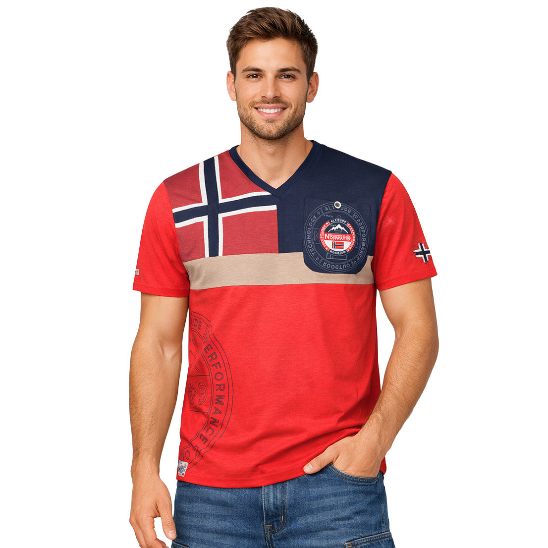 The "J-Flag Men" T-shirt by Geographical Norway a modern and stylish V-neck design, ideal for a casual yet polished look. Lightweight and comfortable, it is made from cotton for everyday comfort. Its chest pocket adds a practical and distinctive touch, adding character to this essential piece in any man's wardrobe.