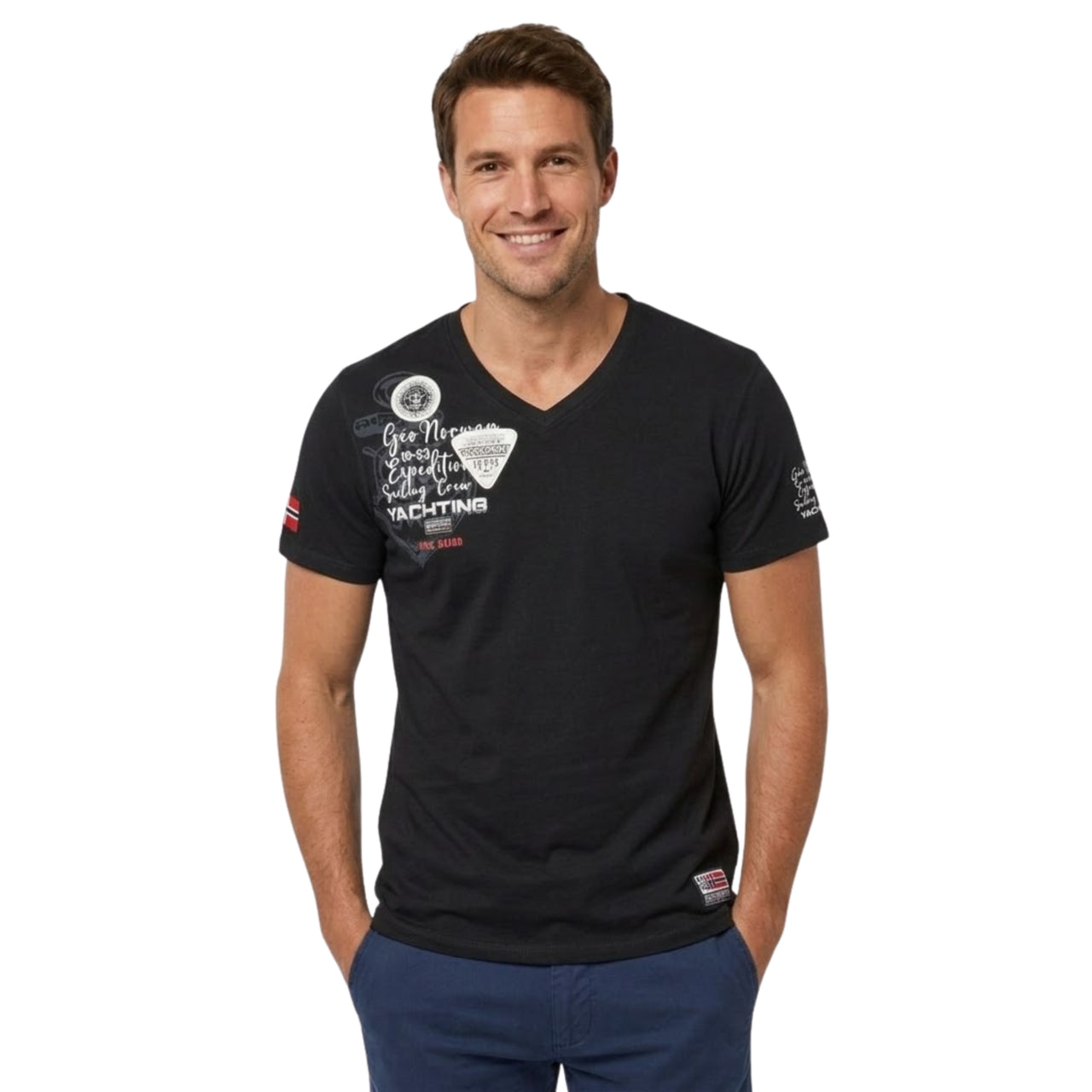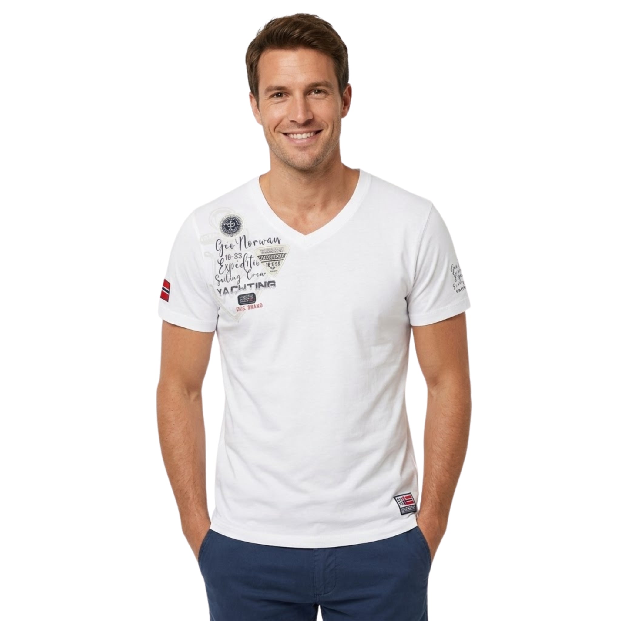 Discover the "Jademora" V-neck t-shirt from Geographical Norway for men, a comfortable and stylish garment. With its V-neck, short sleeves, prints on one sleeve and the flag on the other, as well as the print on the front, this t-shirt adds a distinctive touch to your outfit.