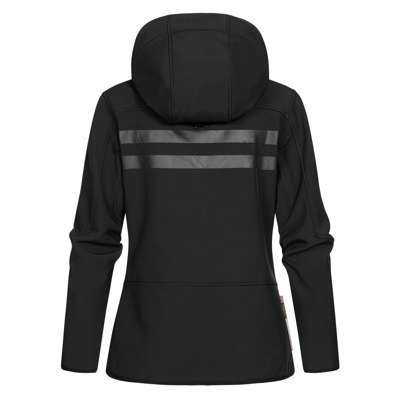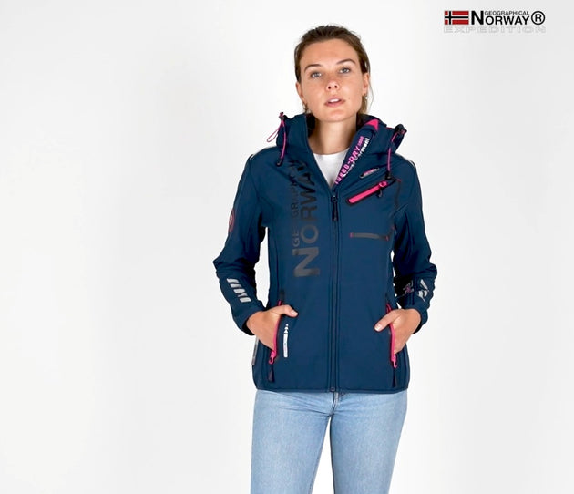 Discover the "Reine" softshell from Geographical Norway, specially designed for women. This elegant, functional jacket features a detachable, adjustable hood, two front zip pockets, a diagonal chest pocket, several PVC badges and original prints. In addition, it features two high-density printed stripes on the back for modern style.