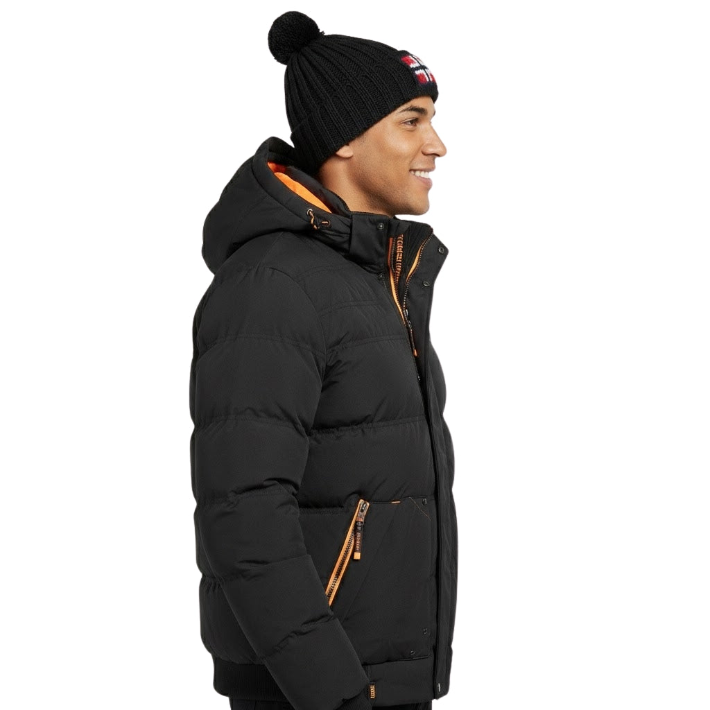 Get ready for winter with the "Badibere" jacket for men from Geographical Norway. This elegant, functional parka features a protective hood, central zip and button opening, and practical side pockets. The distinctive badge on the sleeve and the sewn-on flag on the front add an authentic, modern touch. Comfortable and hard-wearing, this model offers optimum protection against the cold, while making an urban style statement.