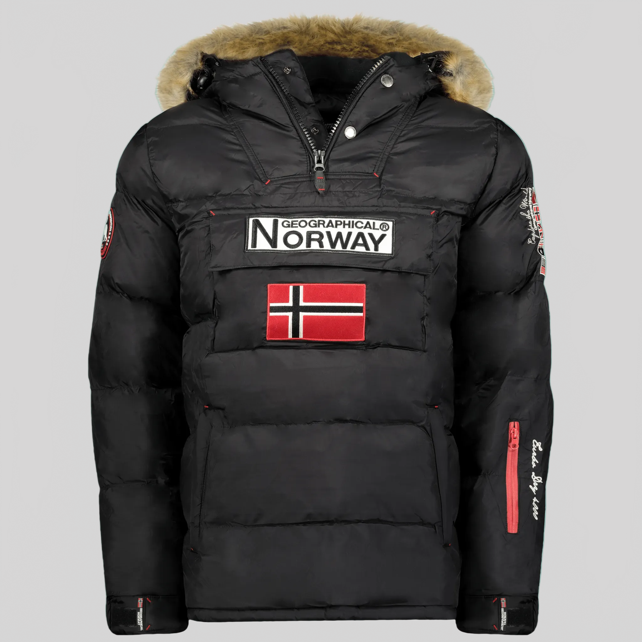 Discover Geographical Norway 's BILBOQUET Puffer jacket for men. It's quilted, with headband and half-zip opening. The hood is fixed, and the Puffer jacket features an embroidered, patch flap pocket on the middle front, as well as adjustable cuffs. There's embroidery on the sleeve and an elasticated drawcord at the bottom of the garment. It also has two zipped pockets on the front and a zipped opening on the side.
