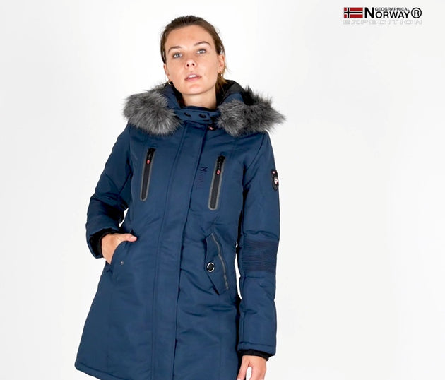Discover the Geographical Norway women's "CORALY" parka, a versatile and elegant piece. Its detachable hood withsynthetic faux fur, double front zipper and button opening, various pockets with snaps, embroidery on the chest and PVC badge on the sleeve add a touch of style and functionality to this parka.