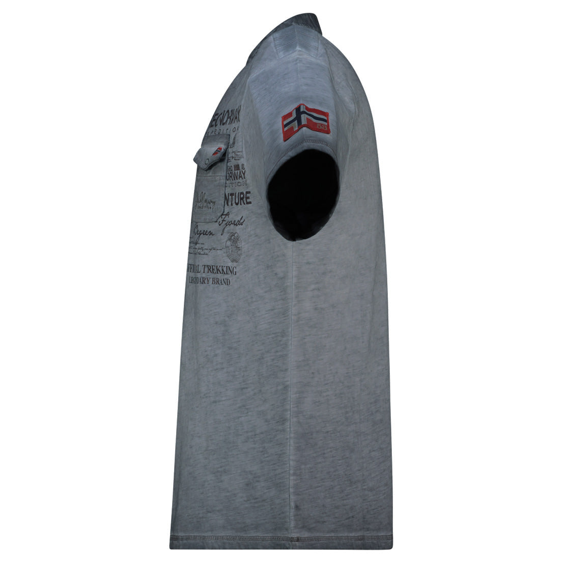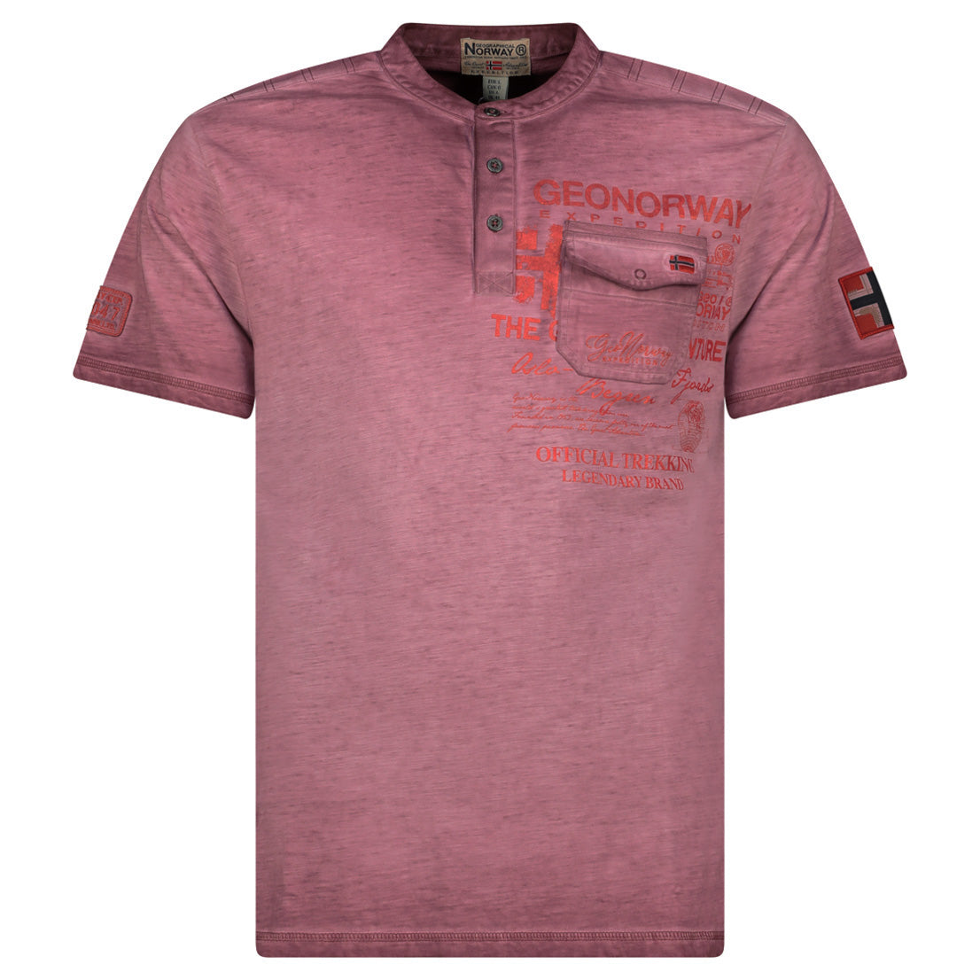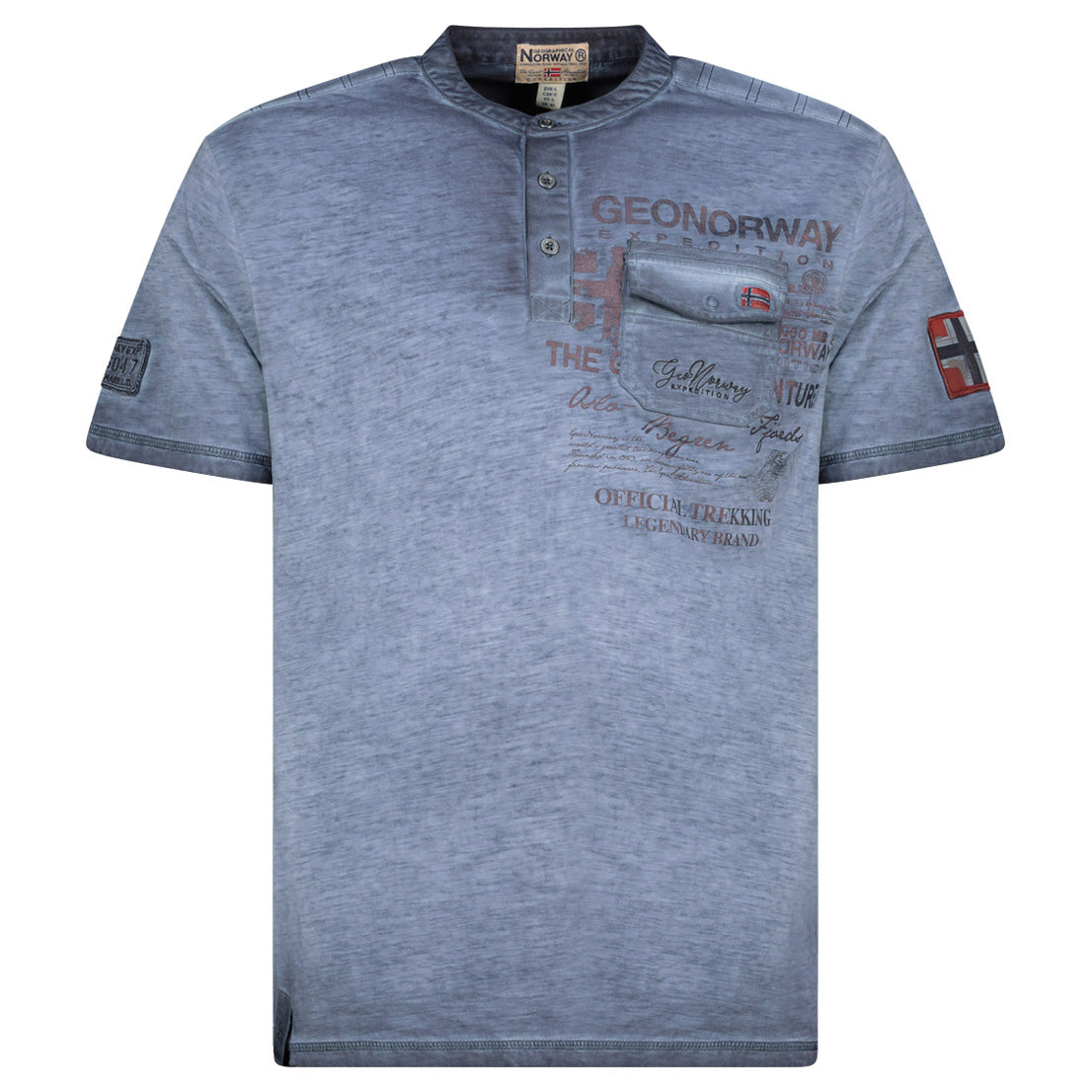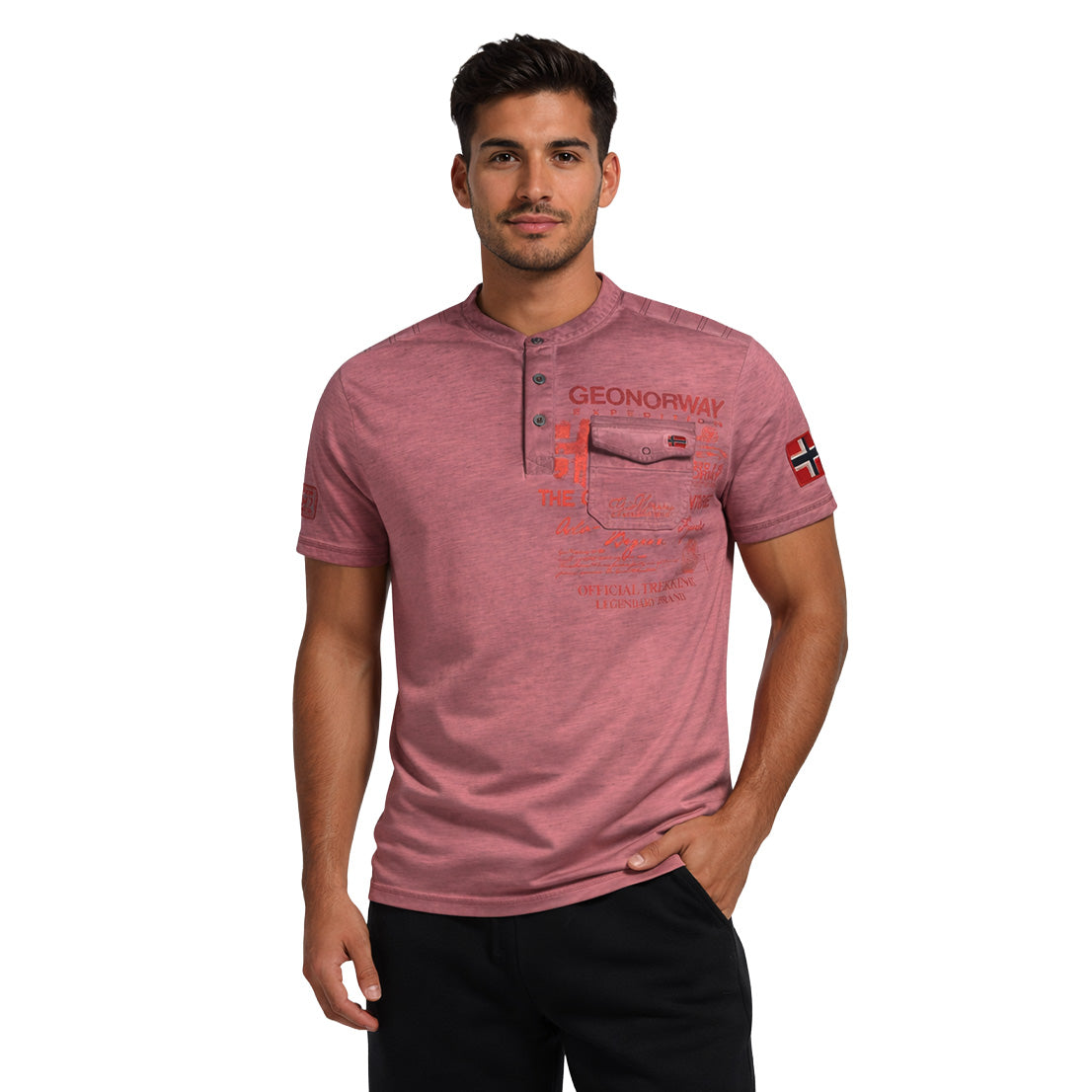 The Geographical Norway "Jeony Men" T-shirt Geographical Norway casual style with a touch of originality. Featuring short sleeves and a mandarin collar with button placket, it offers a modern, structured look. Its chest pocket with graphic prints adds character, while the flag on the sleeve highlights the brand's identity. Lightweight and comfortable thanks to its cotton composition, it is perfect for a neat and relaxed summer look.