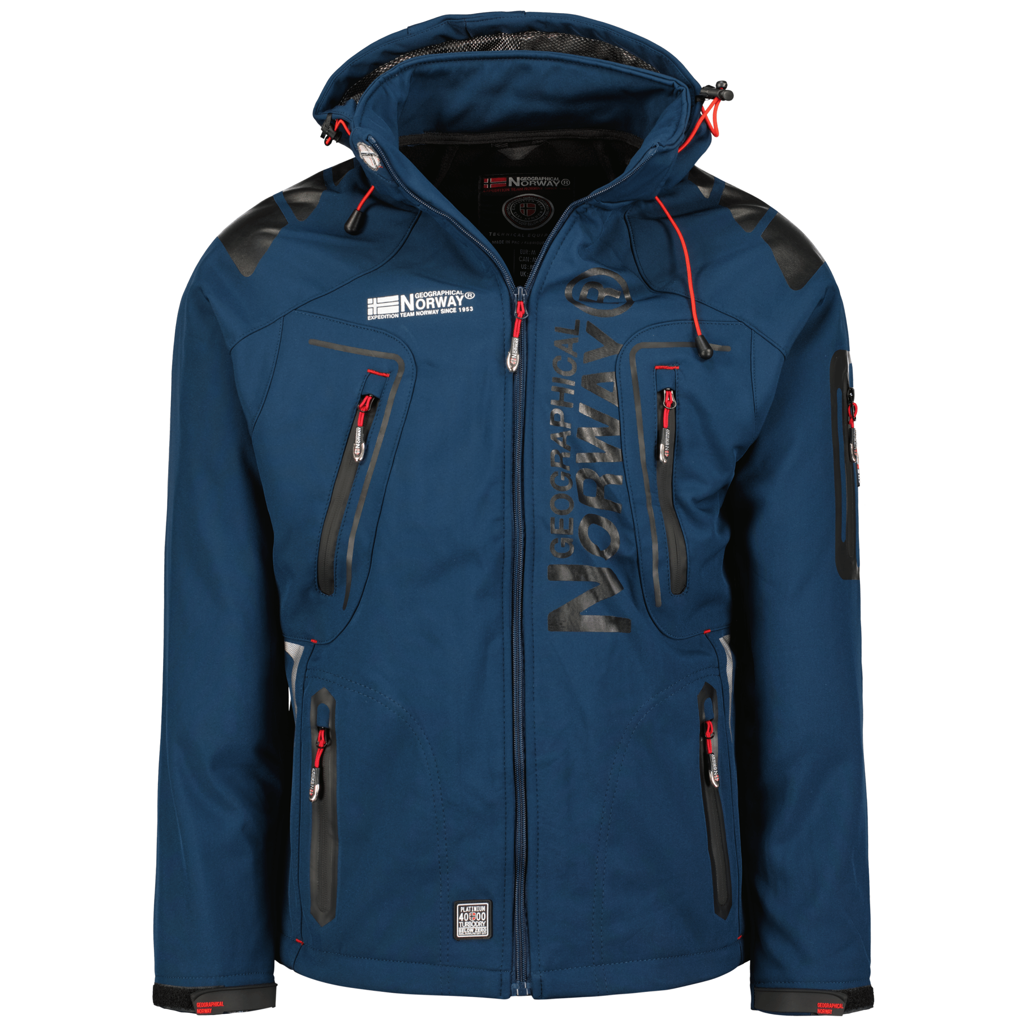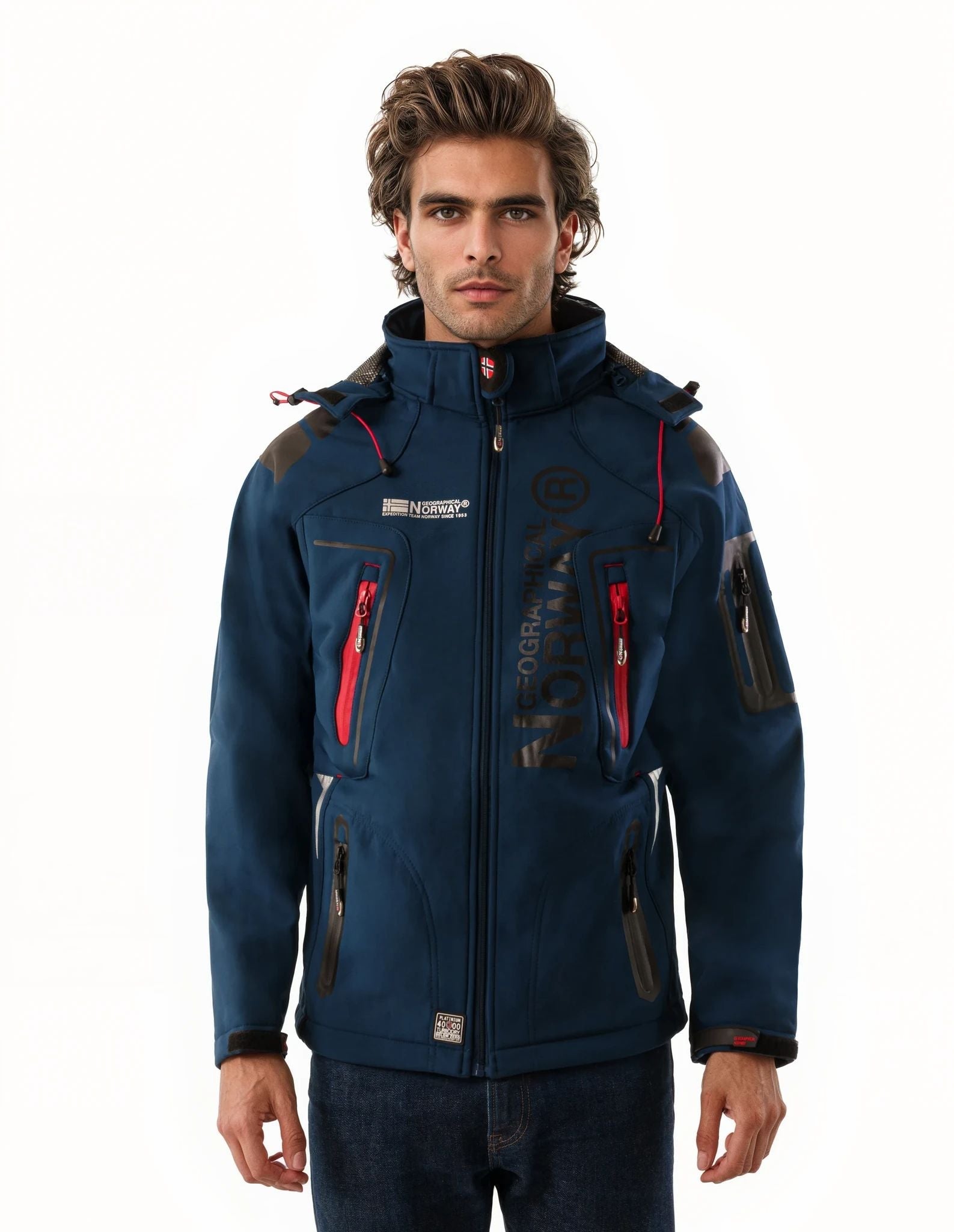 Discover Geographical Norway 's "Techno" softshell jacket for men. This iconic jacket features a detachable hood with tightening ties, injected zipped pockets, PVC tightening ties on the cuffs, a badge on the sleeve and various prints.
