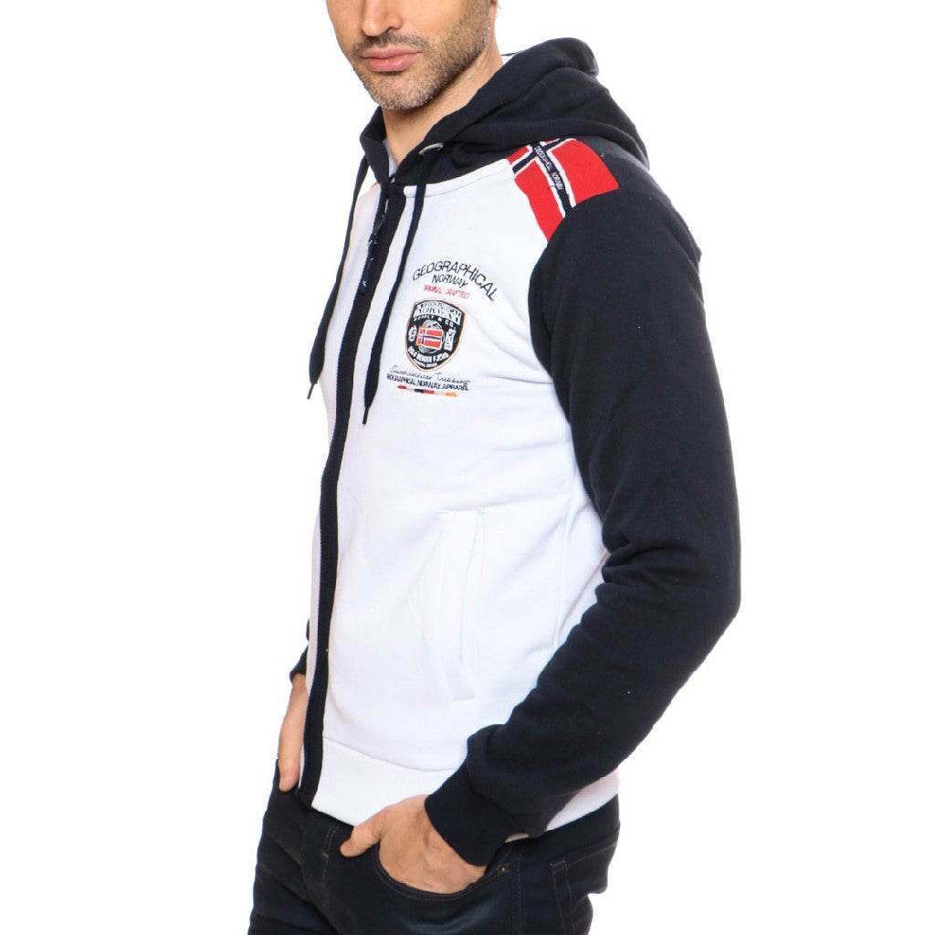 Discover Geographical Norway's "FINION" sweatshirt for men, a comfortable and modern garment. Featuring a hood, hood drawstrings and front zipper, with prints on the front, shareholders and hood, this sweatshirt offers casual, on-trend style.