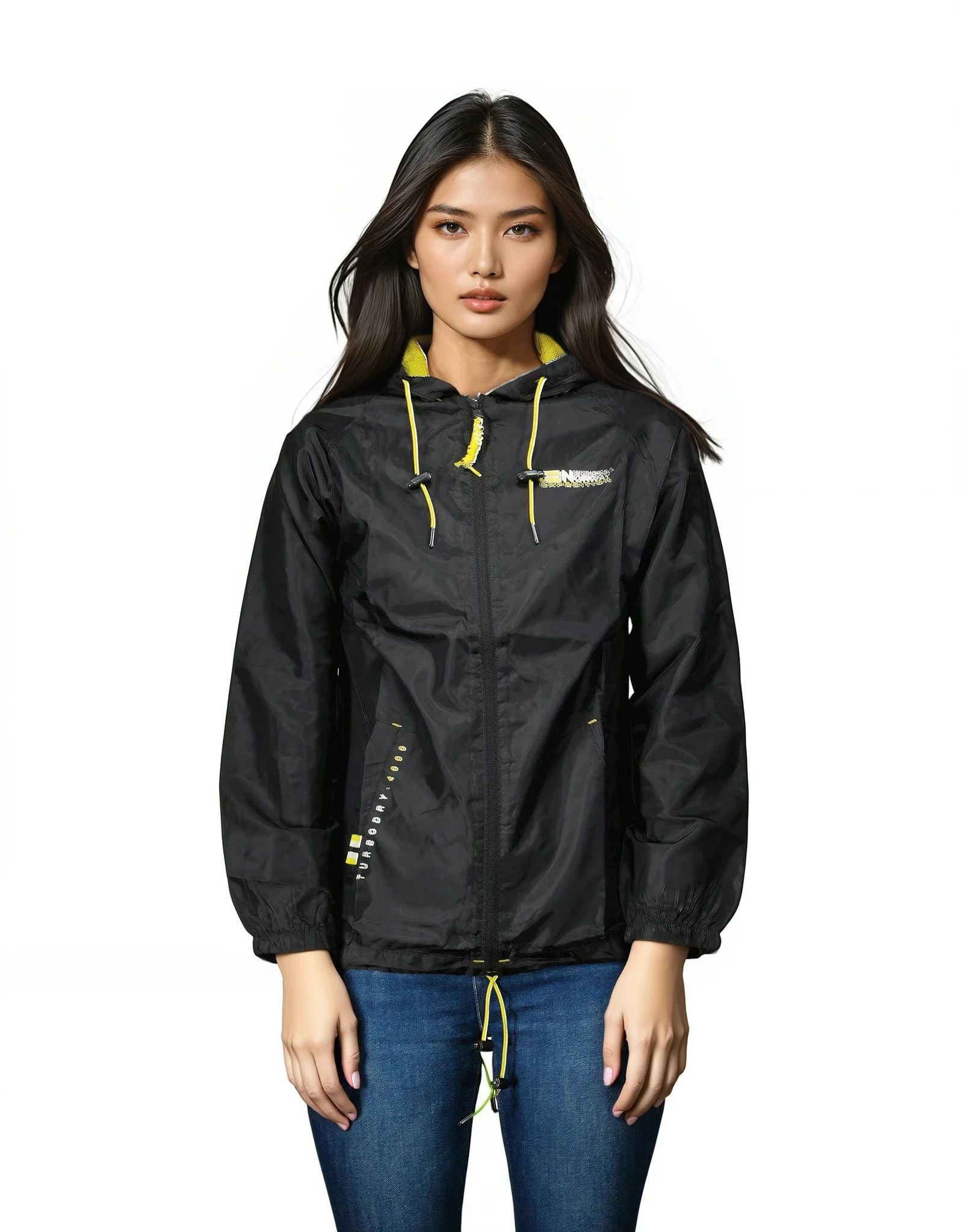 Discover Geographical Norway 's "BOAT" jacket for women, a functional and fashionable piece. Its windbreaker, mesh hood interior, prints on the chest and bottom of the garment, and printed storage bag add a touch of style and practicality to this jacket.