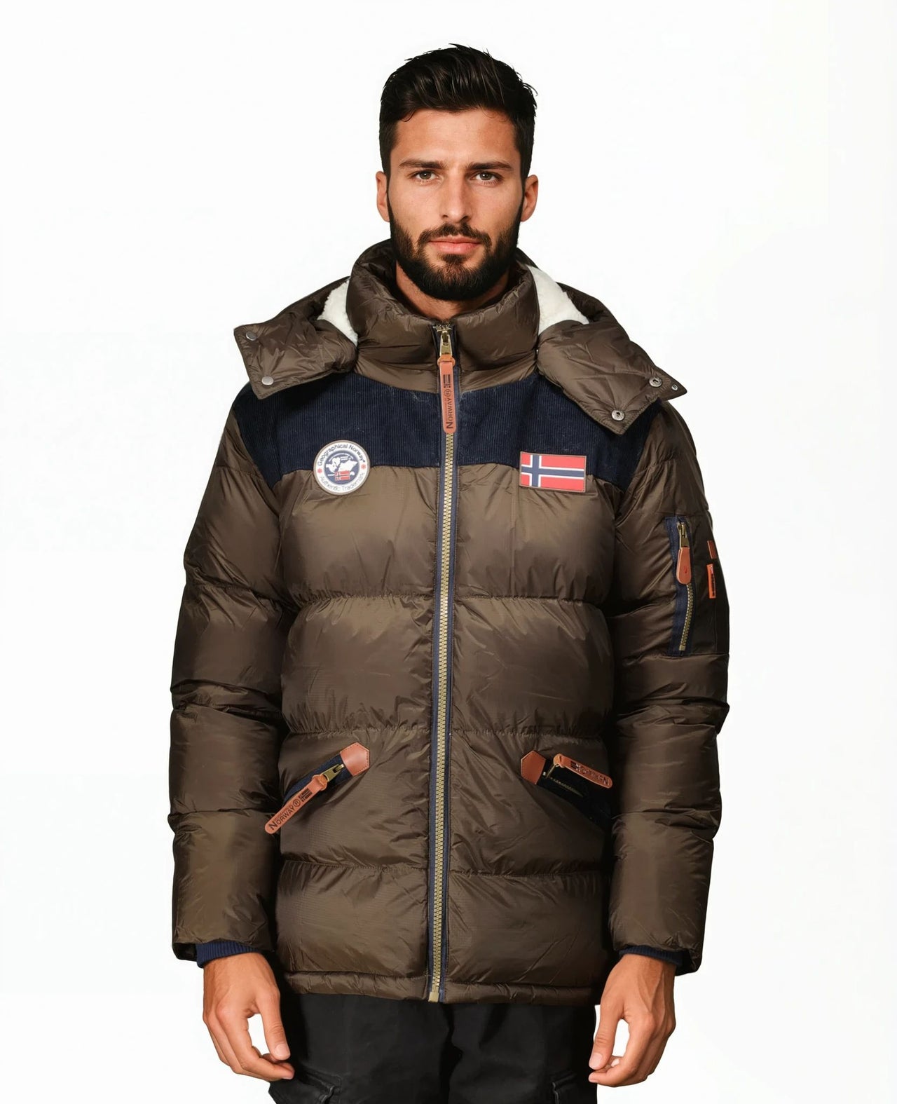 Discover Geographical Norway 's "CELIAN" quilted parka for men. This men's parka features a hood, zipper, side pockets and drawstrings. It also features an arm pocket.
