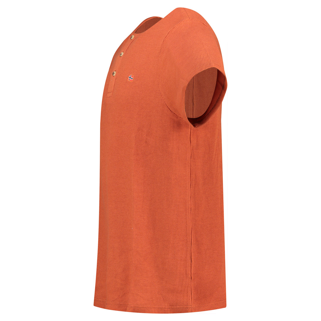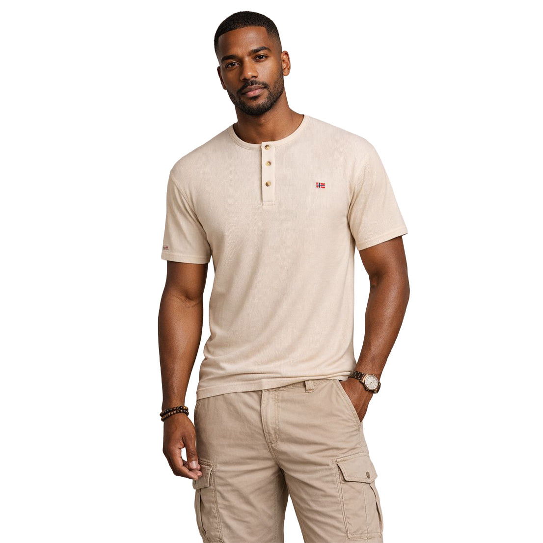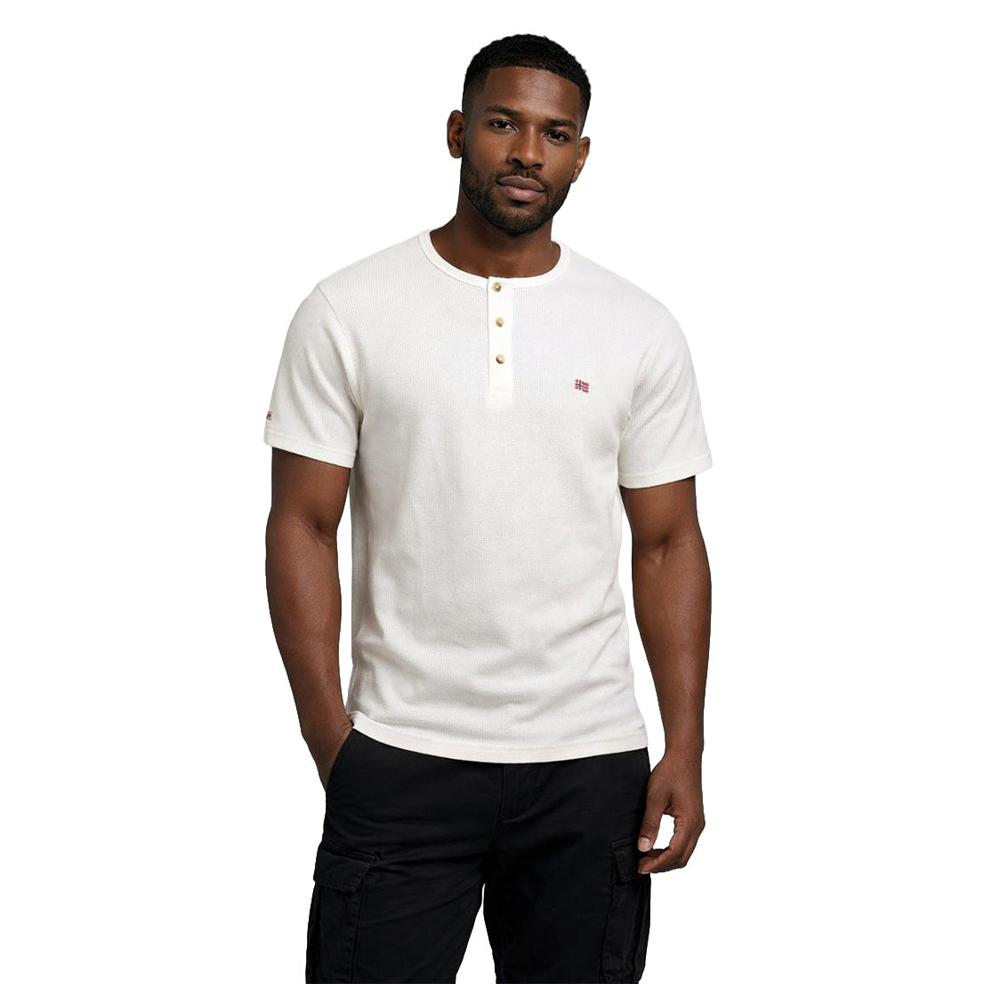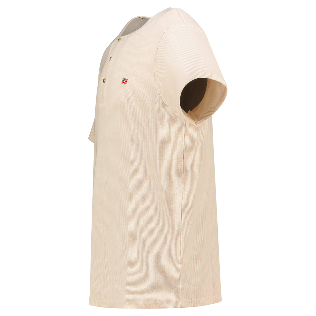 The Geographical Norway "Jwaffle Men" T-shirt Geographical Norway out thanks to its honeycomb fabric, which provides texture and breathability. Lightweight and comfortable, it features a round neckline with a three-button placket for a refined casual style. The flag on the chest adds a discreet and modern signature touch. Ideal for a relaxed and polished look in any season.