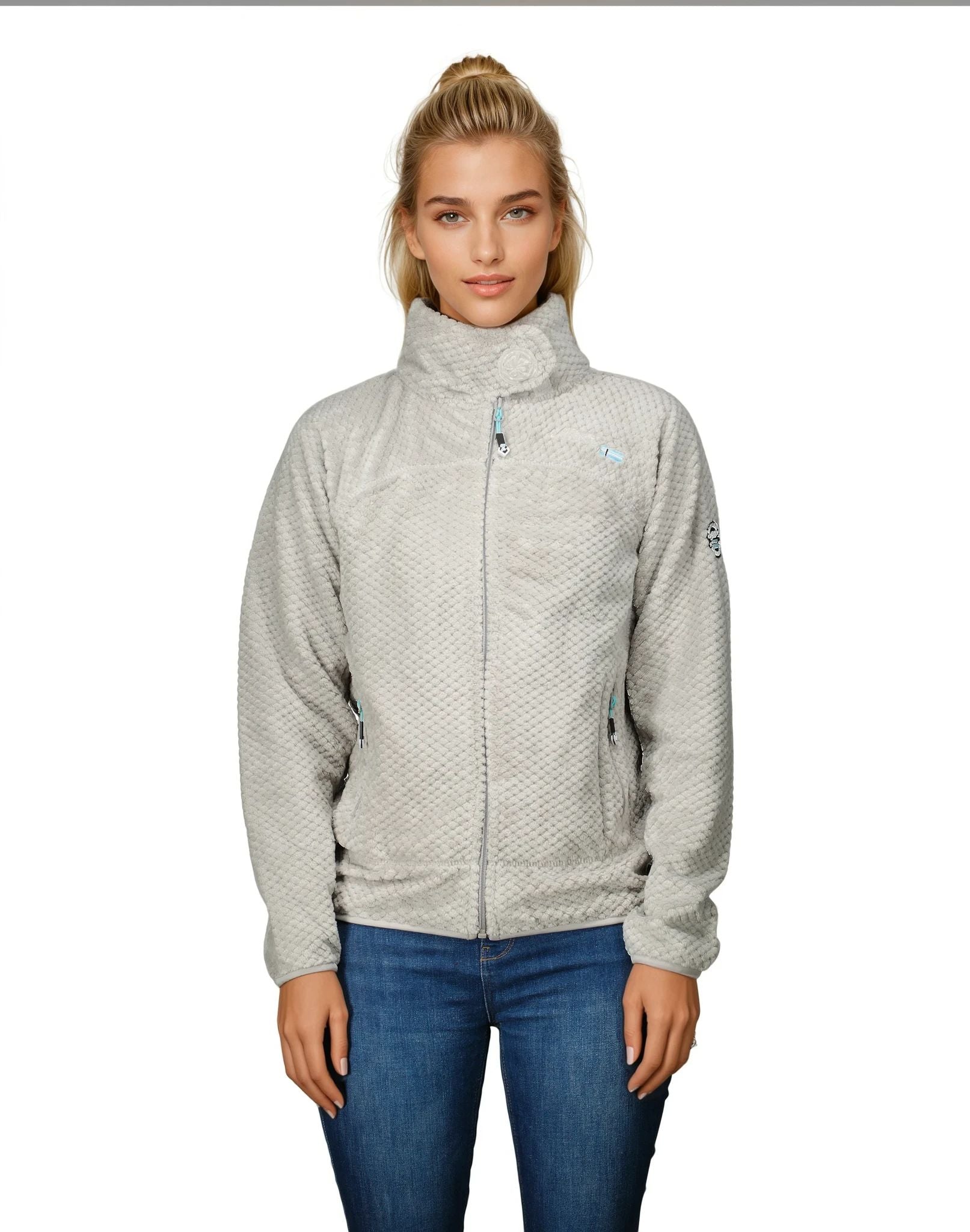 Discover the "Tropezienne" women's zipped fleece from Geographical Norway. This soft fleece has a pleasant feel, a velcro collar, 2 zipped pockets, plastic prints on the collar, chest and lower sleeve, embroidery on the chest and a PVC badge on the left sleeve.