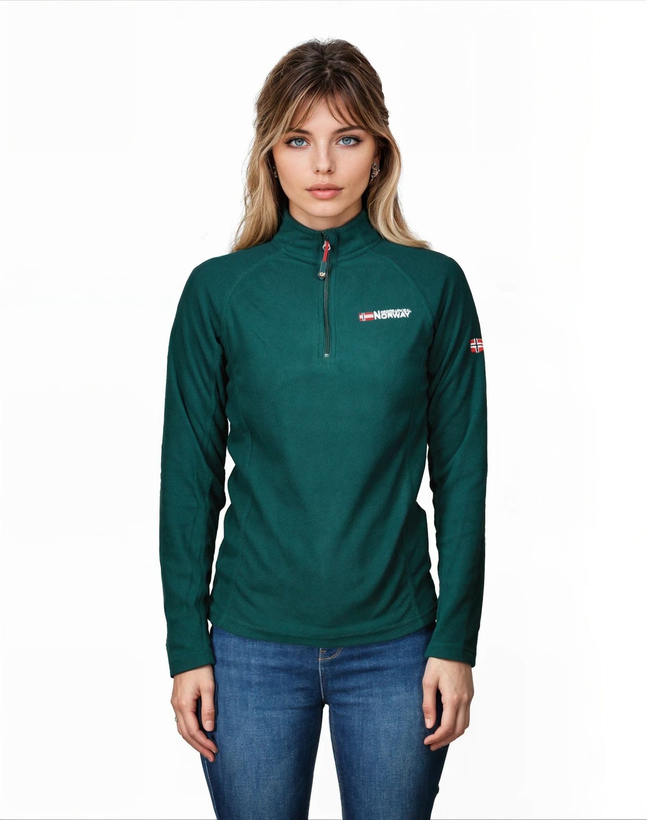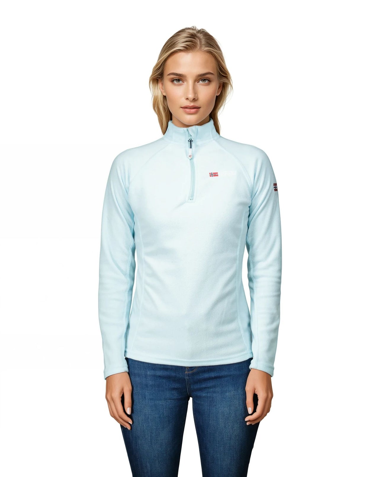 Discover the "Tug" women's micro-fleece from Geographical Norway. This elegant fleece features raglan sleeves, embroidery on the chest, a zipped opening on the middle front and is sold folded and wrapped around decorative paper.