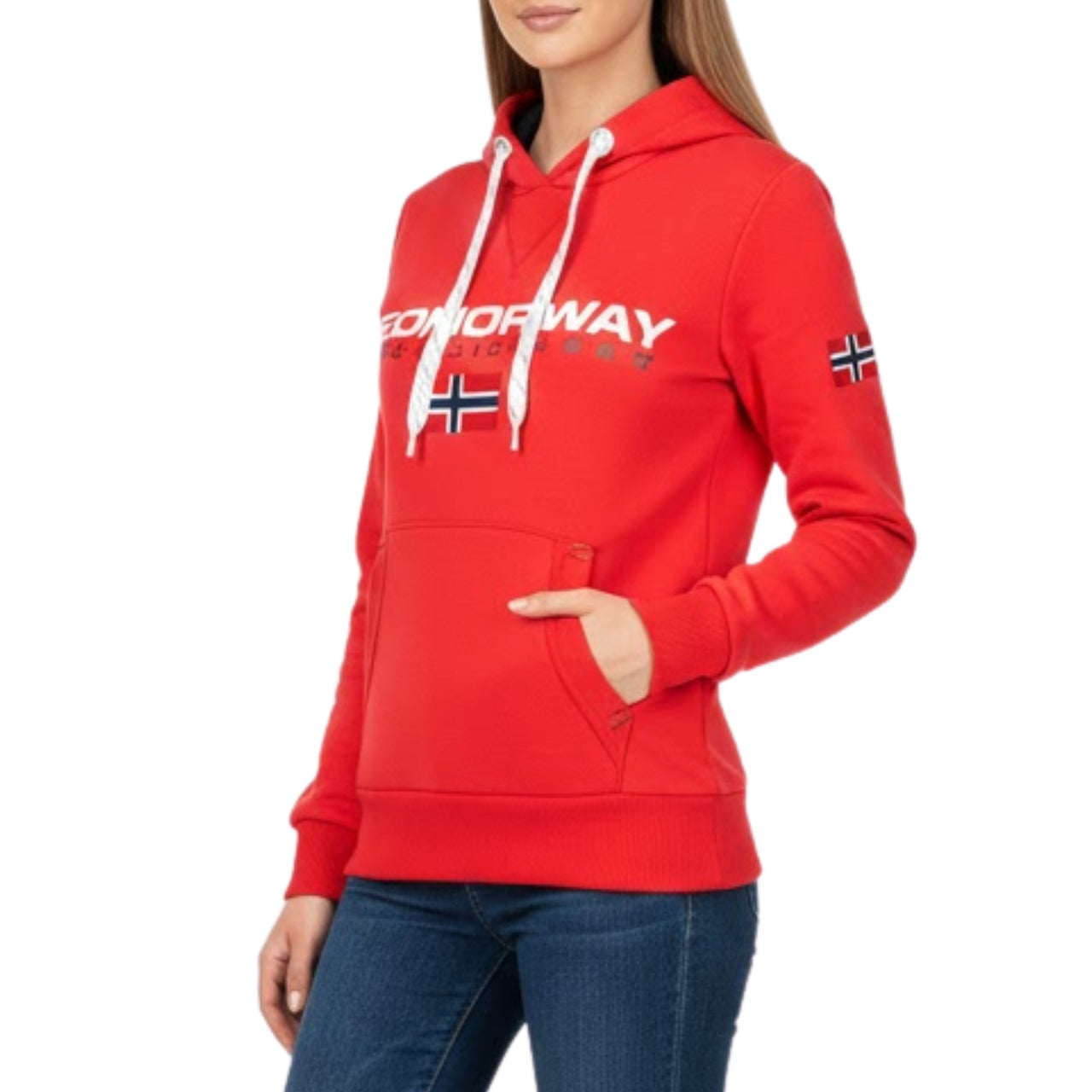 Descubre la sudadera "Goliver" para mujer de Geographical Norway, una prenda cómoda y con estilo. Con capucha sin cordones, estampados en la parte delantera, bolsillos tipo canguro en los laterales, bandera en la parte delantera y en el brazo, esta sudadera ofrece un estilo moderno y casual.