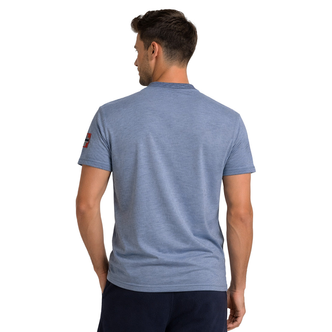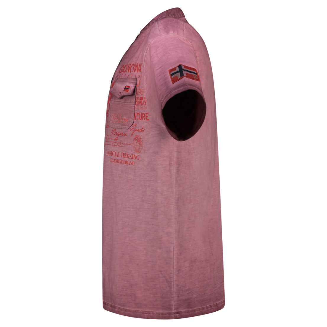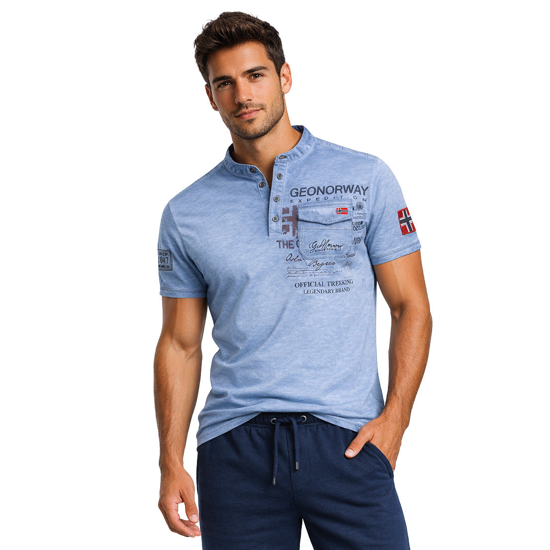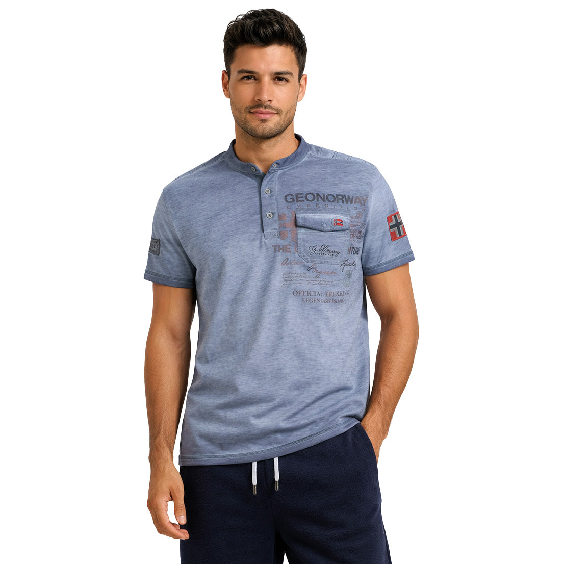 La camiseta «Jeony Men» de Geographical Norway el estilo informal con un toque de originalidad. Con mangas cortas y cuello mao con tapeta abotonada, ofrece un look moderno y estructurado. Su bolsillo en el pecho con estampados gráficos le aporta carácter, mientras que la bandera en la manga destaca la identidad de la marca. Ligera y cómoda gracias a su composición de algodón, es perfecta para un look veraniego cuidado y desenfadado.