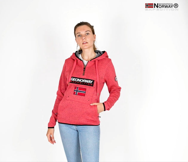 Echa un vistazo a la sudadera con capucha "Upclassica" de Geographical Norway para mujer. Esta sudadera con cuello de cremallera tiene puños de forro polar acanalado, un bolsillo de parche en el pecho con bordado, un bolsillo canguro en la parte delantera y elegantes bordados en las mangas.