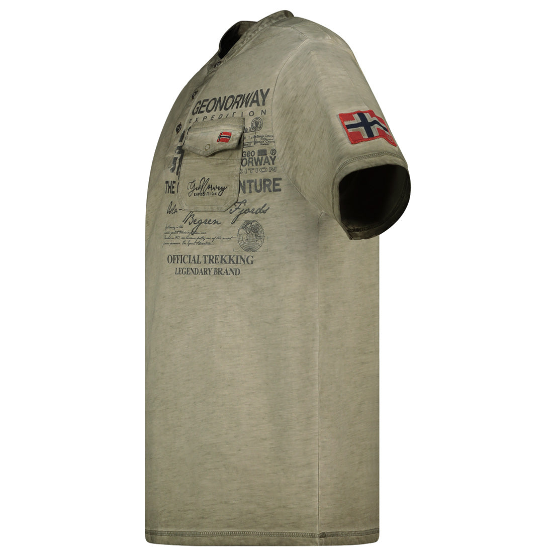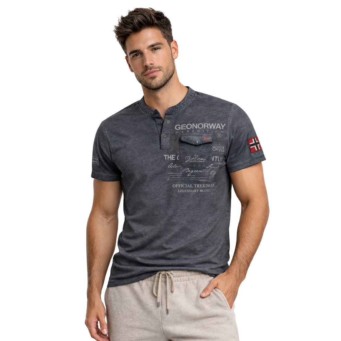 La camiseta «Jeony Men» de Geographical Norway el estilo informal con un toque de originalidad. Con mangas cortas y cuello mao con tapeta abotonada, ofrece un look moderno y estructurado. Su bolsillo en el pecho con estampados gráficos le aporta carácter, mientras que la bandera en la manga destaca la identidad de la marca. Ligera y cómoda gracias a su composición de algodón, es perfecta para un look veraniego cuidado y desenfadado.