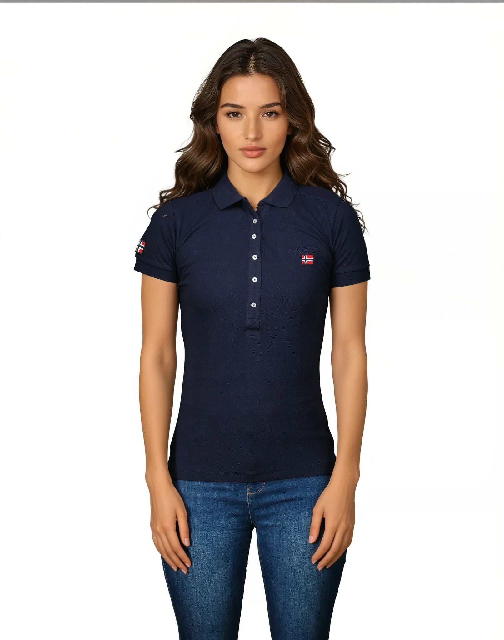 Echa un vistazo al polo Kelly para mujer de Geographical Norway, una prenda elegante a la par que informal. Con su cuello abotonado, insignia distintiva en el pecho y bandera en la manga, este polo ofrece un estilo moderno y cómodo.