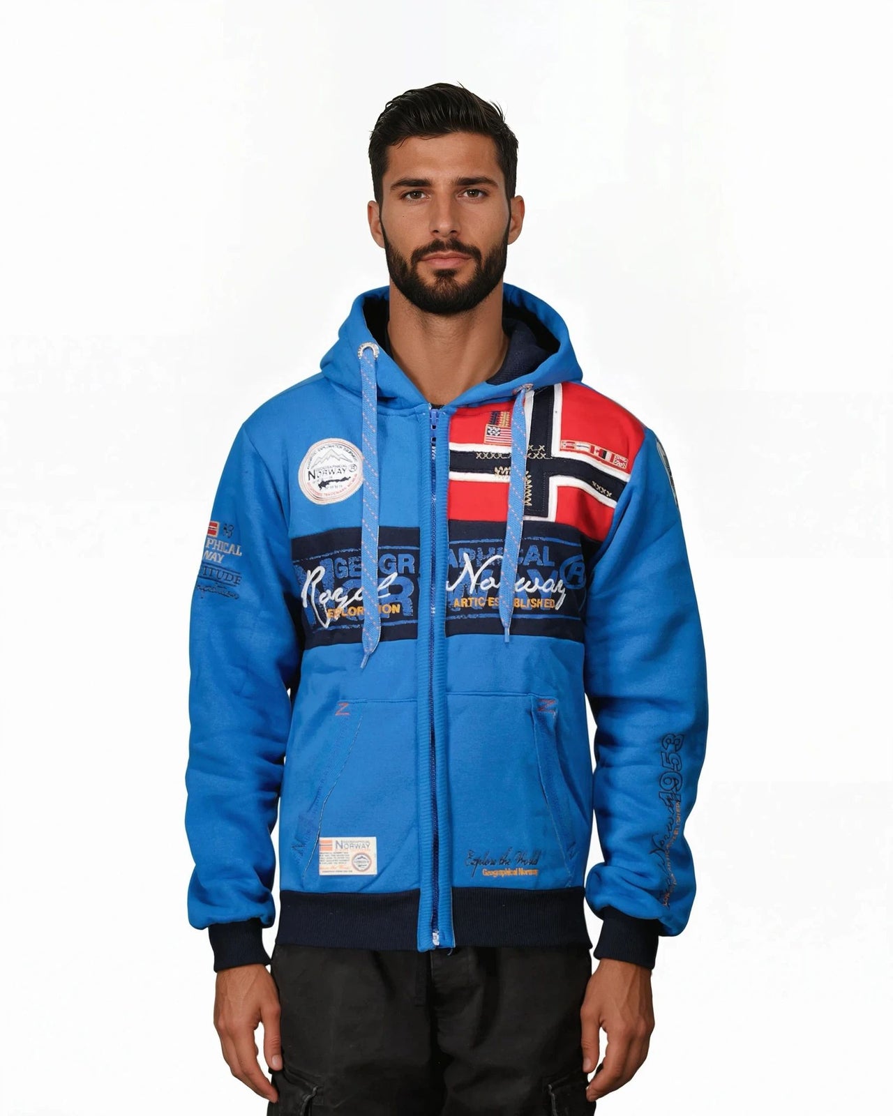 Scoprite la felpa con zip Geographical Norway "FLYER" da uomo, un capo comodo e di tendenza. I polsini a coste sul fondo delle maniche e sul corpo, così come i numerosi stemmi, il logo Geographical Norway, i ricami e le stampe sul petto, sulla schiena e sulle maniche, ispirati al tema norvegese, aggiungono un tocco distintivo e di stile a questa felpa.