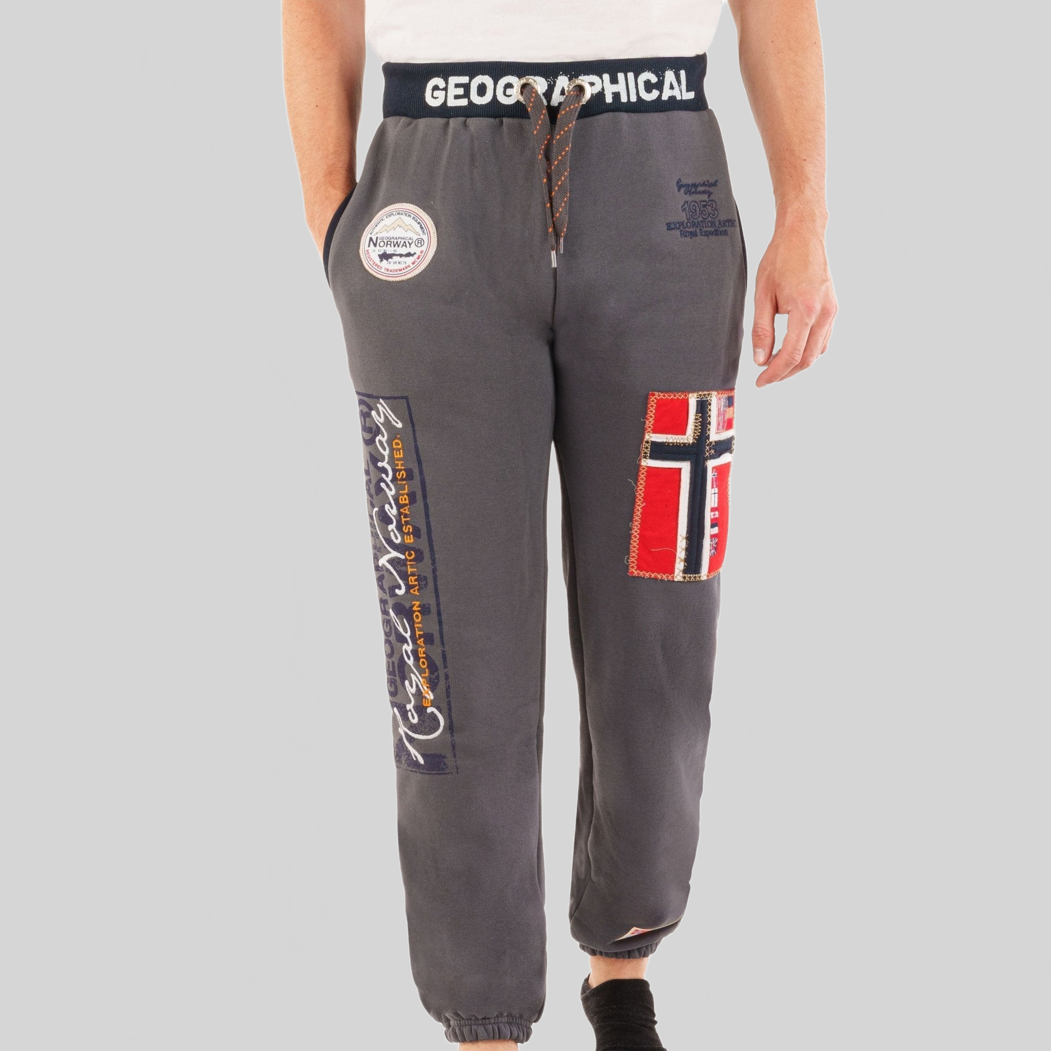 Scoprite i pantaloni da jogging da uomo "Myer" di Geographical Norway, un capo comodo ed elegante. Con l'orlo elasticizzato e i numerosi stemmi, ricami e stampe sulle gambe, questi pantaloni aggiungono un tocco distintivo al vostro outfit a tema norvegese.