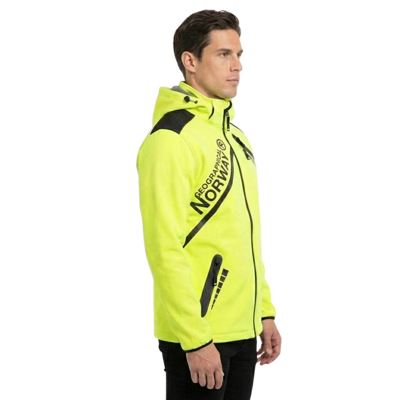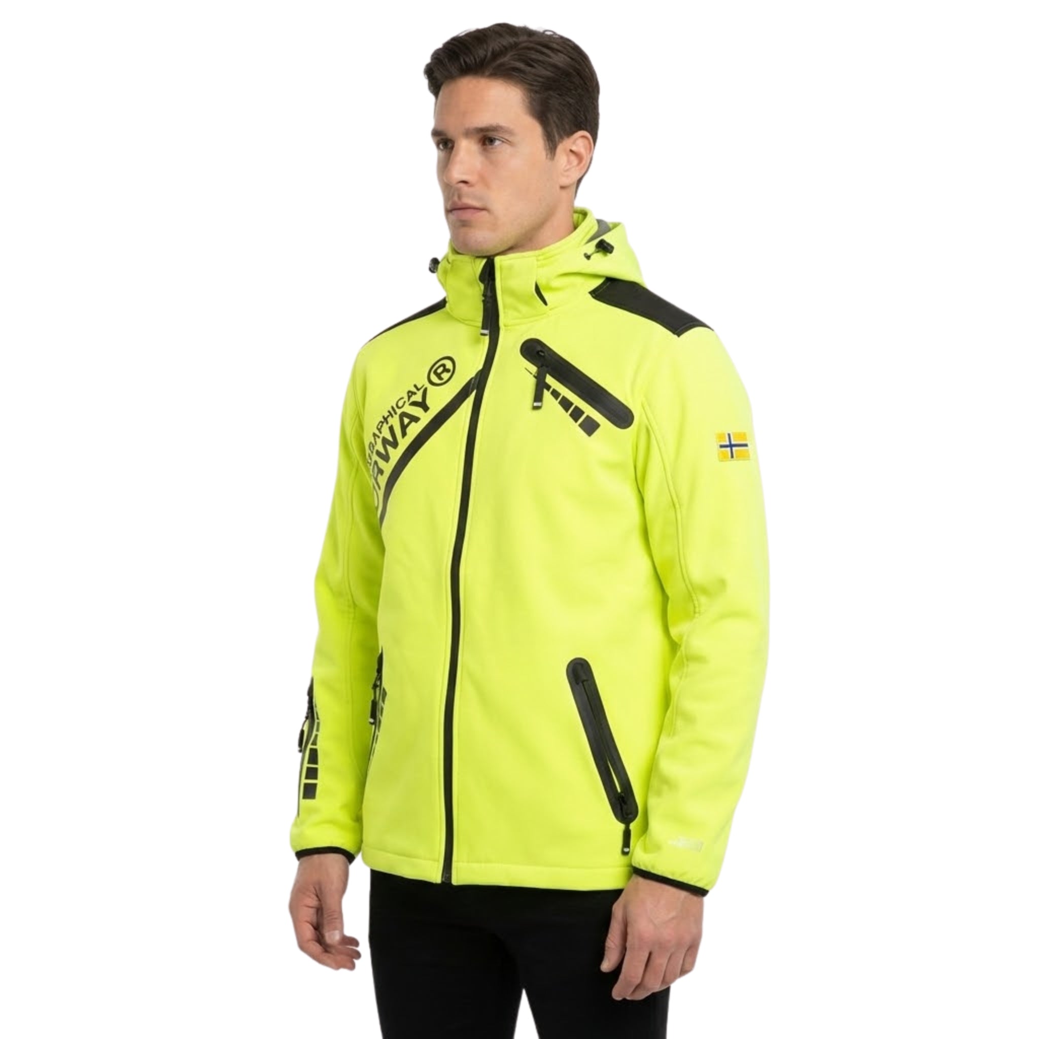 La giacca softshell Geographical Norway Norway da uomo Twopac è funzionale ed elegante, perfetta sia per le attività all'aperto che per quelle quotidiane. Dotata di cappuccio protettivo, presenta un'apertura con zip, due tasche laterali, una tasca sul petto e una sulla manica. Le stampe grafiche sulle maniche, sulla schiena e sul petto aggiungono un tocco moderno e sportivo. Comodo e resistente, questo softshell è un pratico alleato in ogni stagione.