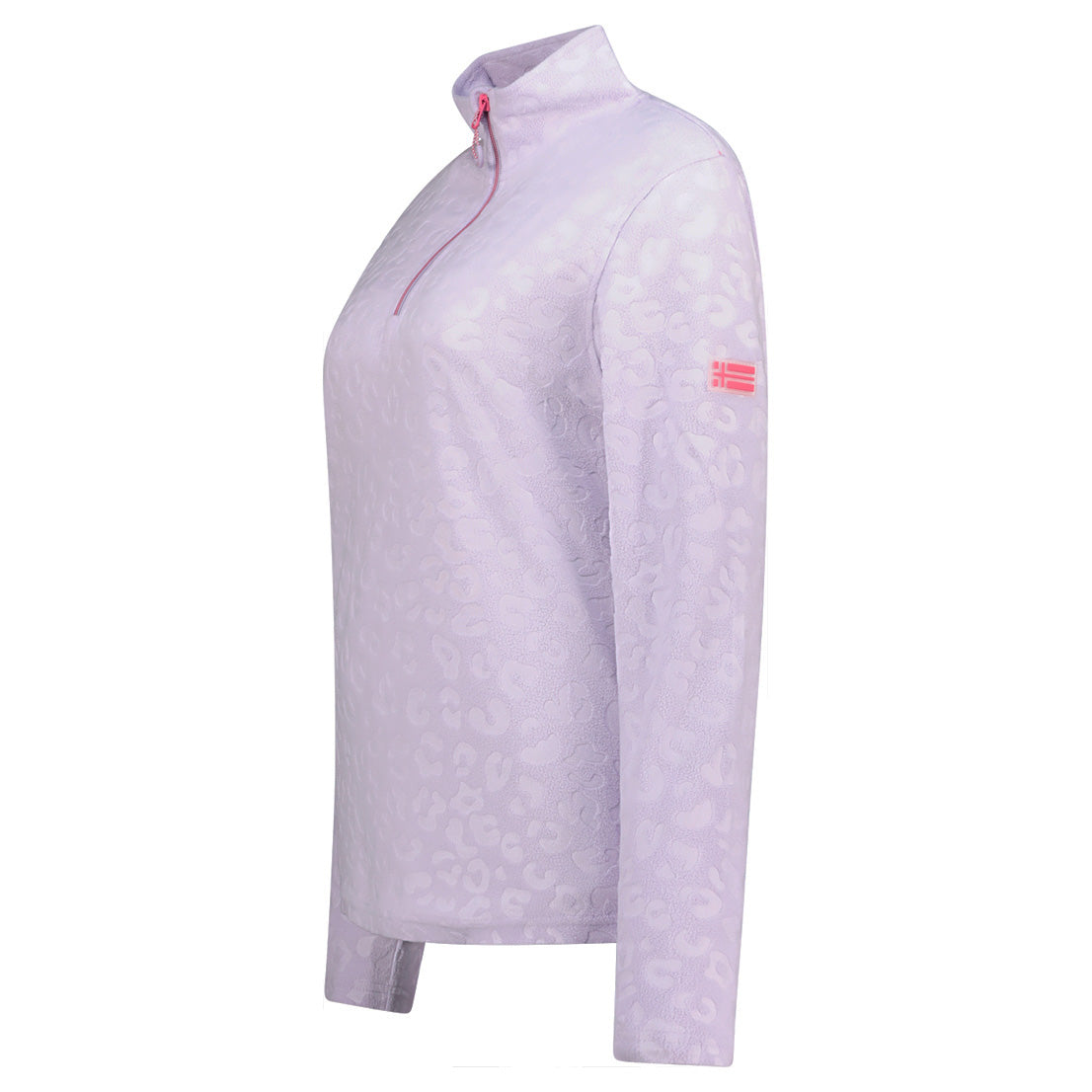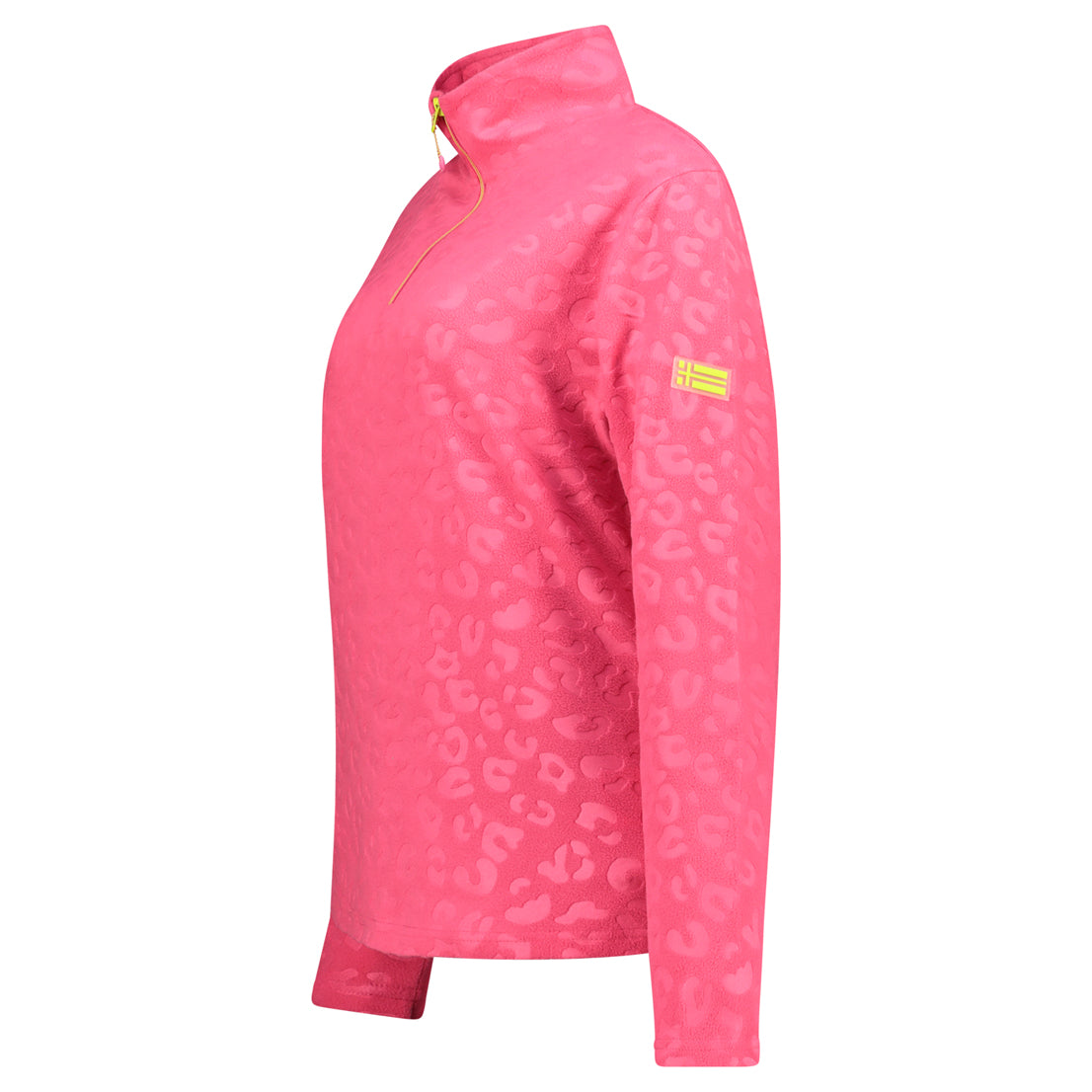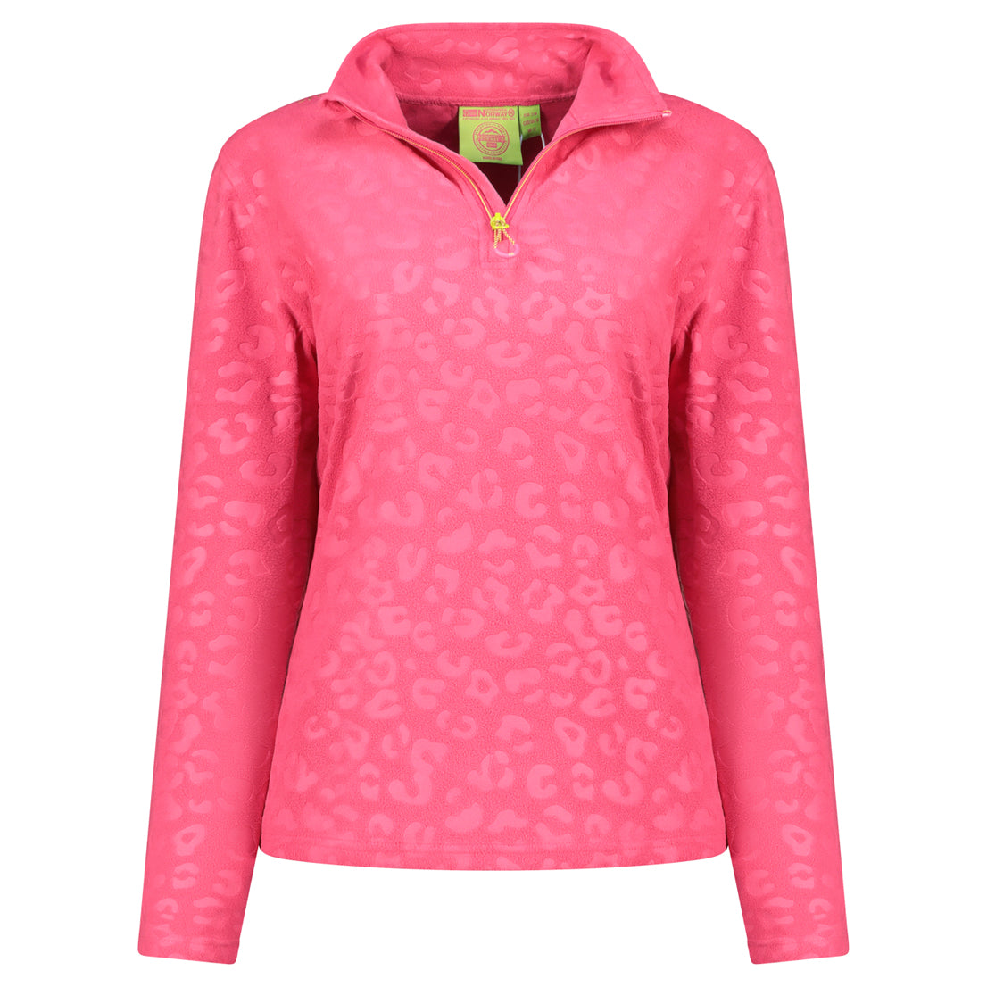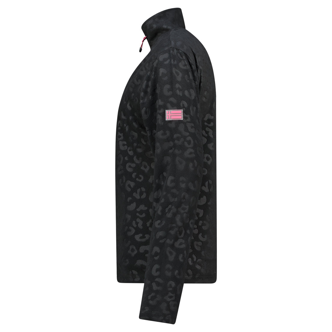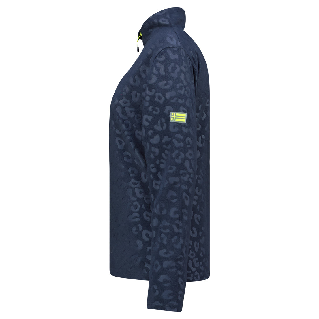 Il pile UMINIE da donna con collo alto e motivo leopardato goffrato offre comfort e stile. La chiusura con zip iniettata, le tasche laterali e il badge sulla manica lo rendono un capo originale e pratico.
