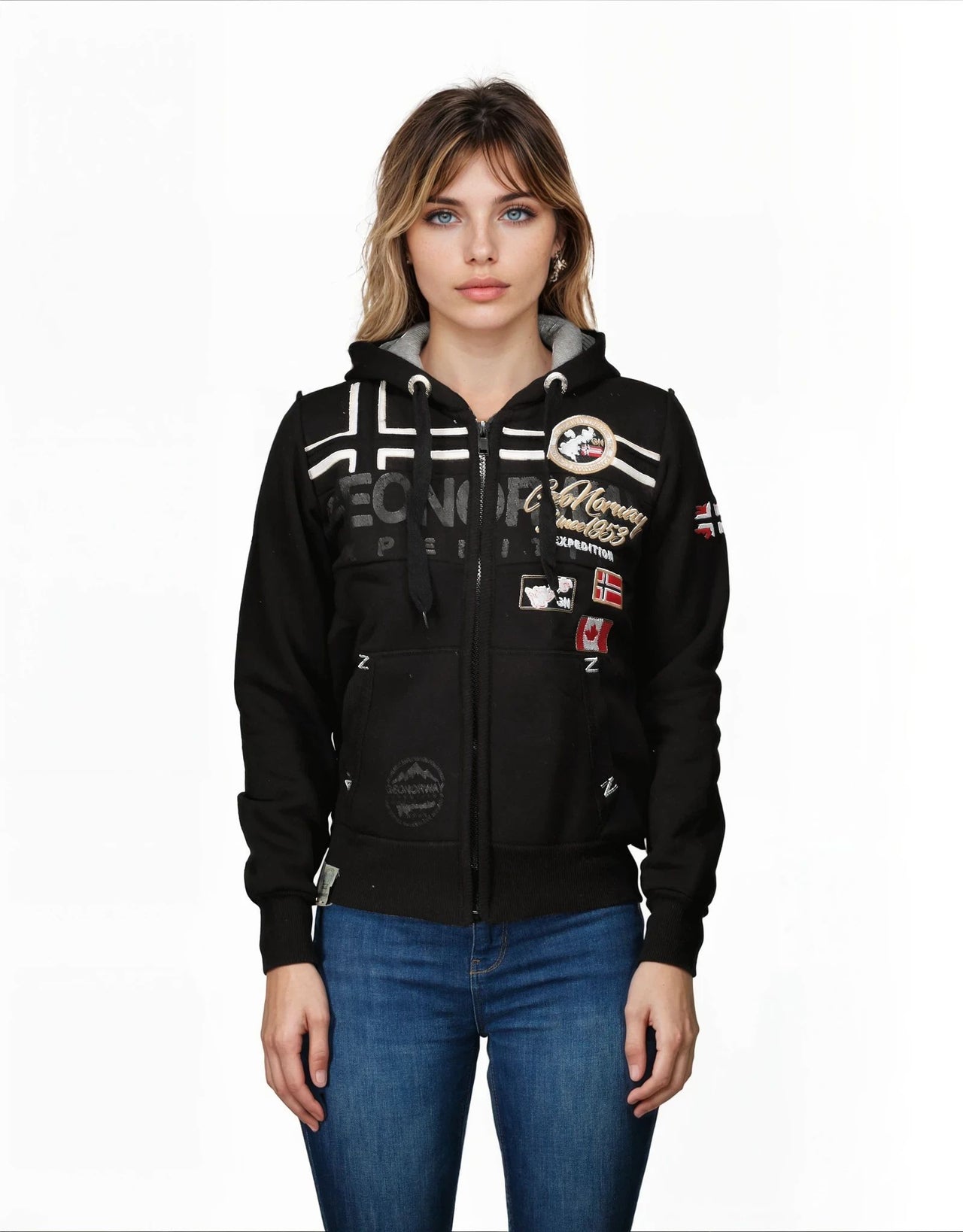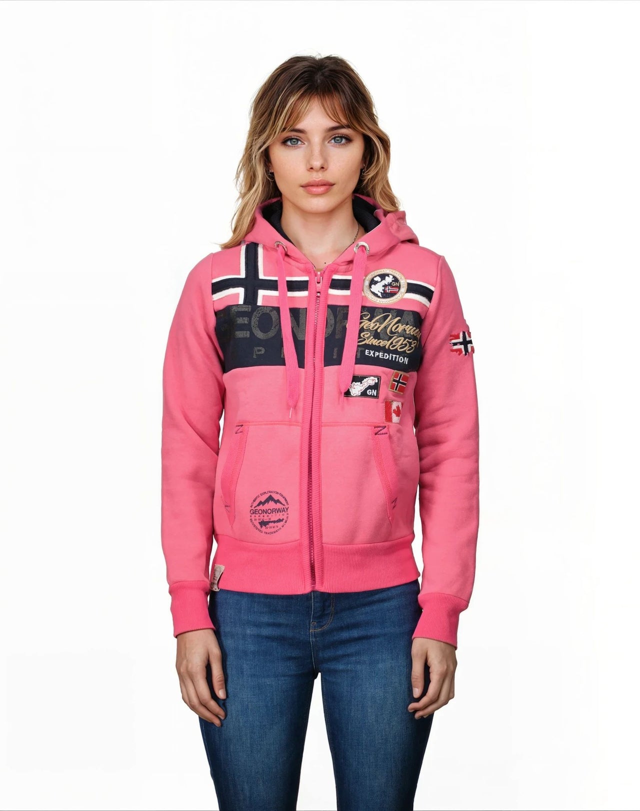 Scoprite la felpa con cappuccio Geographical Norway da donna "GARADOCK", un capo comodo e di tendenza. L'apertura centrale con zip e le stampe e i ricami sul davanti e sulle maniche aggiungono un tocco distintivo e di stile a questa felpa.