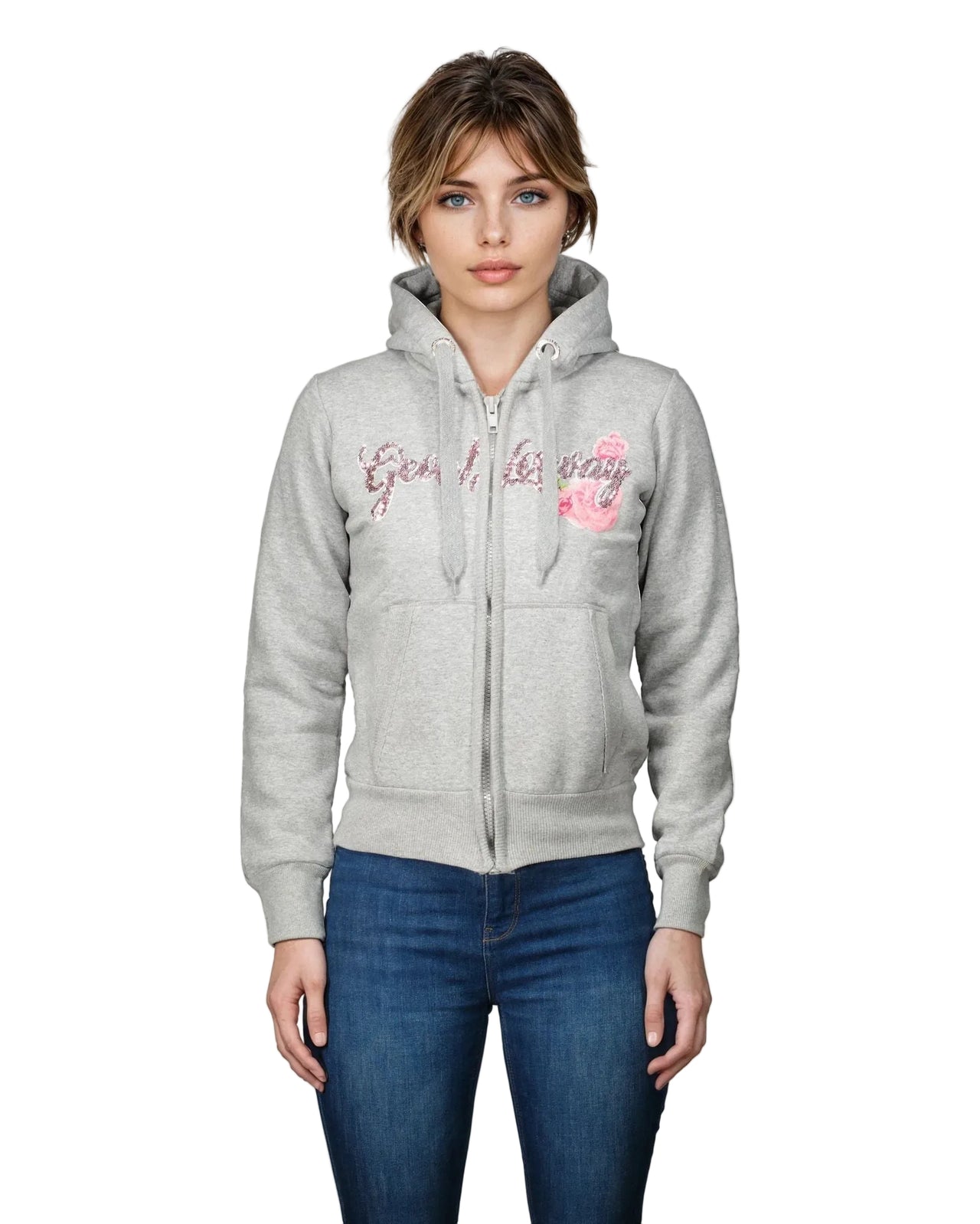 Scoprite la felpa con cappuccio "Gelphine" da donna di Geographical Norway , un capo comodo e di tendenza. L'apertura centrale con zip, le tasche anteriori e la stampa e il ricamo sul petto aggiungono un tocco distintivo e di stile a questa felpa.
