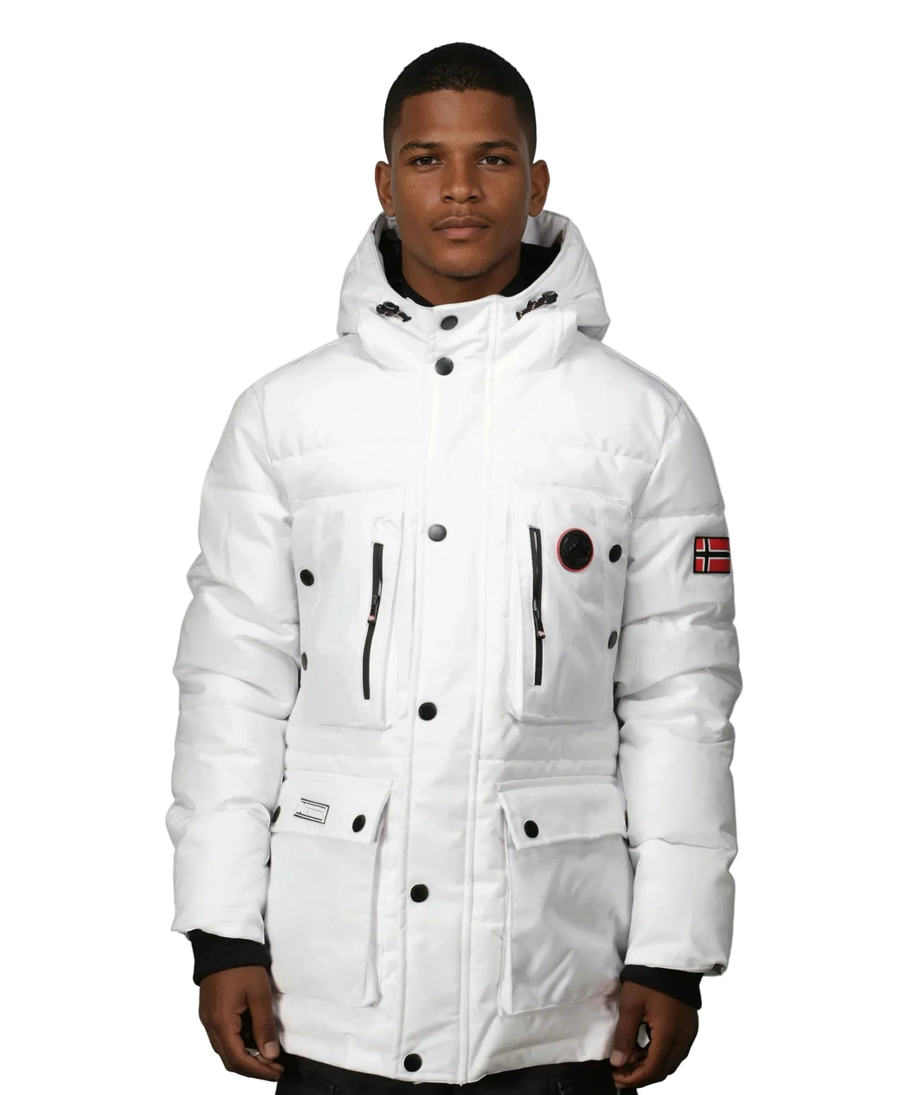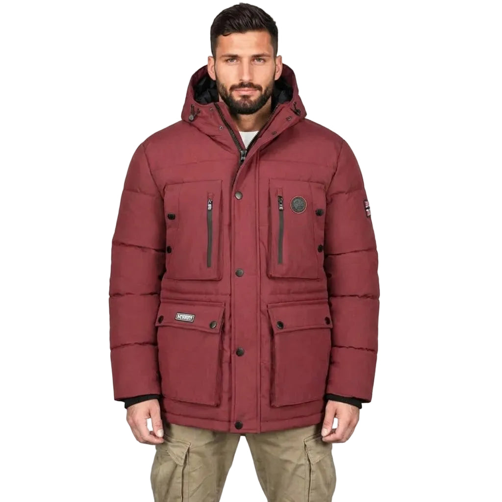 Scoprite il parka "ALBERT" da uomo di Geographical Norway, un capo versatile dotato di chiusura a zip, bottoni a pressione, cappuccio regolabile e tasche multiple per uno stile urbano e funzionale.