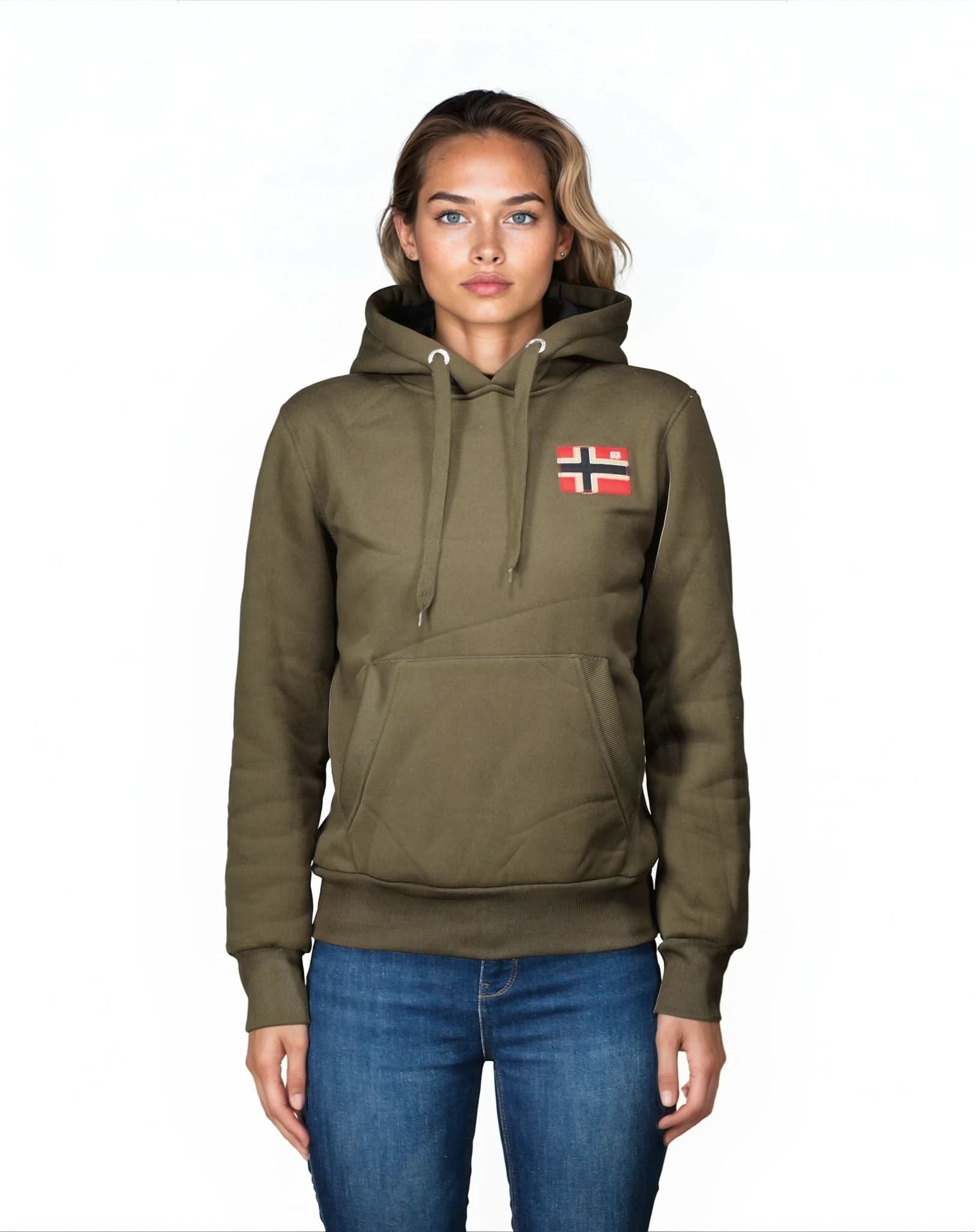 Scoprite la felpa "Genifer" da donna di Geographical Norway . Questa felpa da donna è dotata di cappuccio e di una caratteristica stampa sul petto, che aggiunge un tocco di stile moderno al vostro abbigliamento.